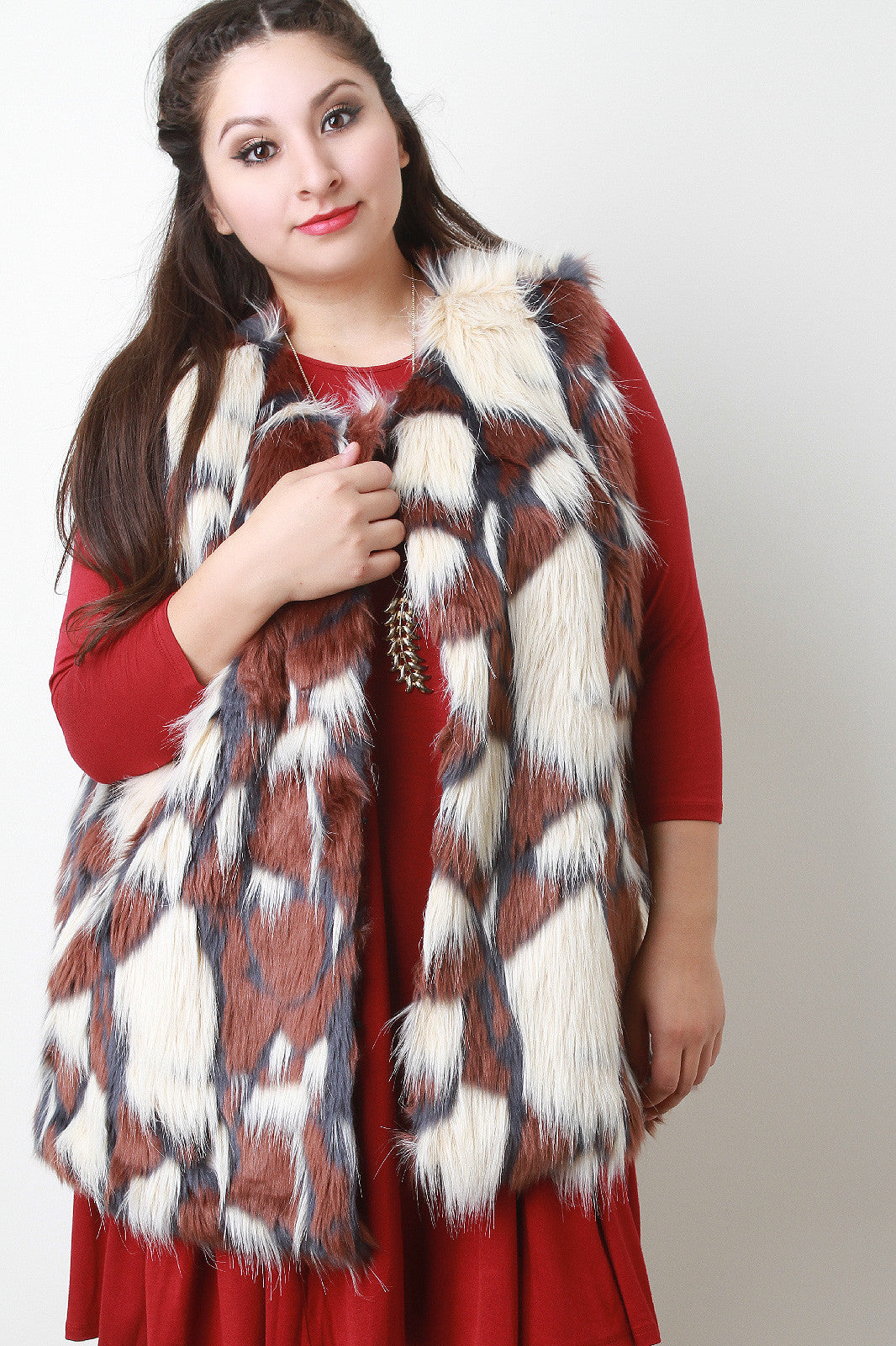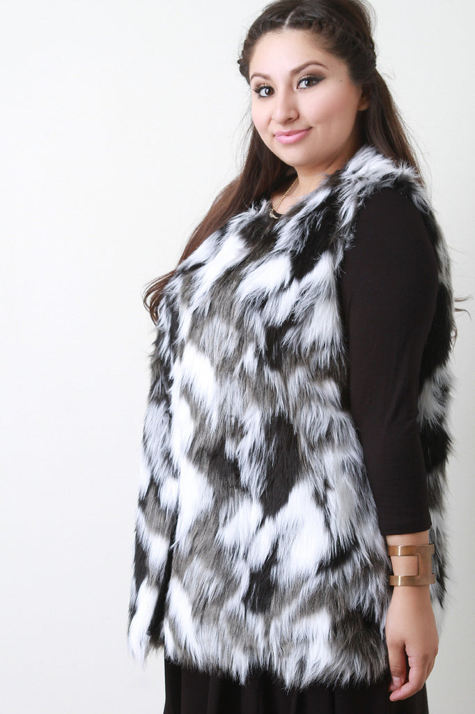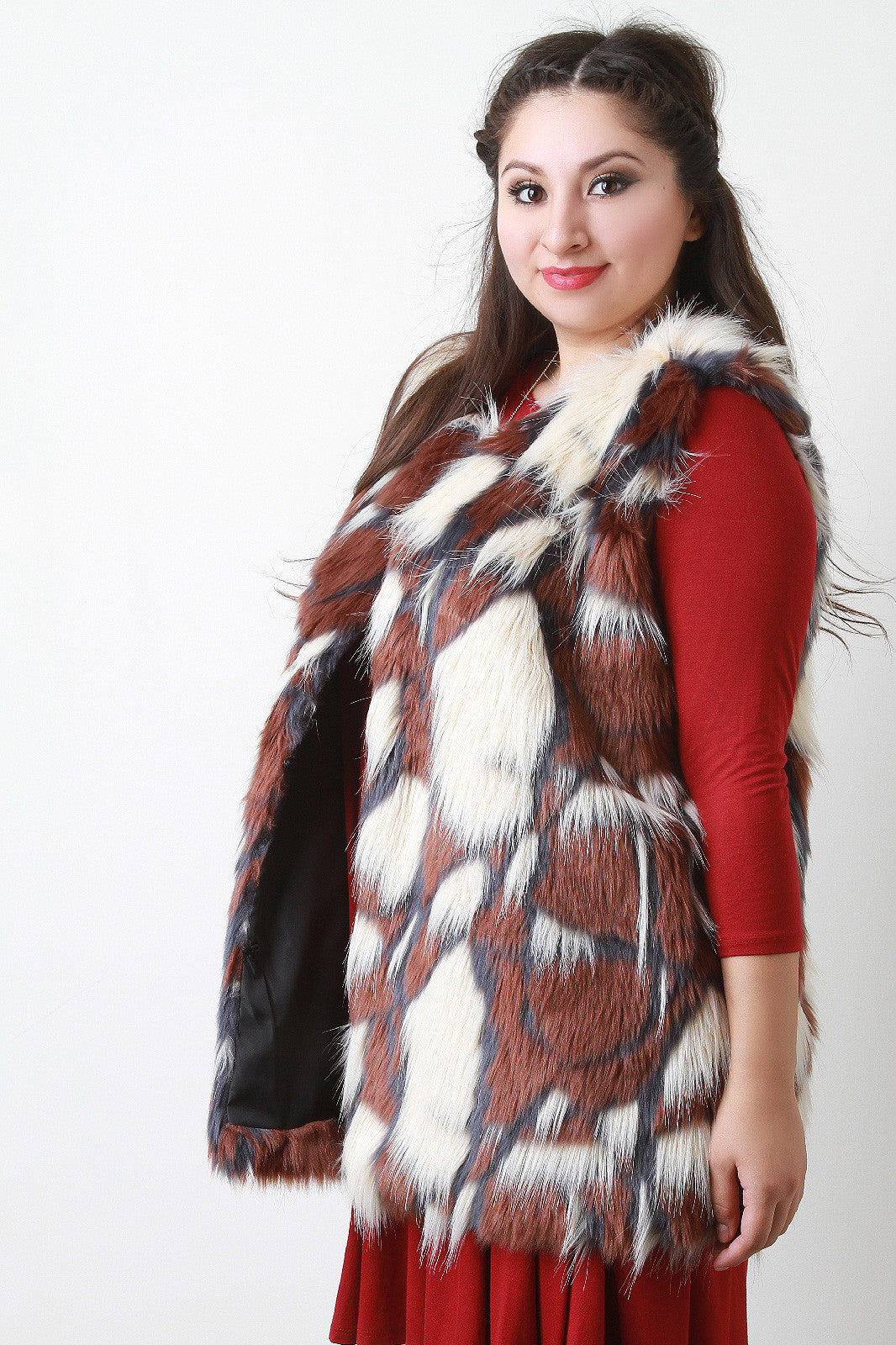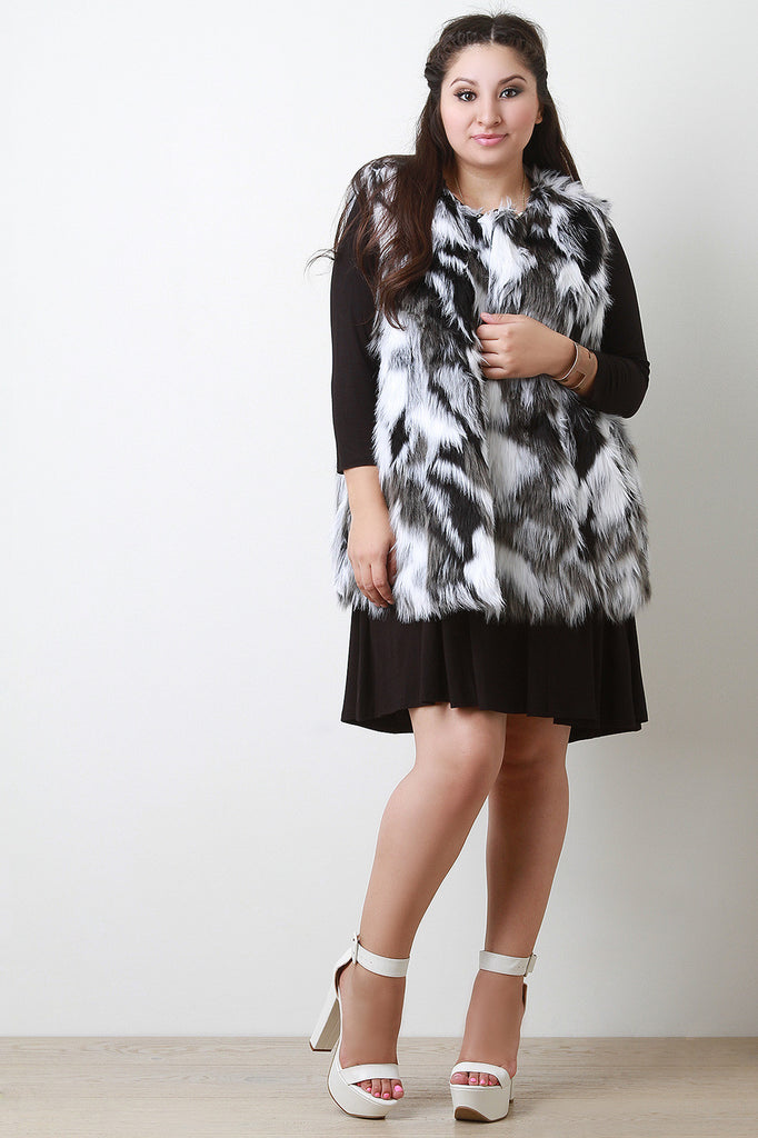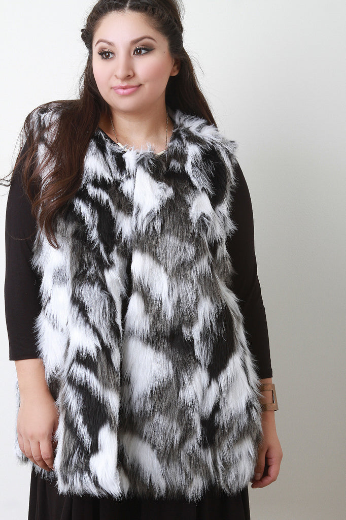This faux fur throughout, sleeveless design, hook-and-eye closures at front, and fully lined. Accessories sold separately. 100% Polyester.