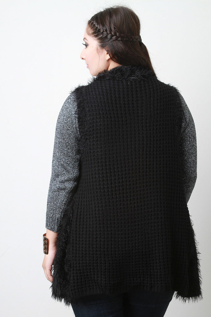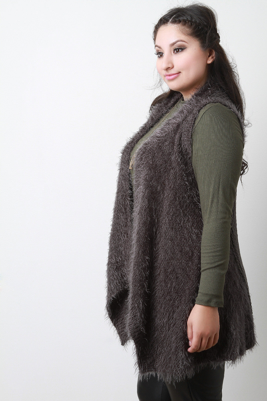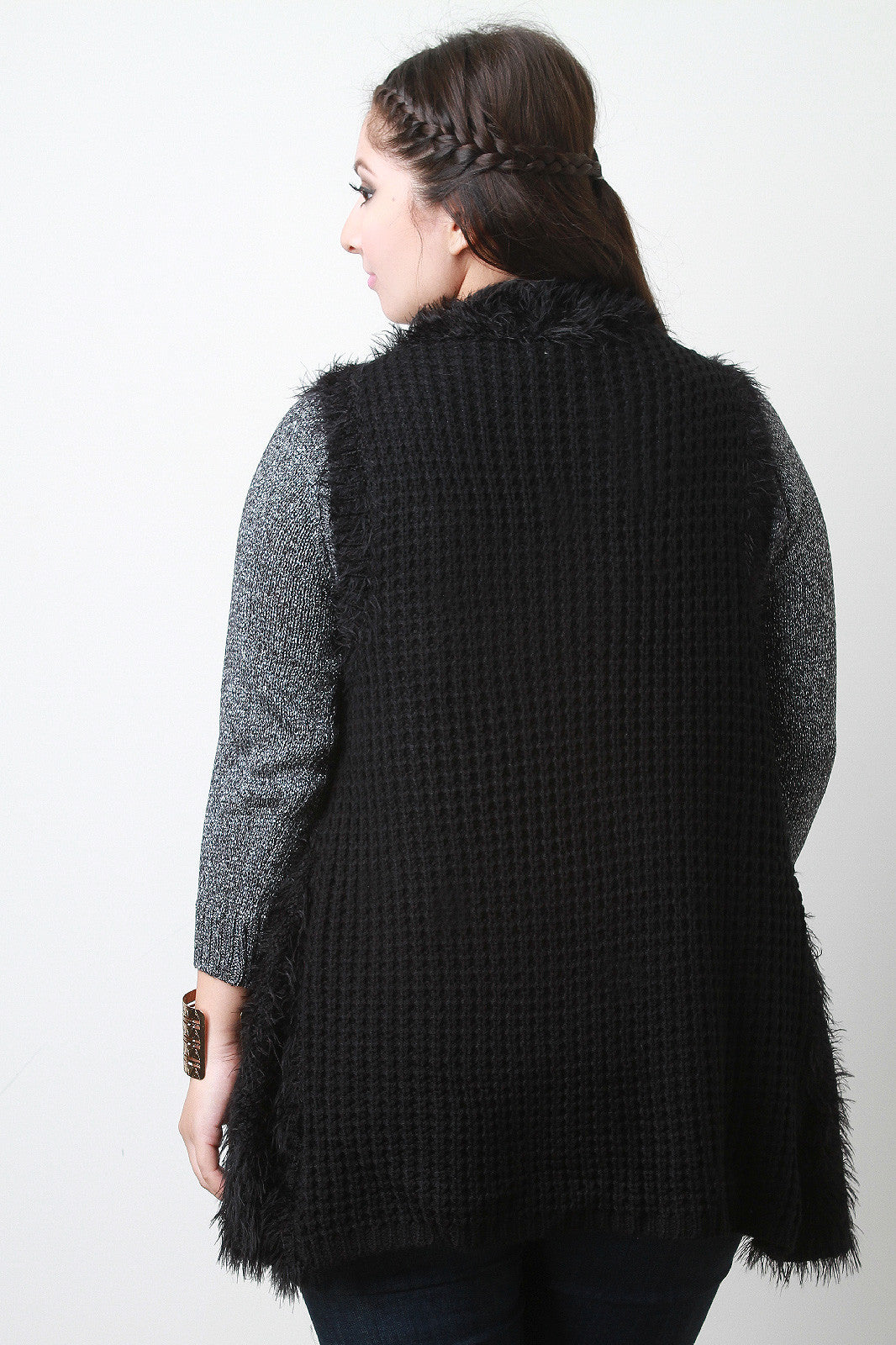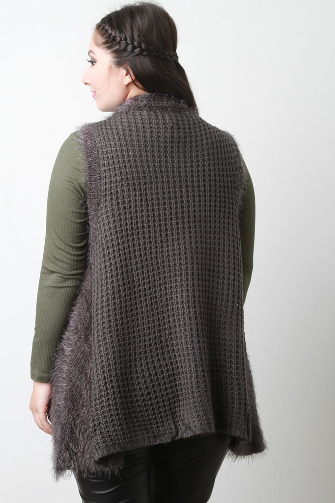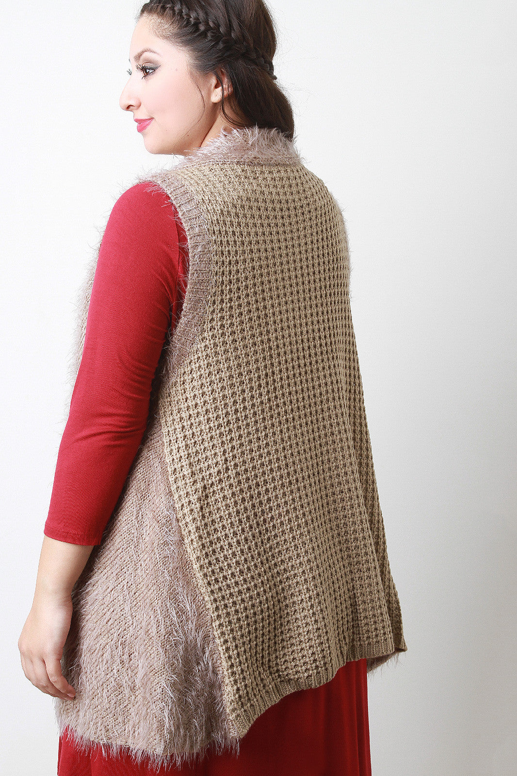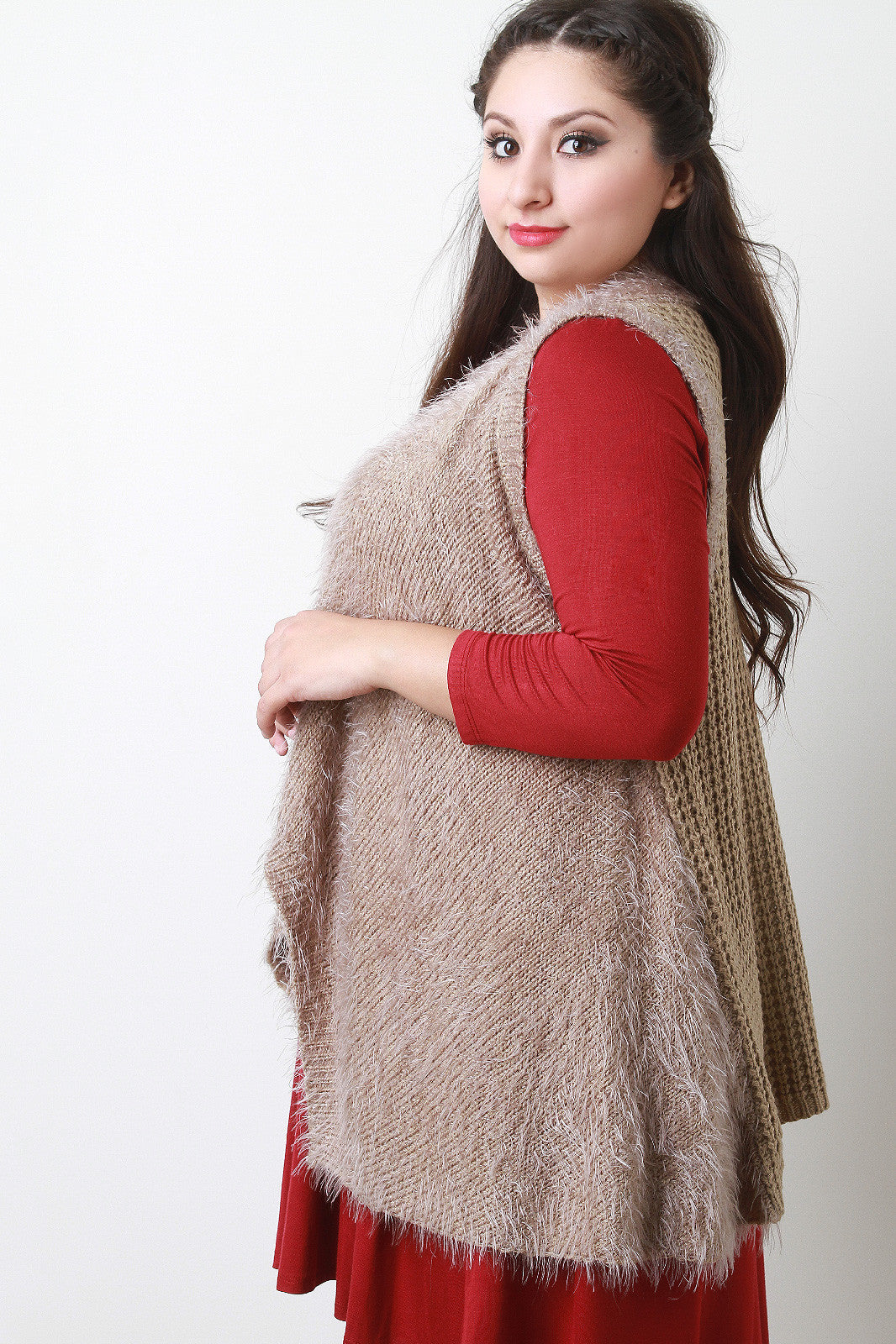 This plus size vest features a faux fur design at front with contrast knit at back, sleeveless construction, open front with drape design, and asymmetrical hem. Accessories sold separately. 60% Polyester, 40% Acrylic.