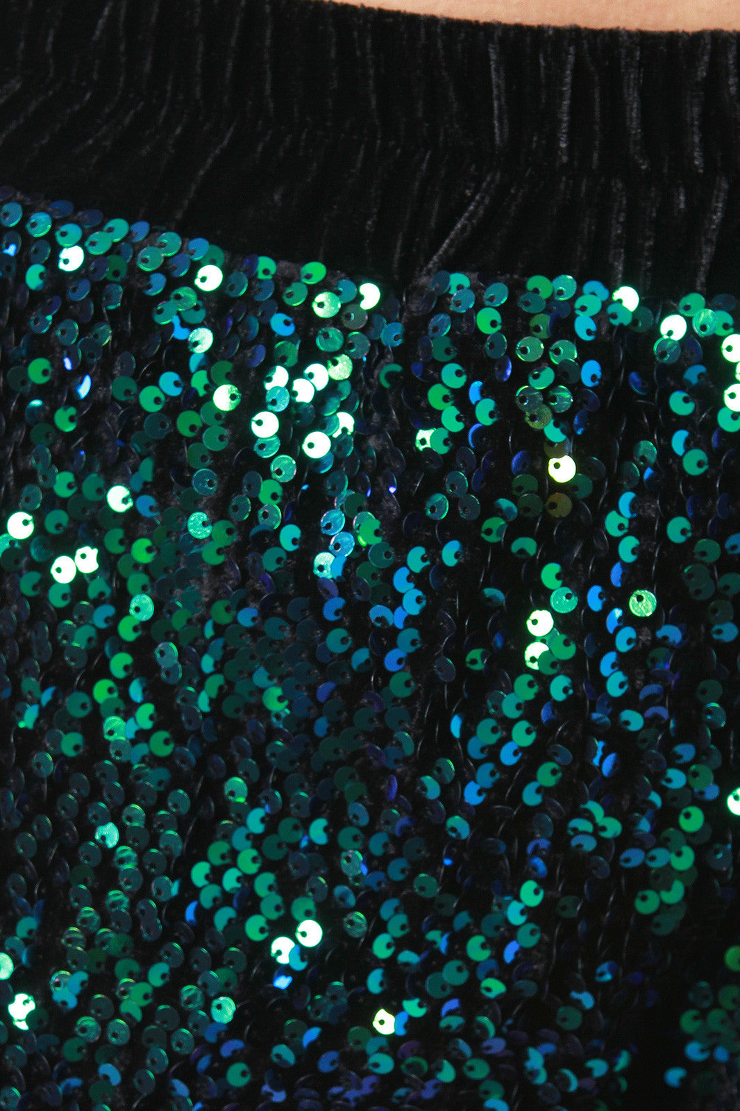 These two-tone sequined shorts features a velveteen elasticize waist, side pockets, and fully lined. Accessories sold separately. 50% Polyester, 50% Pet. Lining: 100% Polyester.