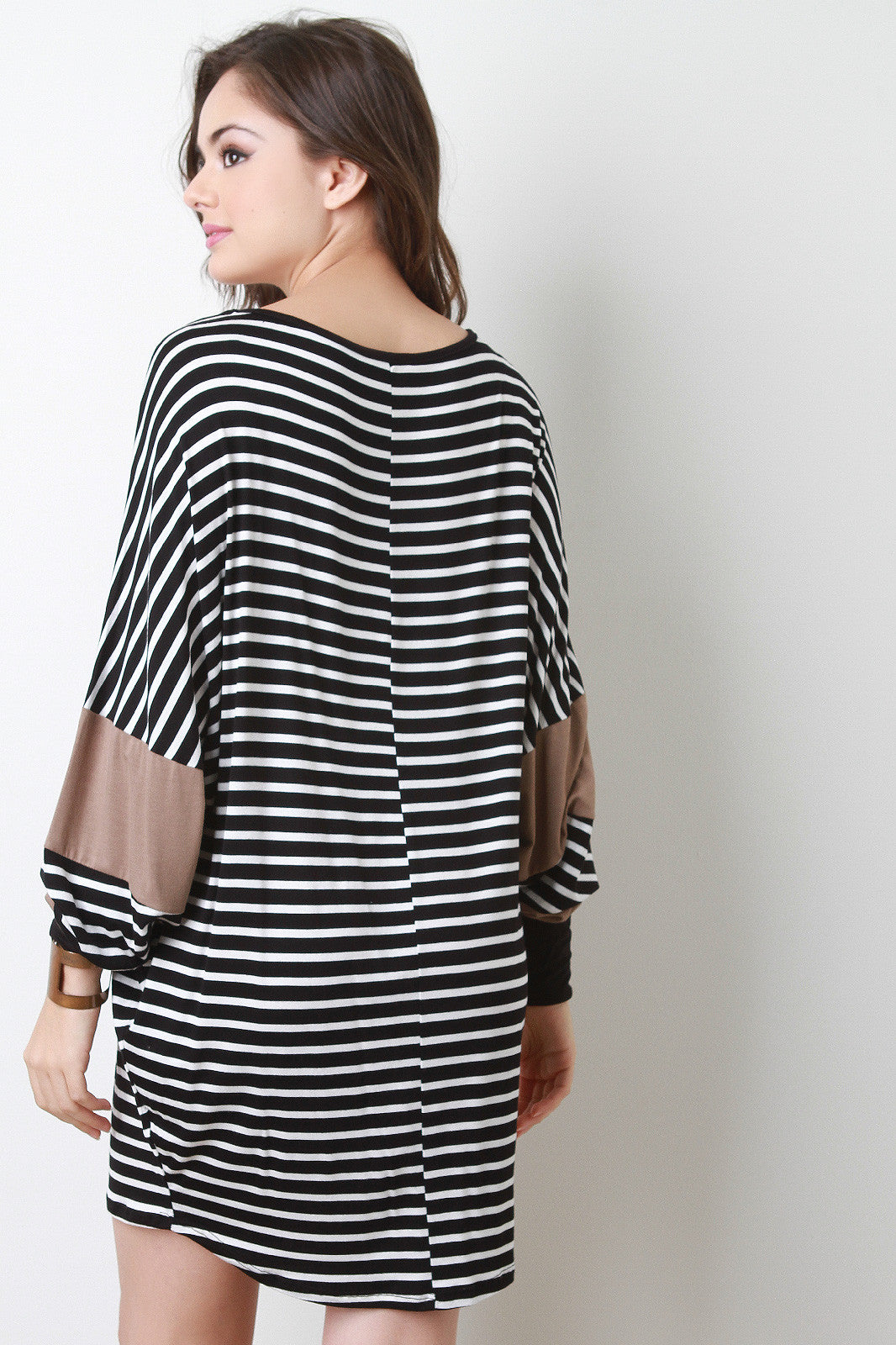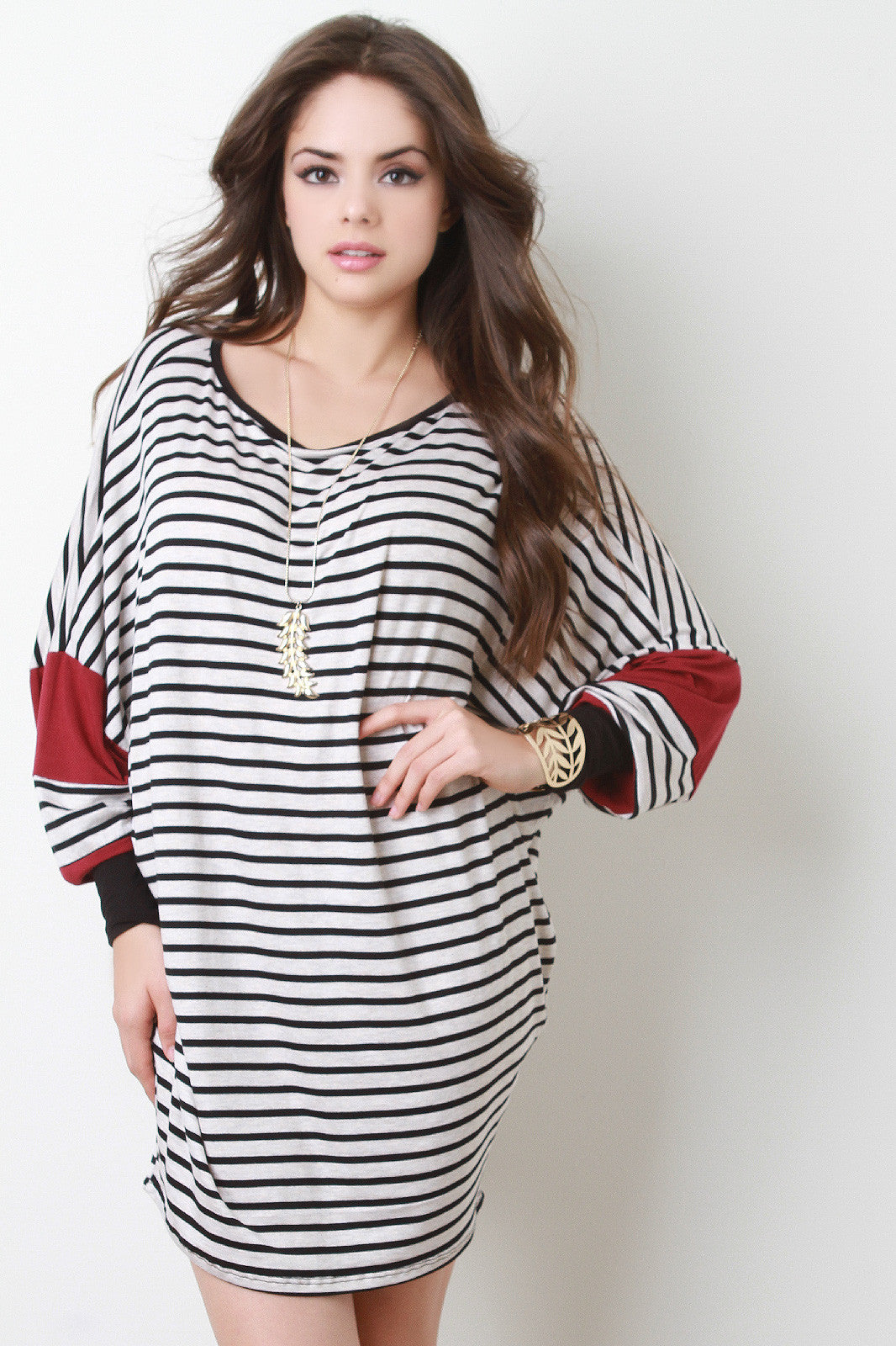 This tunic dress features a round neckline, long dolman sleeves, horizontal stripes, and contrasting panels at sleeves. Accessories sold separately. Made in U.S.A. 95% Rayon, 5% Spandex.