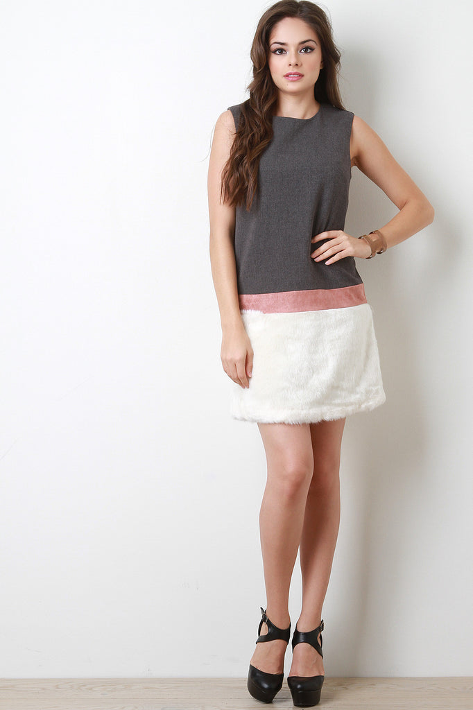 This colorblock dress features a sleeveless design, round neckline, zipper fastener back, vegan suede panel at drop waist, faux fur bottom half, and fully lined. Accessories sold separately. 90% Polyester, 10% Wool. Contrast: 80% Acrylic, 20% Polyester. Lining; 100% Polyester.