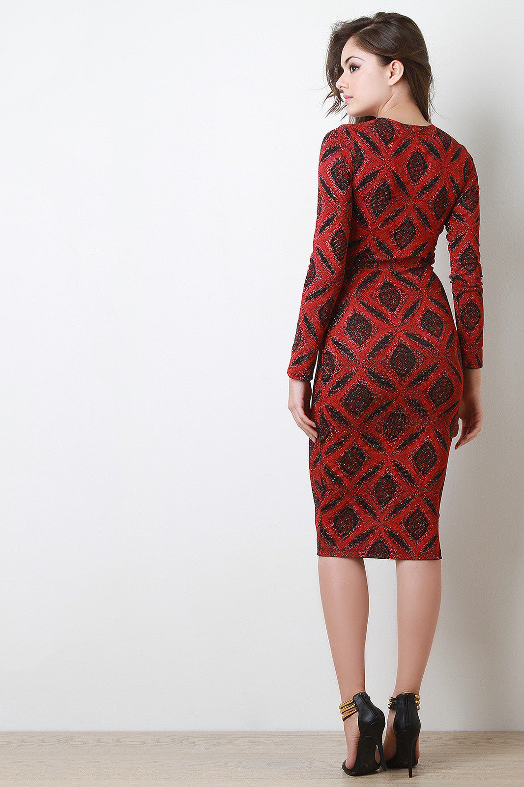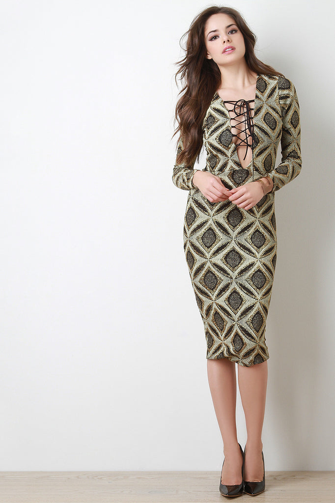 This midi dress features glitter stretch knit, geo pattern, plunge neckline with corset lace design, and long sleeves. Accessories sold separately. Made in U.S.A. 86% Nylon, 9% Metallic, 5% Spandex.