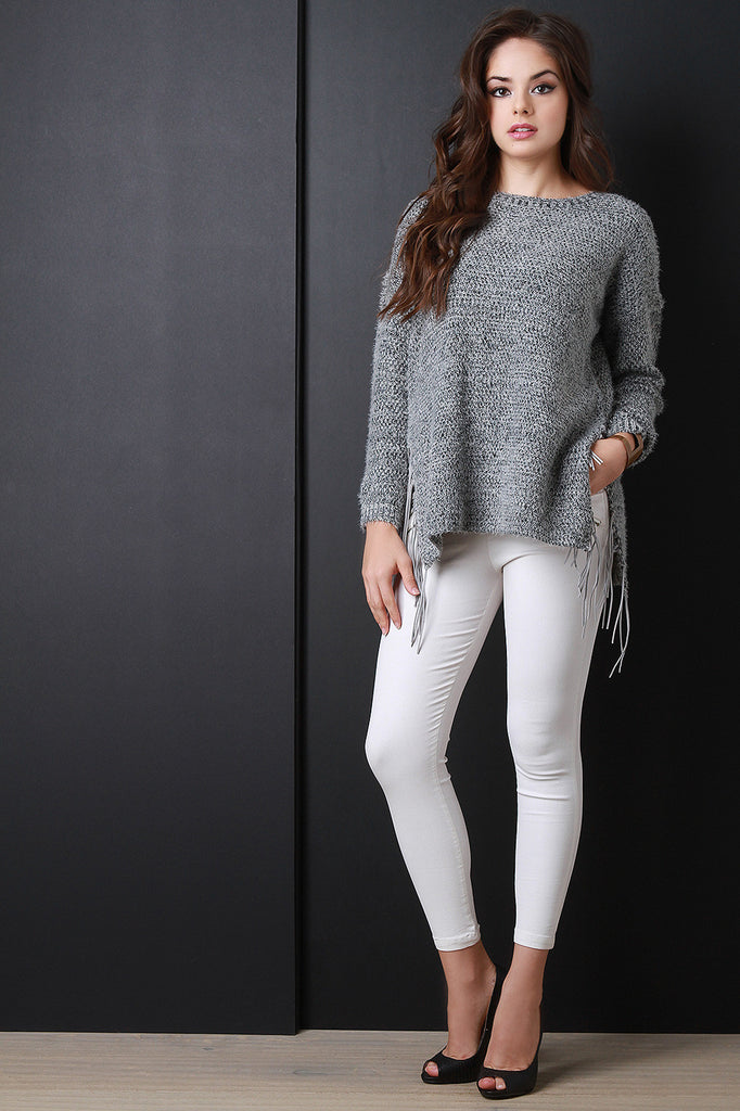 This sweater top features a two-tone knit design, round neckline, long sleeves, side vent slits, and vegan suede fringe accent. Accessories sold separately. 60% Acrylic, 40% Nylon.
