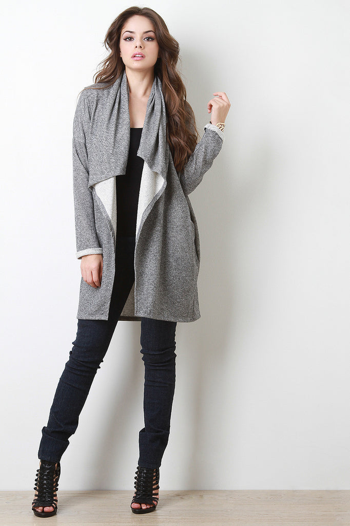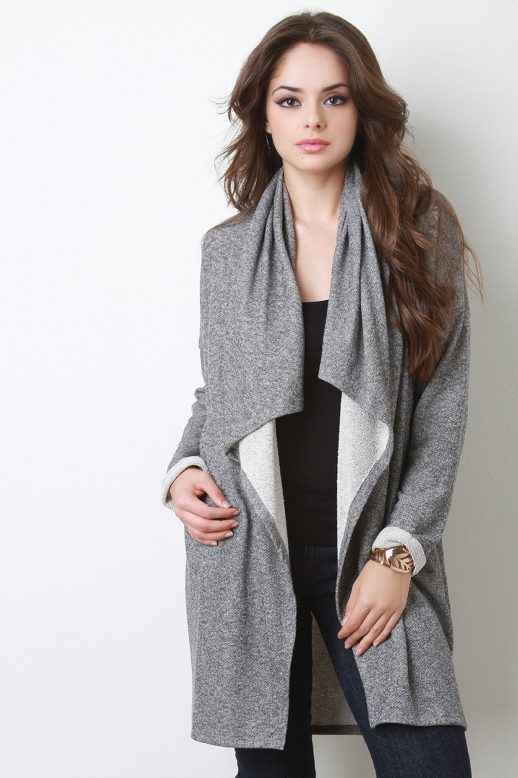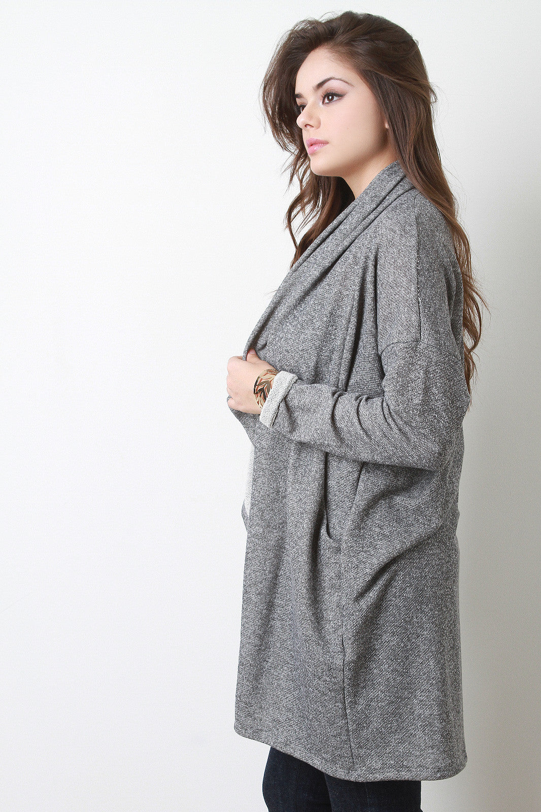 A French terry cardigan featuring a draping open front, cuffed full sleeves with dropped shoulders, and side pockets. Accessories sold separately. Made in U.S.A. 56% Polyester, 44% Cotton.