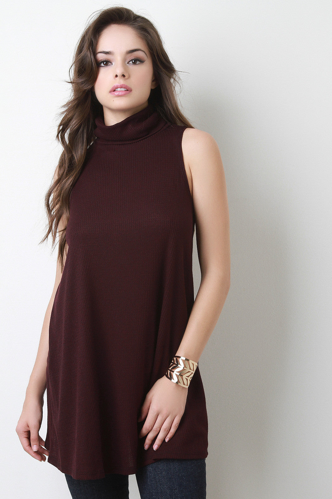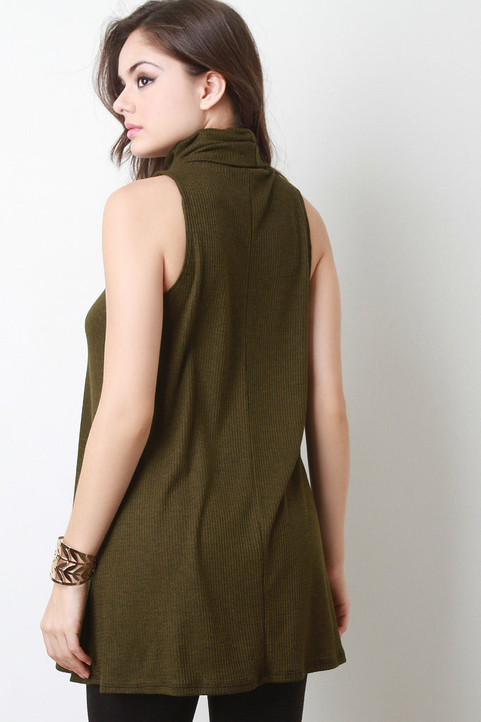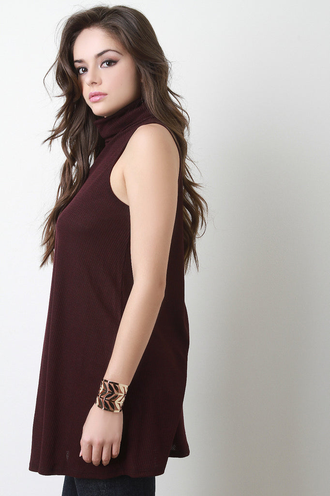 This sleeveless a-line top features a relaxed turtleneck and slightly ribbed lightweight fabric. Accessories sold separately. Made in U.S.A. 61% Polyester, 33% Rayon, 6% Spandex.