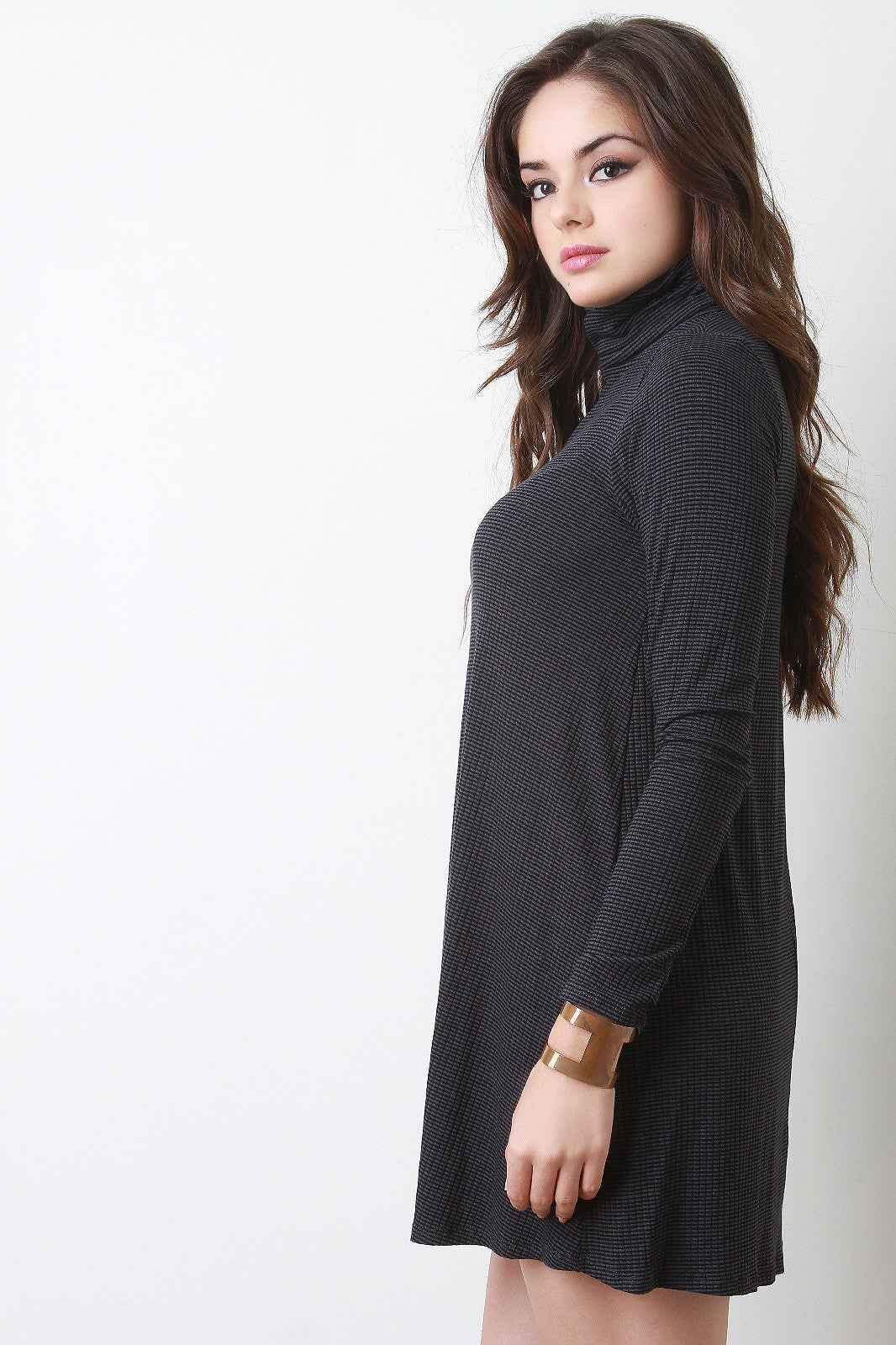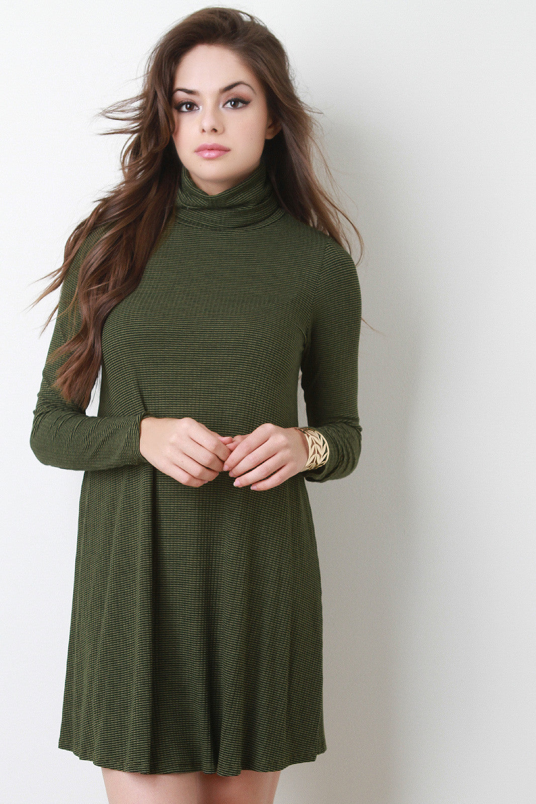 This turtleneck stripes throughout, long sleeves, and a relaxed shift fit. Accessories sold separately. Made in U.S.A. 95% Rayon, 5% Lycra.