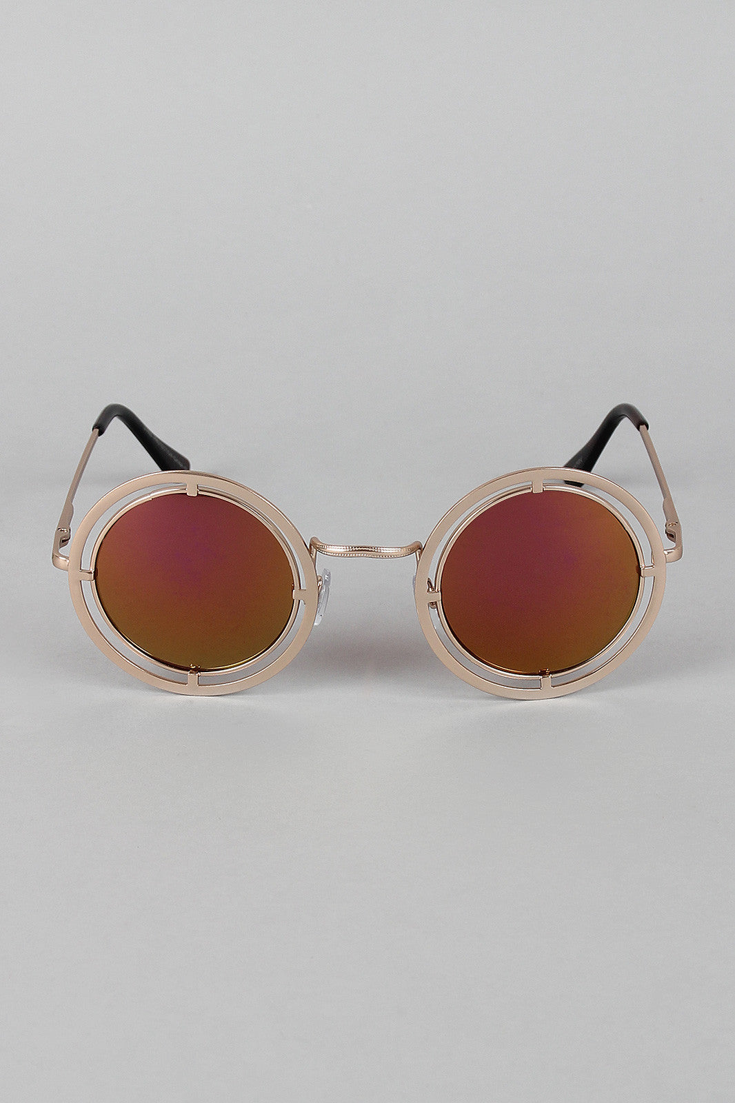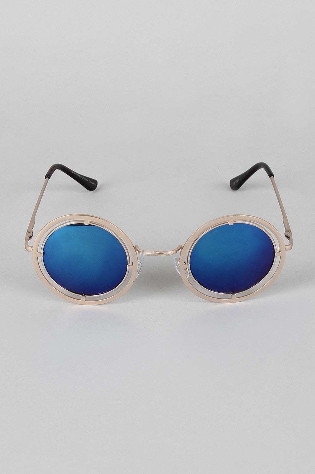 These sunglasses feature a very unique frame with open borders and a detailed nose bridge, iridescent lenses, and long temple tips for security.