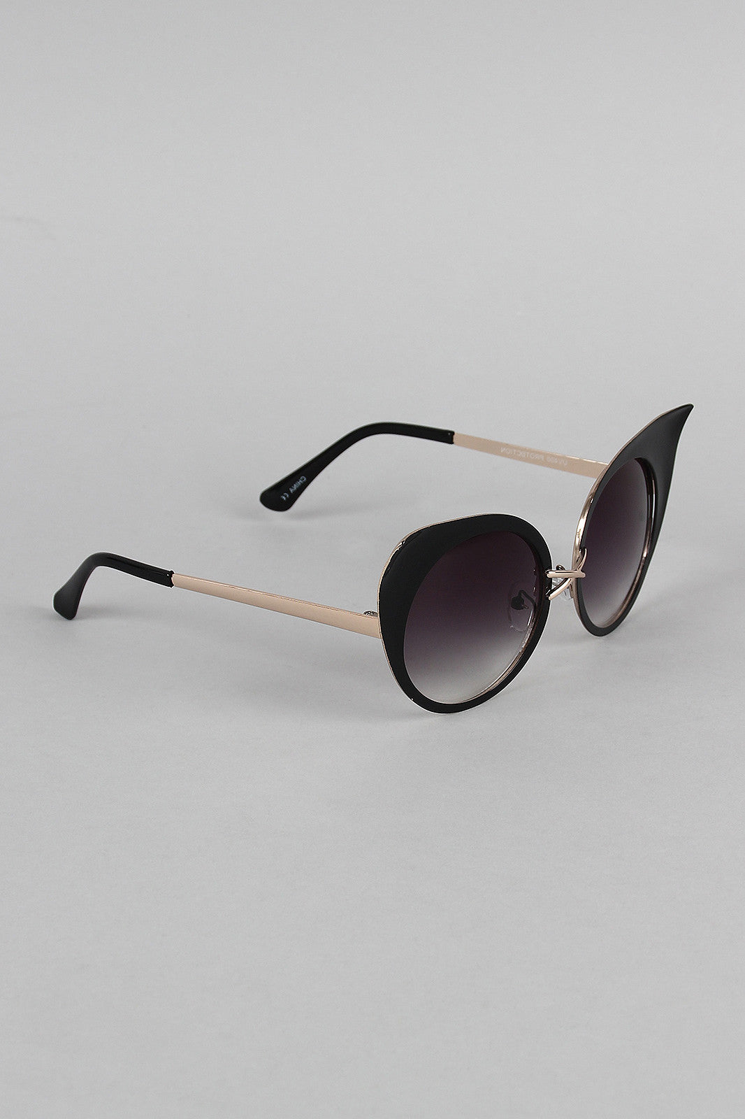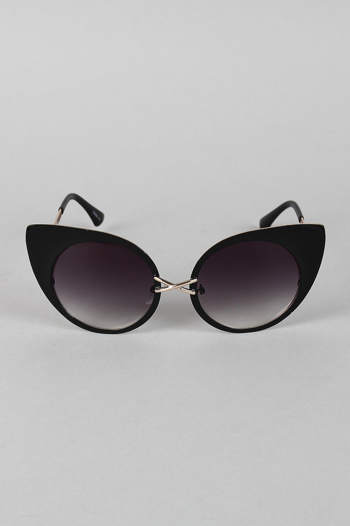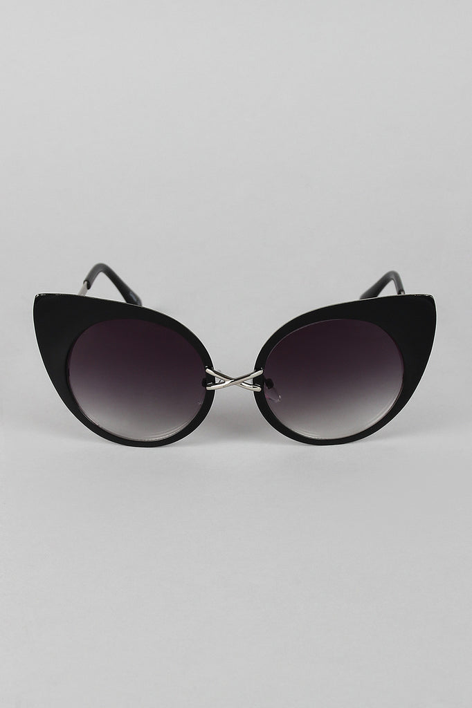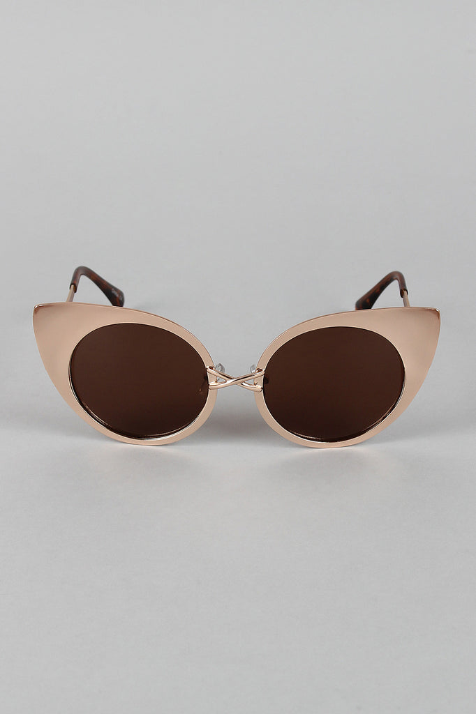These metallic frame sunglasses feature a crossed nose bridge, round lens, and a pointy cat eye look with slightly curved-inward tips. Finished with thick temple bars and long temple tips.