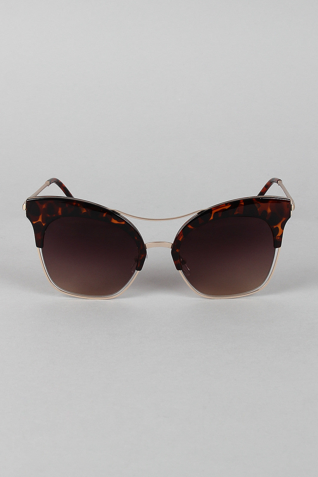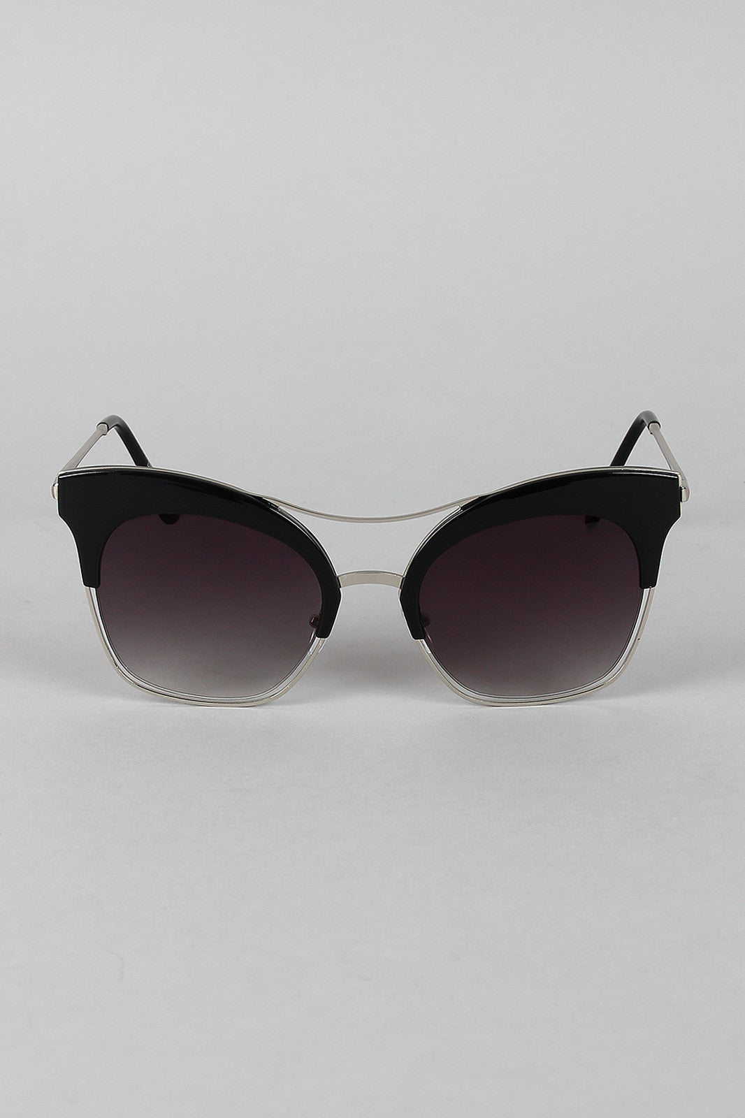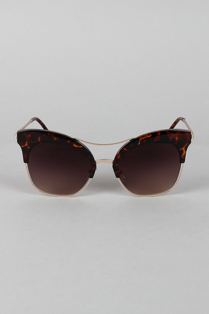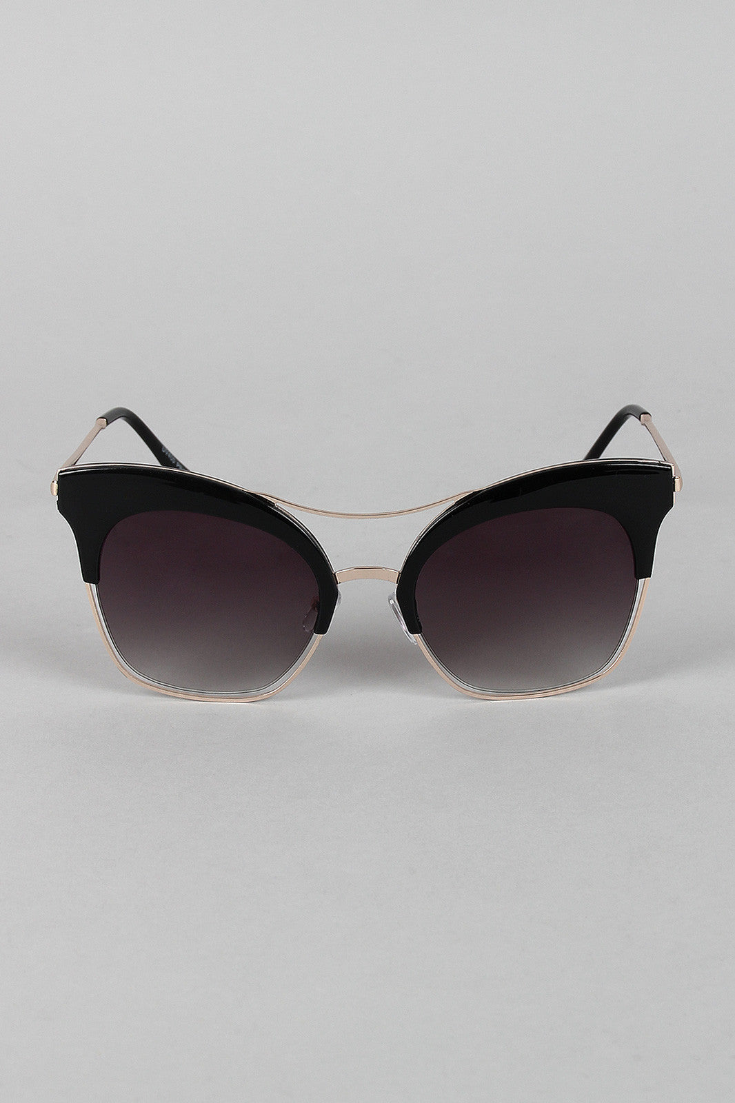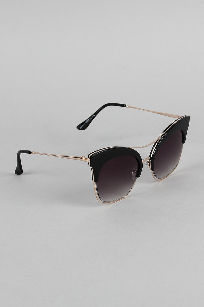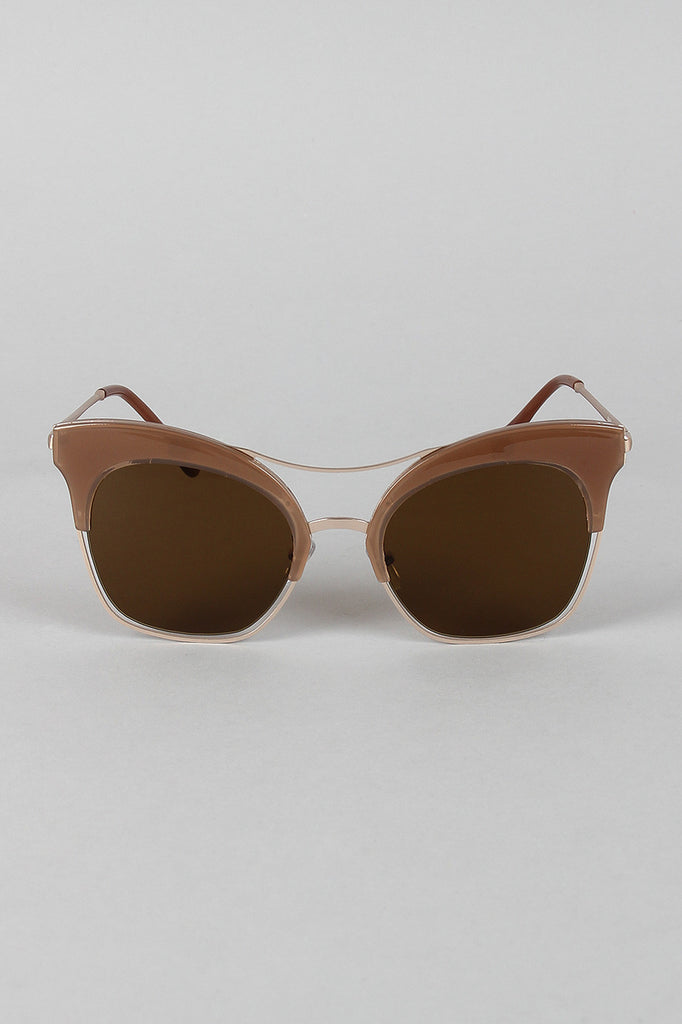 These sunglasses feature a double bridge nose with a unique design on the bottom lens and a distinct cat eye. The temple lens are long downwards, making these glasses secure, along with nose cushions.