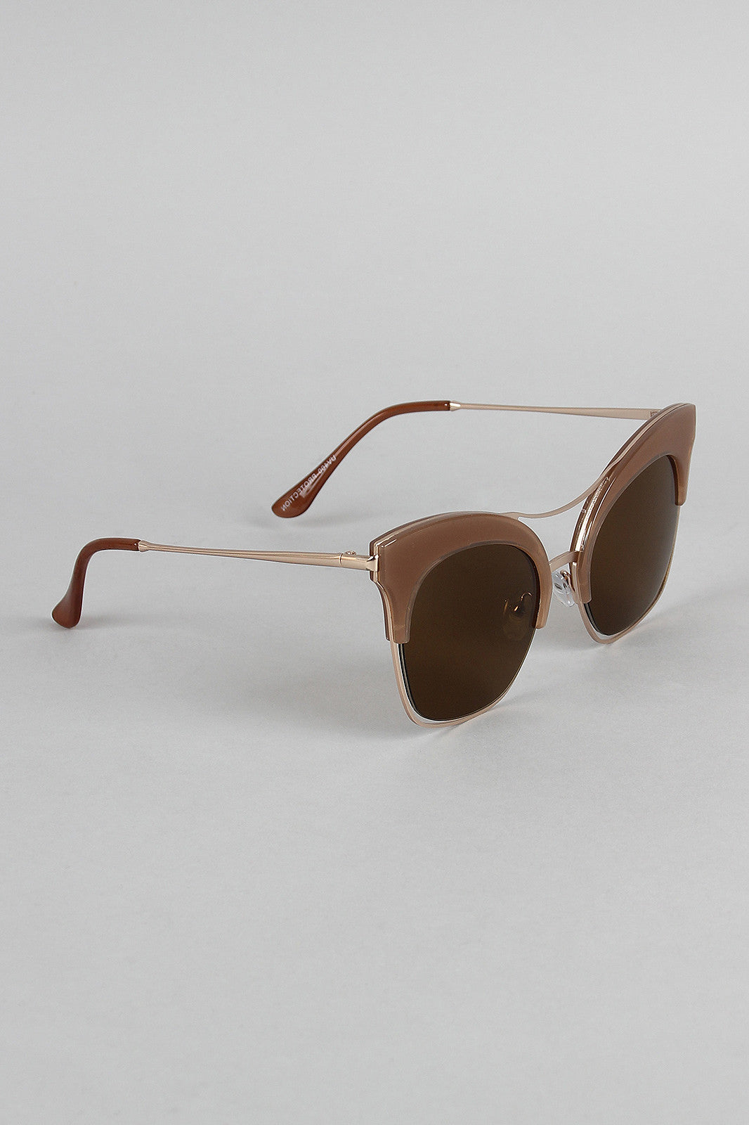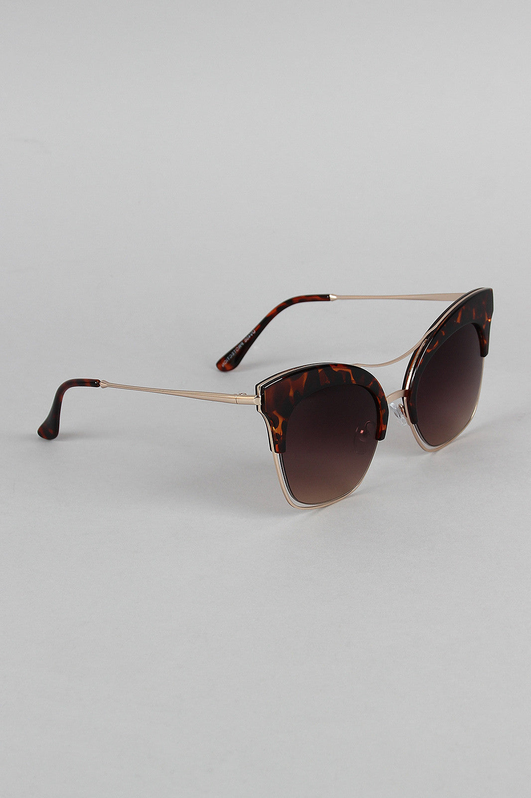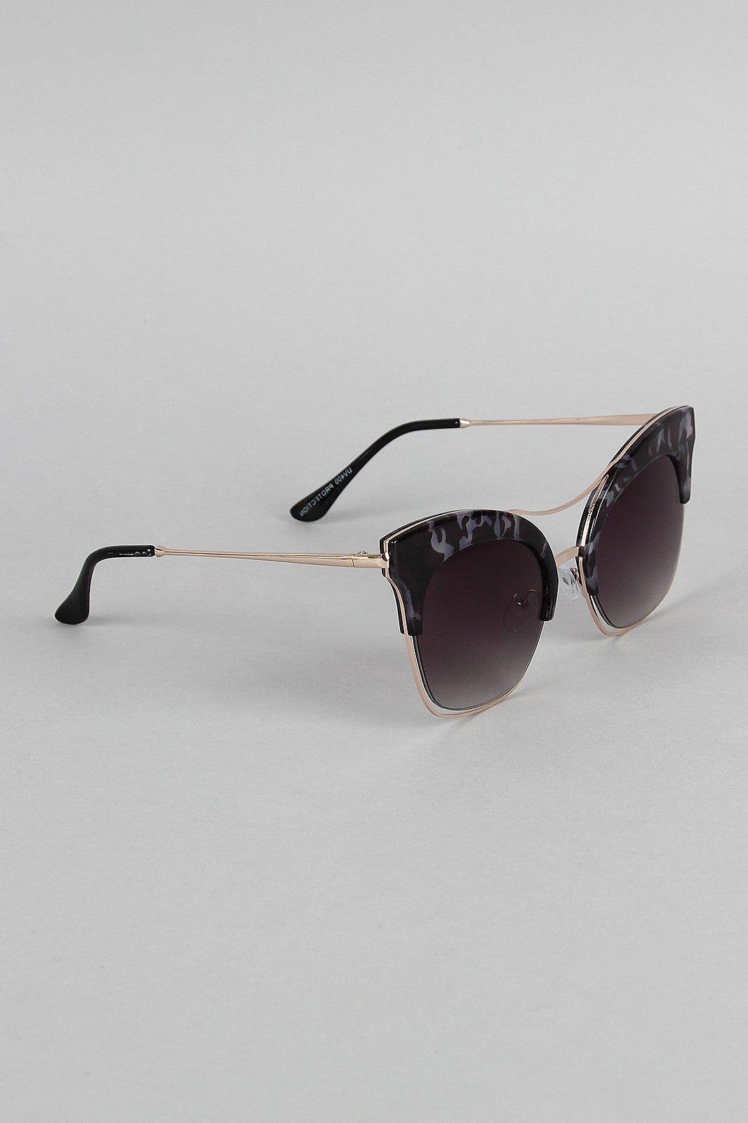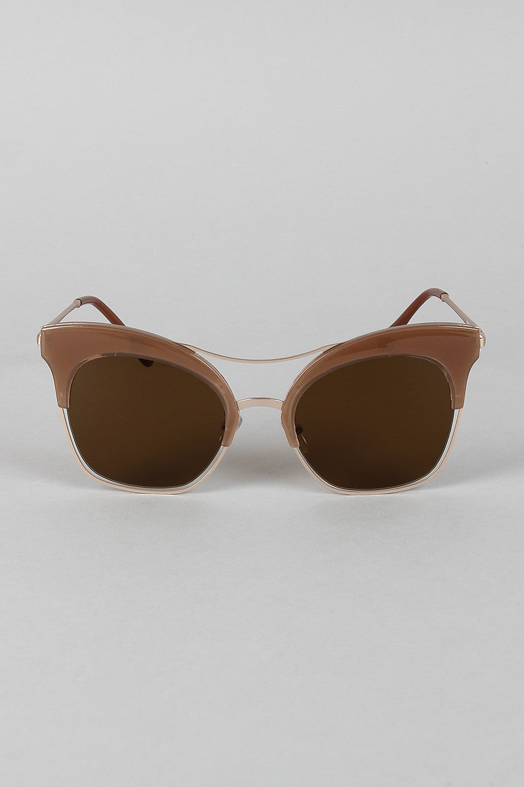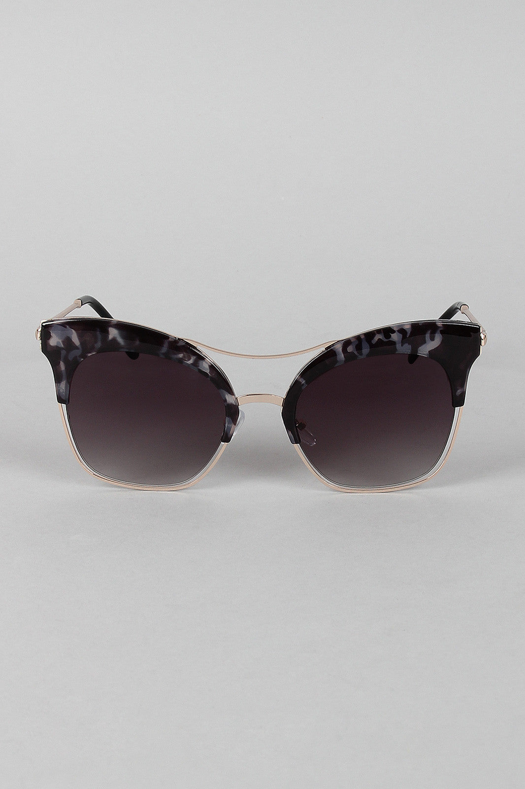 These sunglasses feature a double bridge nose with a unique design on the bottom lens and a distinct cat eye. The temple lens are long downwards, making these glasses secure, along with nose cushions.