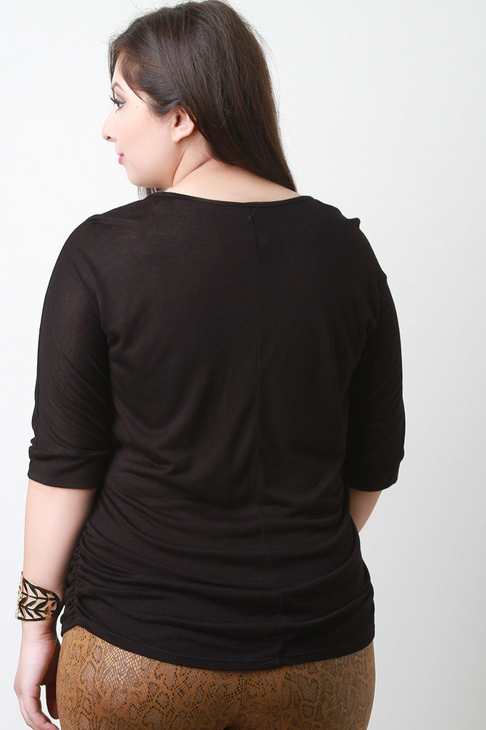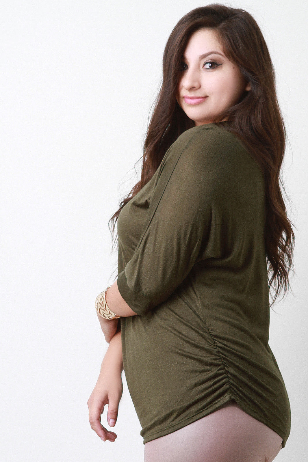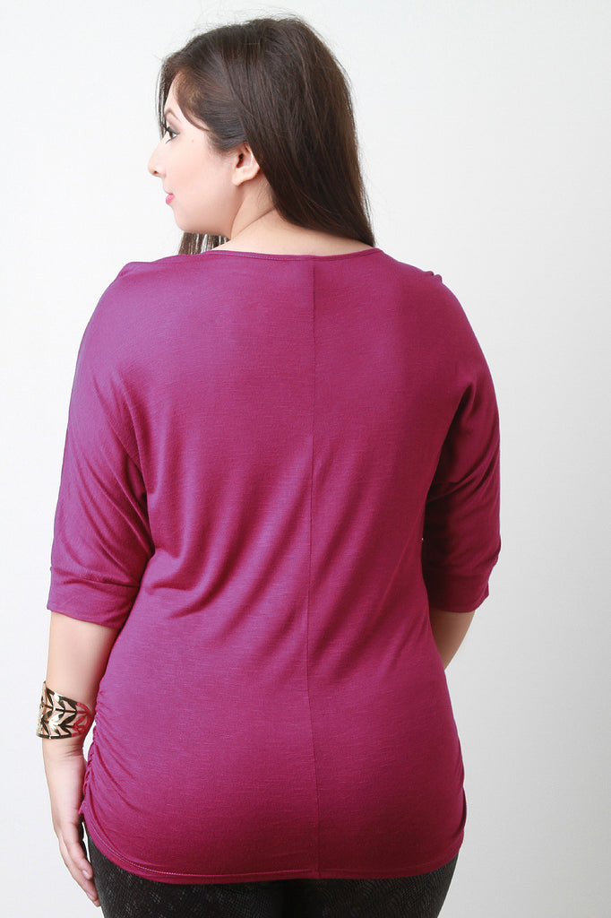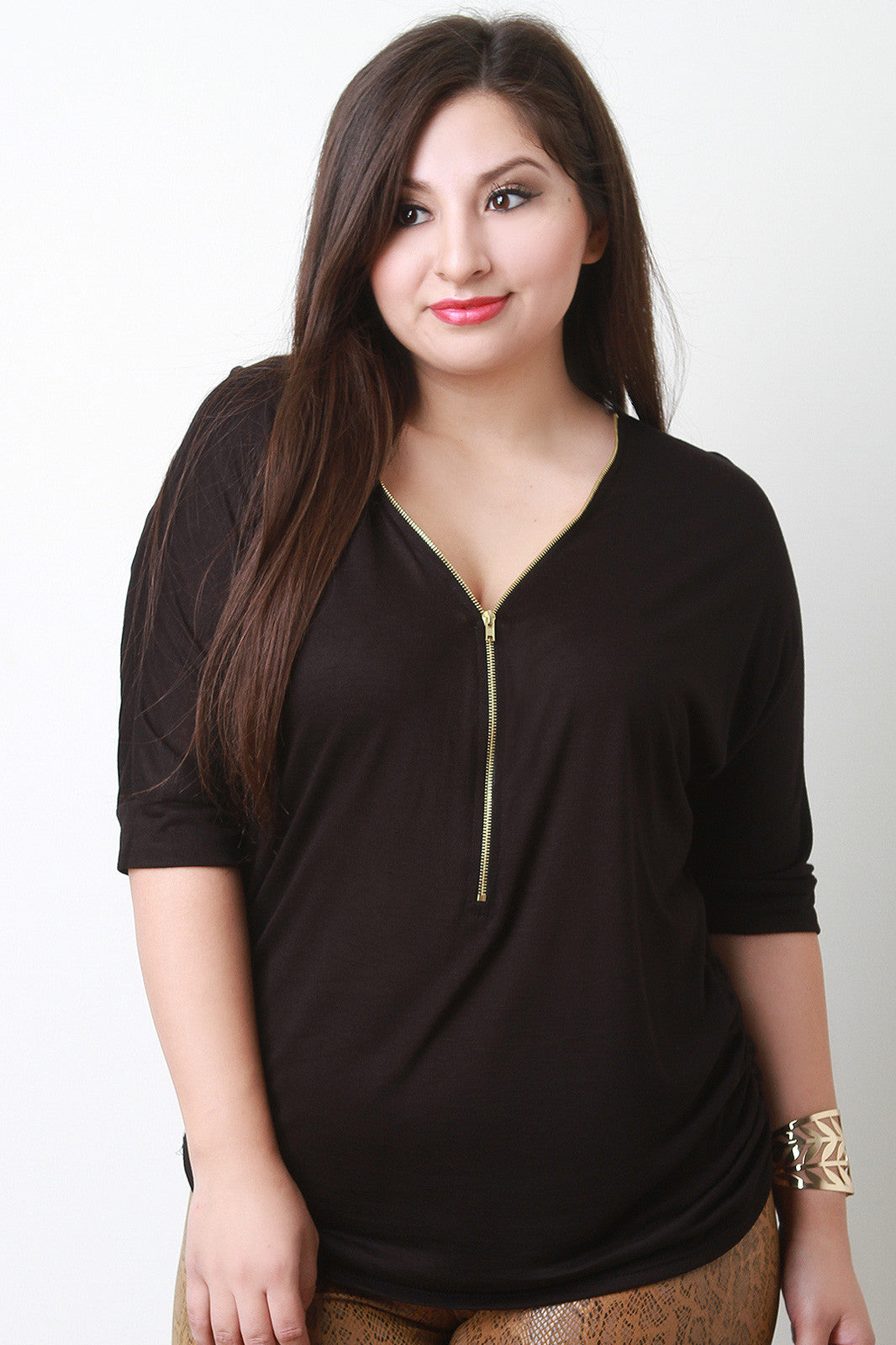 This plus size top features an adjustable v-neckline zipper. Designed with quarter sleeves and features ruched sides. Stretchy soft-knit structure. Accessories sold separately. 97% Rayon. 3% Spandex.