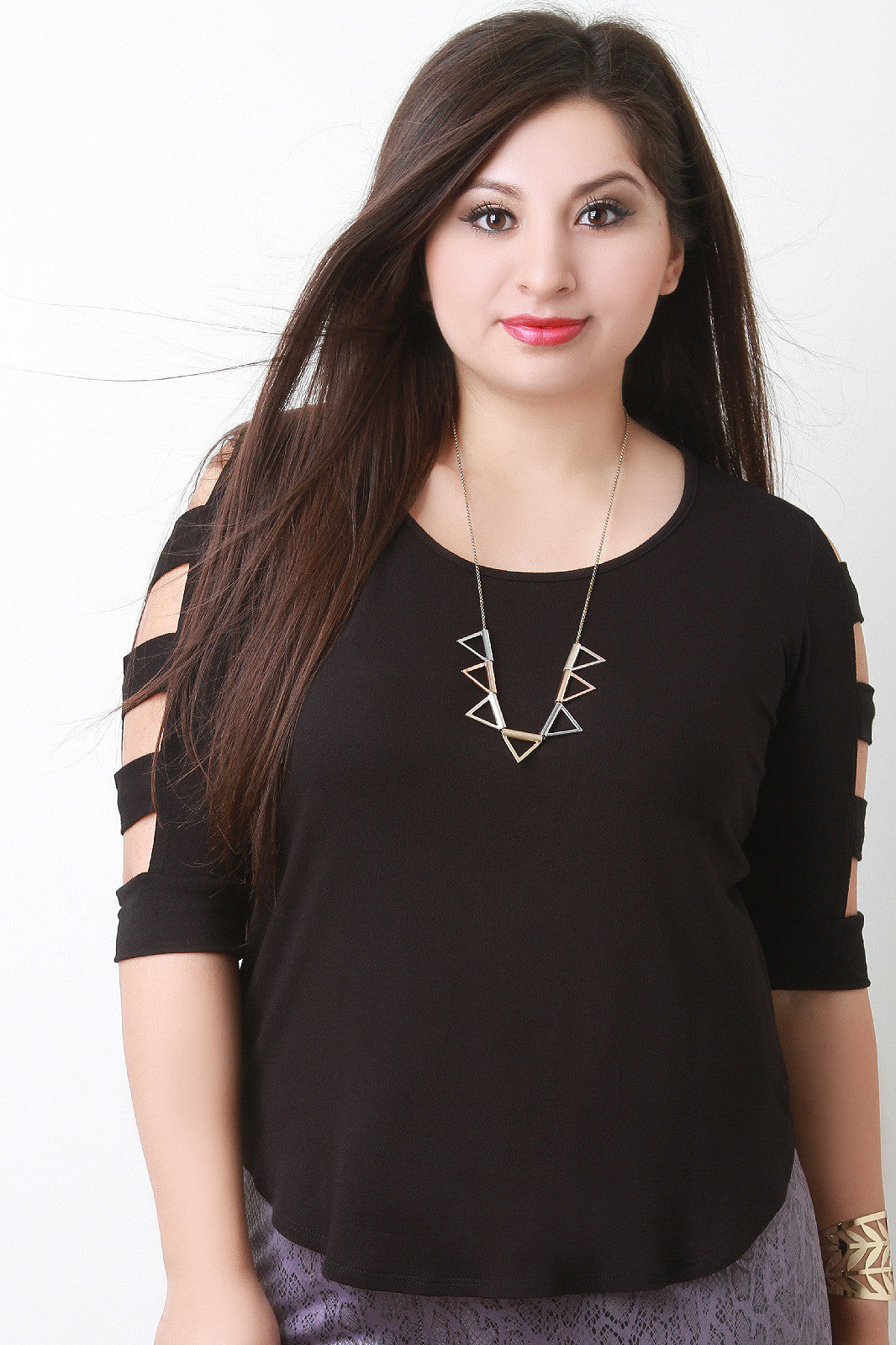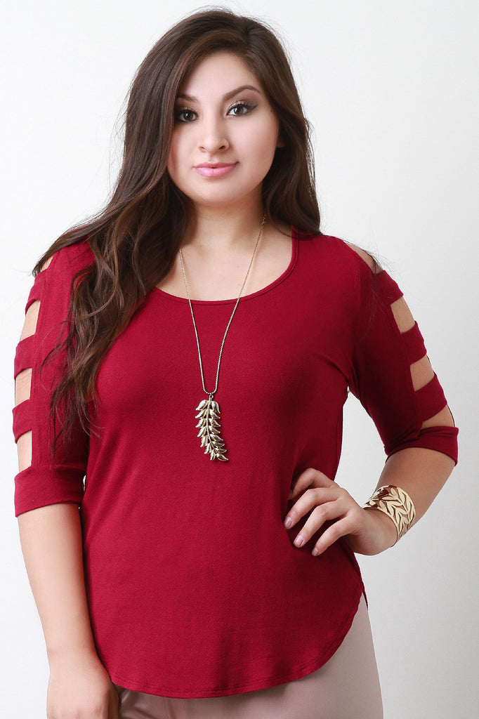 This plus size top has quarter sleeves featuring a strappy cutout design. It is scooped neckline with a curved hemline. Stretchy soft knit structure. Accessories sold separately. 97% Viscose. 3% Spandex.