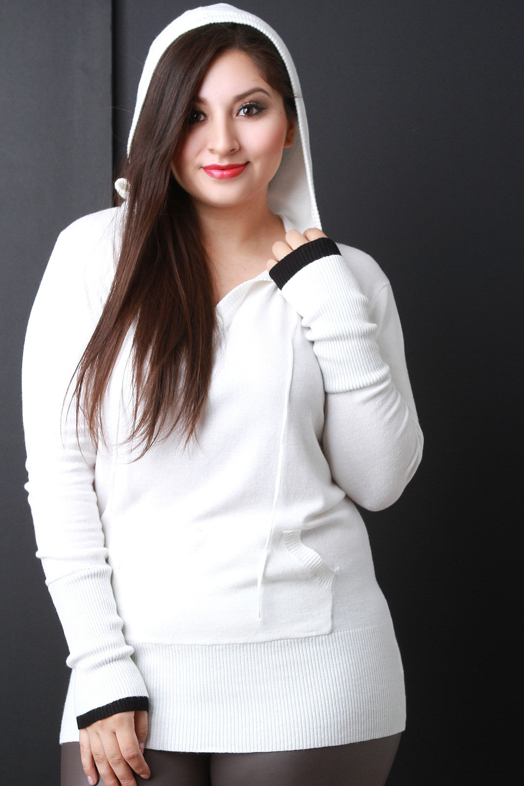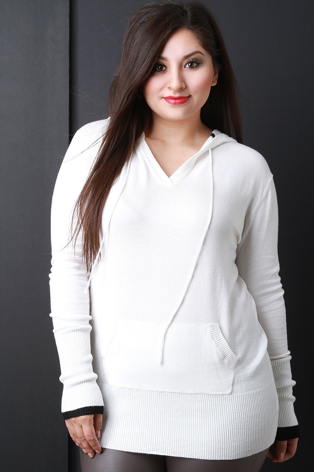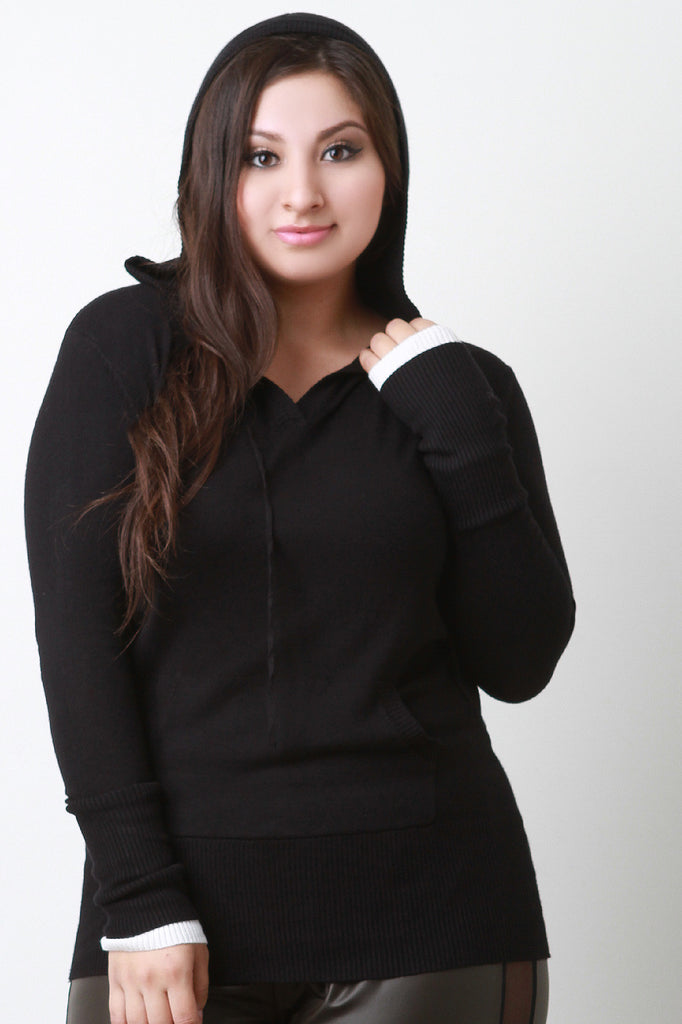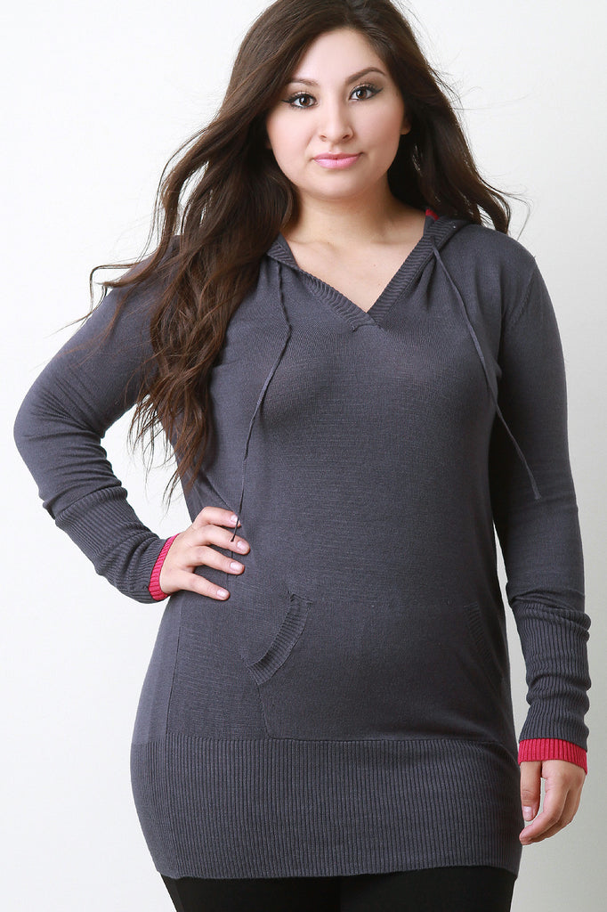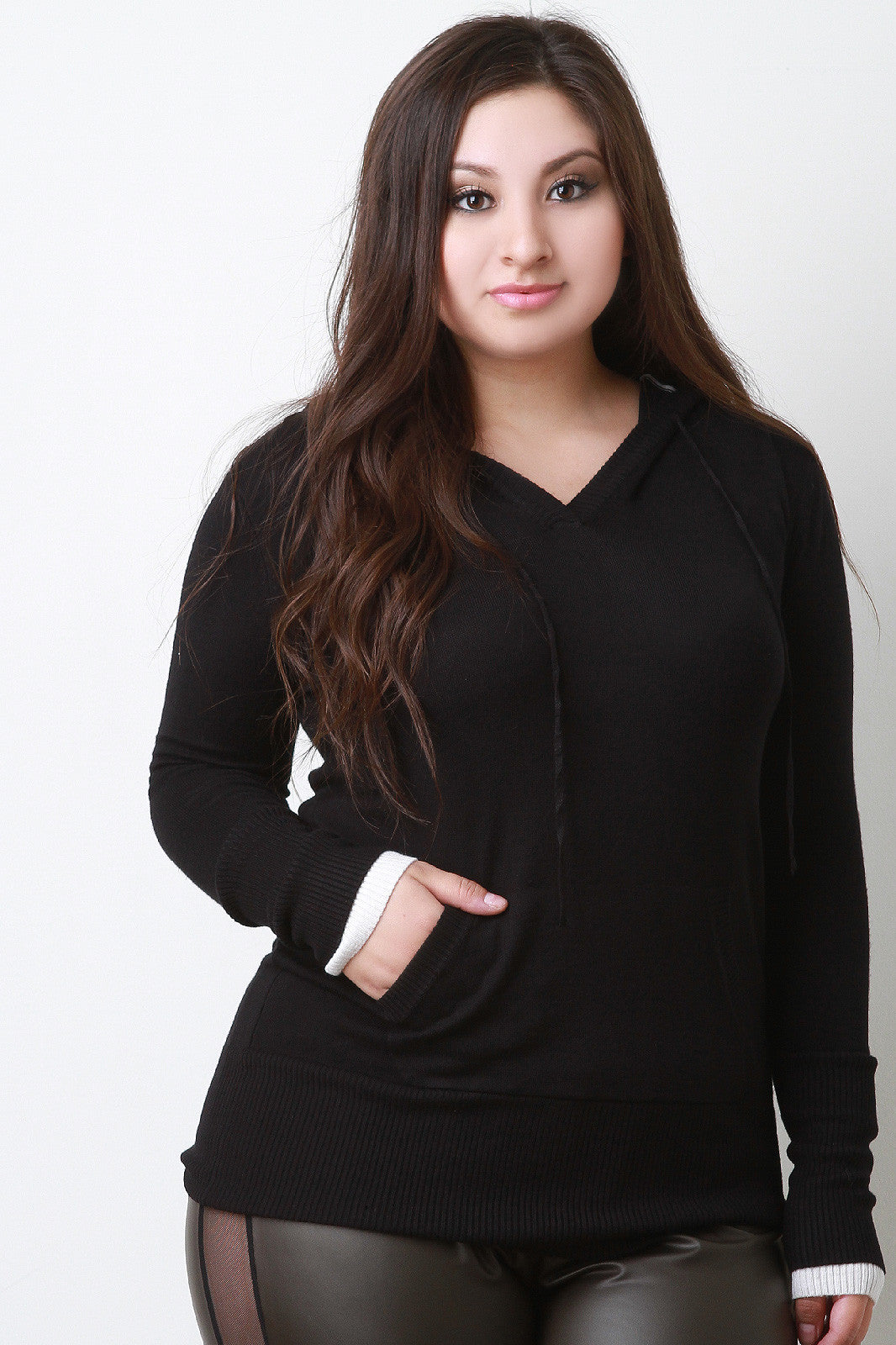 This plus size sweater top features a v-neck with attached hood, contrasting layered style ribbed knit sleeves, and front kangaroo pockets. Accessories sold separately. 100% Acrylic.