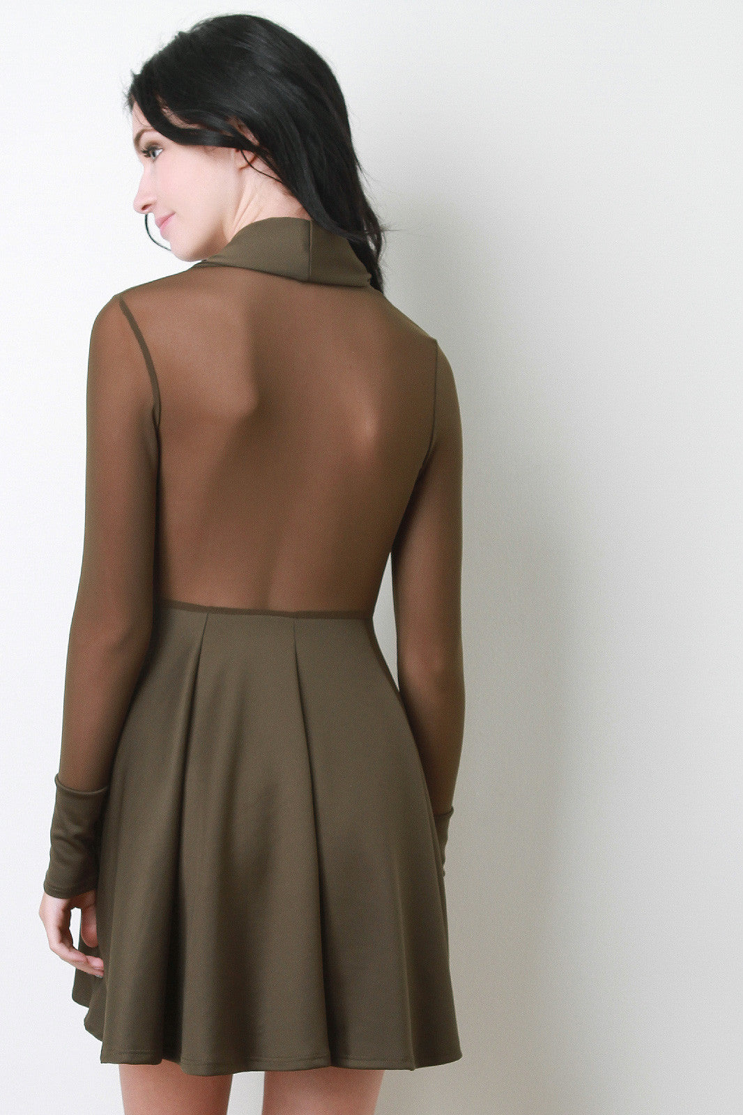 Deep V-Neck Mesh Contrast Long Sleeves Fit And Flare Dress