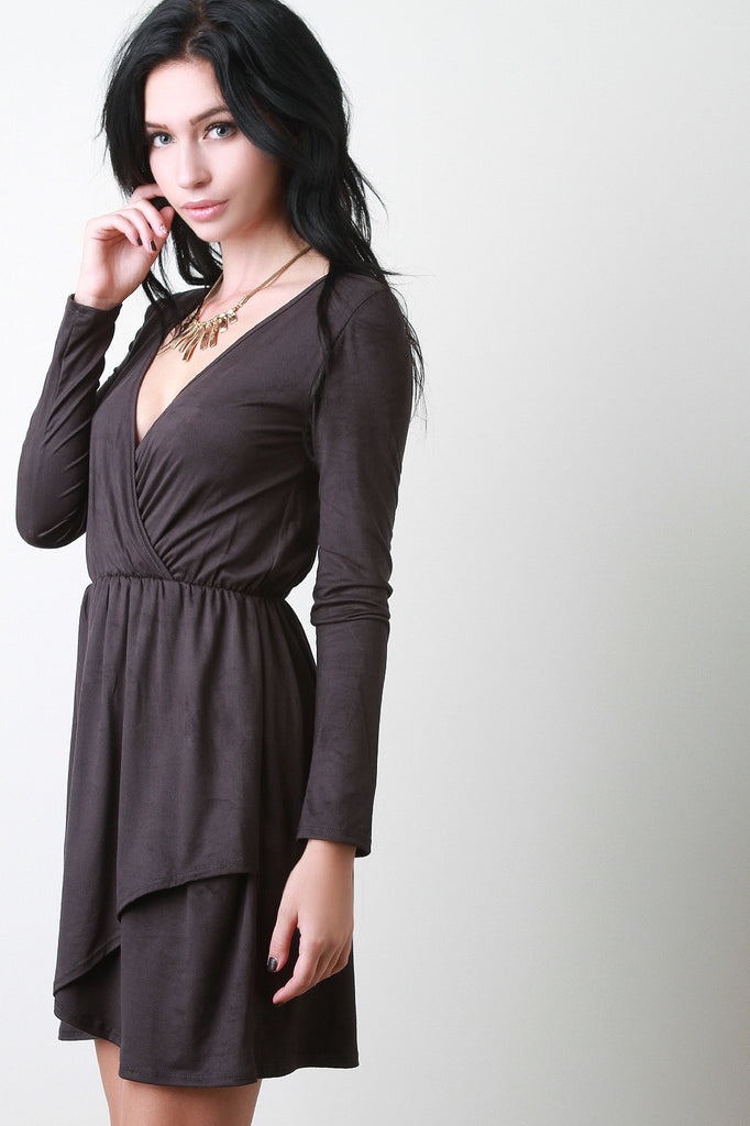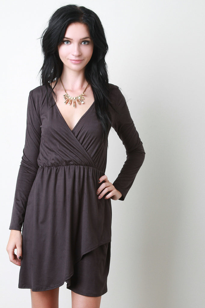 A long sleeves , and faux wrapped flared skirt. Finished with elasticized waist. Accessories sold separately. Made in U.S.A. 90% Polyester, 10% Spandex.