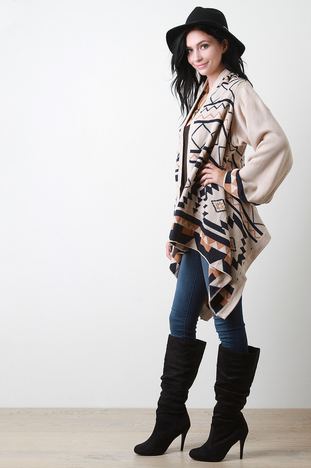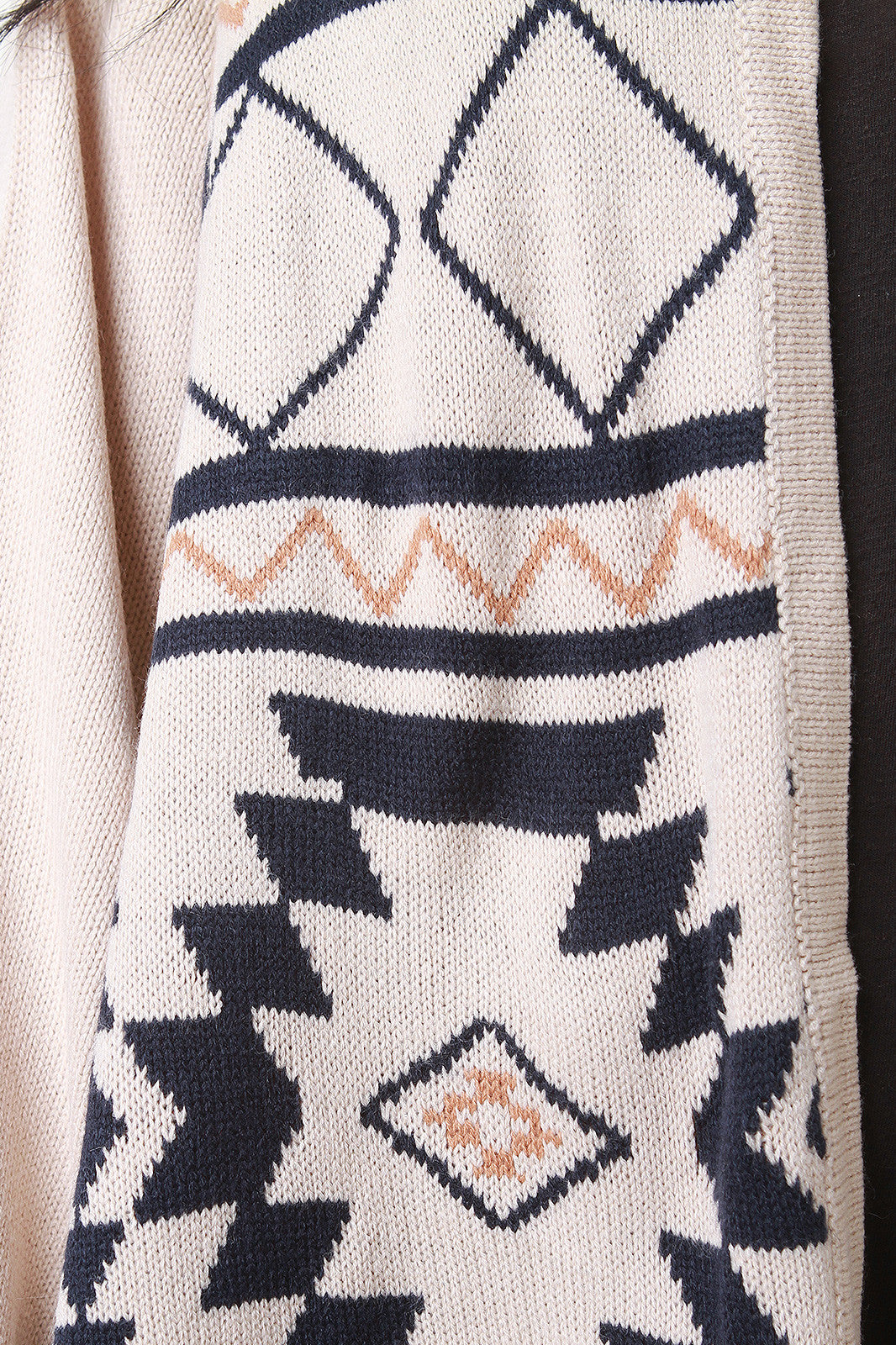 An open front cardigan featuring tribal knit patterns, long wide sleeves, and a handkerchief hemline. Accessories sold separately. 89% Acrylic, 11% Wool.