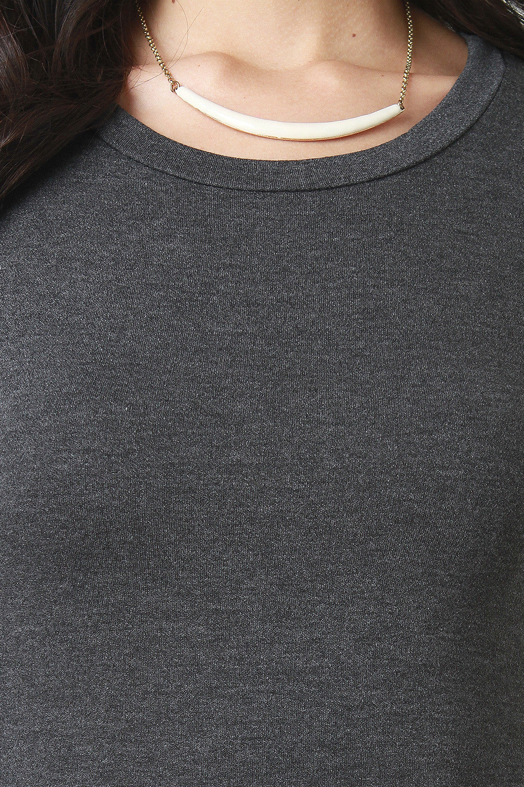 This jersey knit dress features a round neckline, long sleeves, diagonal asymmetrical hemline, and stretchy fit. Accessories sold separately. Made in U.S.A. 98% Rayon, 5% Spandex.