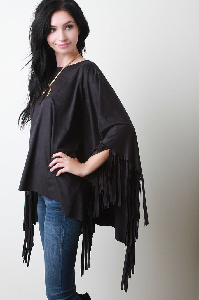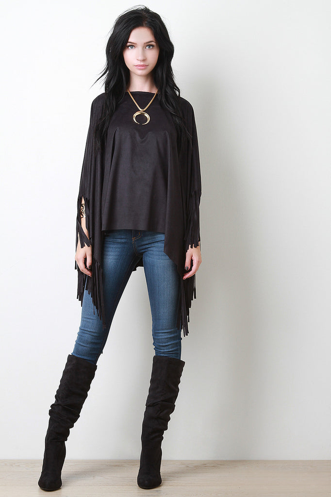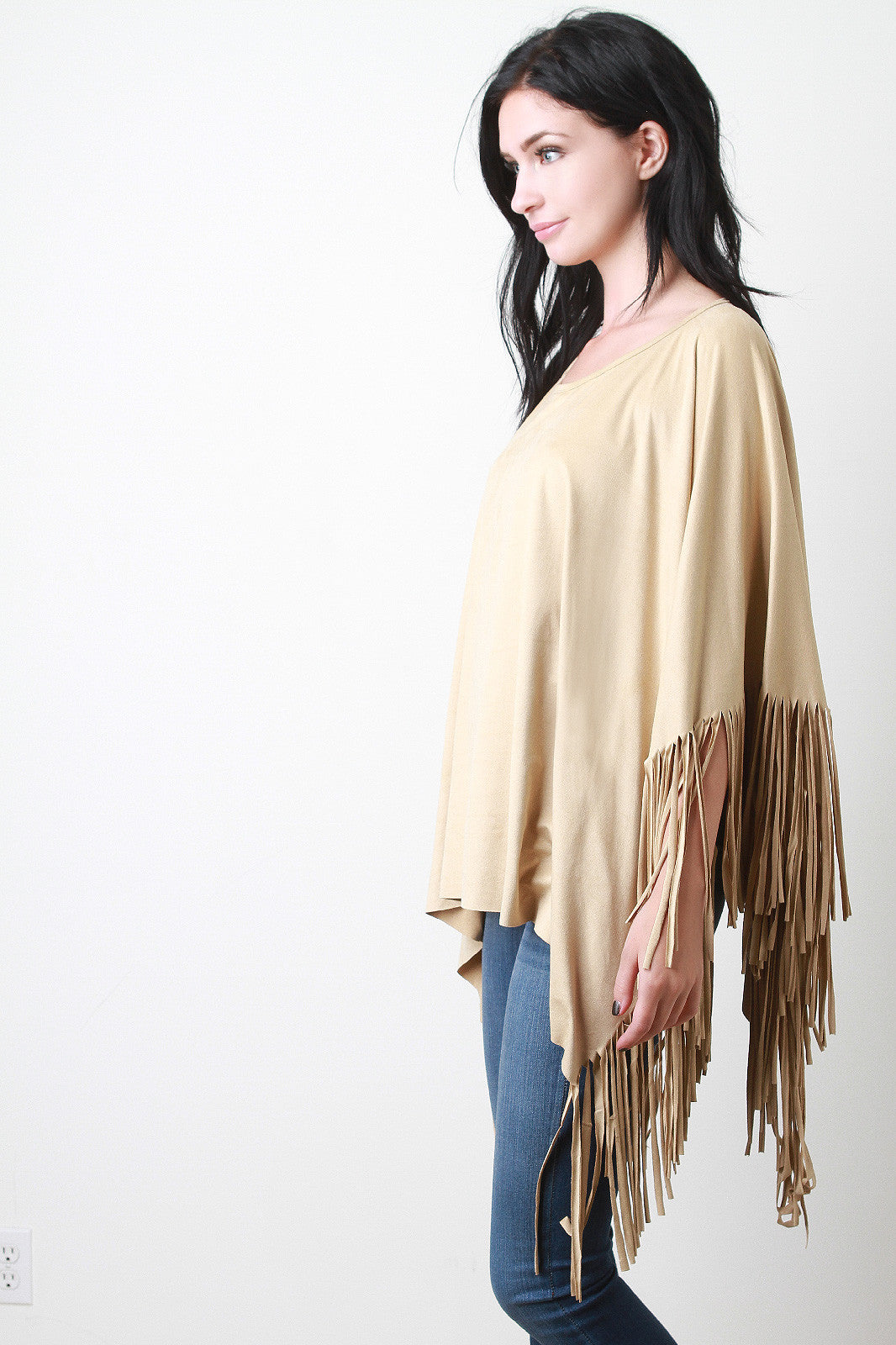 This fringe along the sides. It is scoop neckline. Accessories sold separately. 96% Polyester. 4% Spandex. Made in U.S.A.
