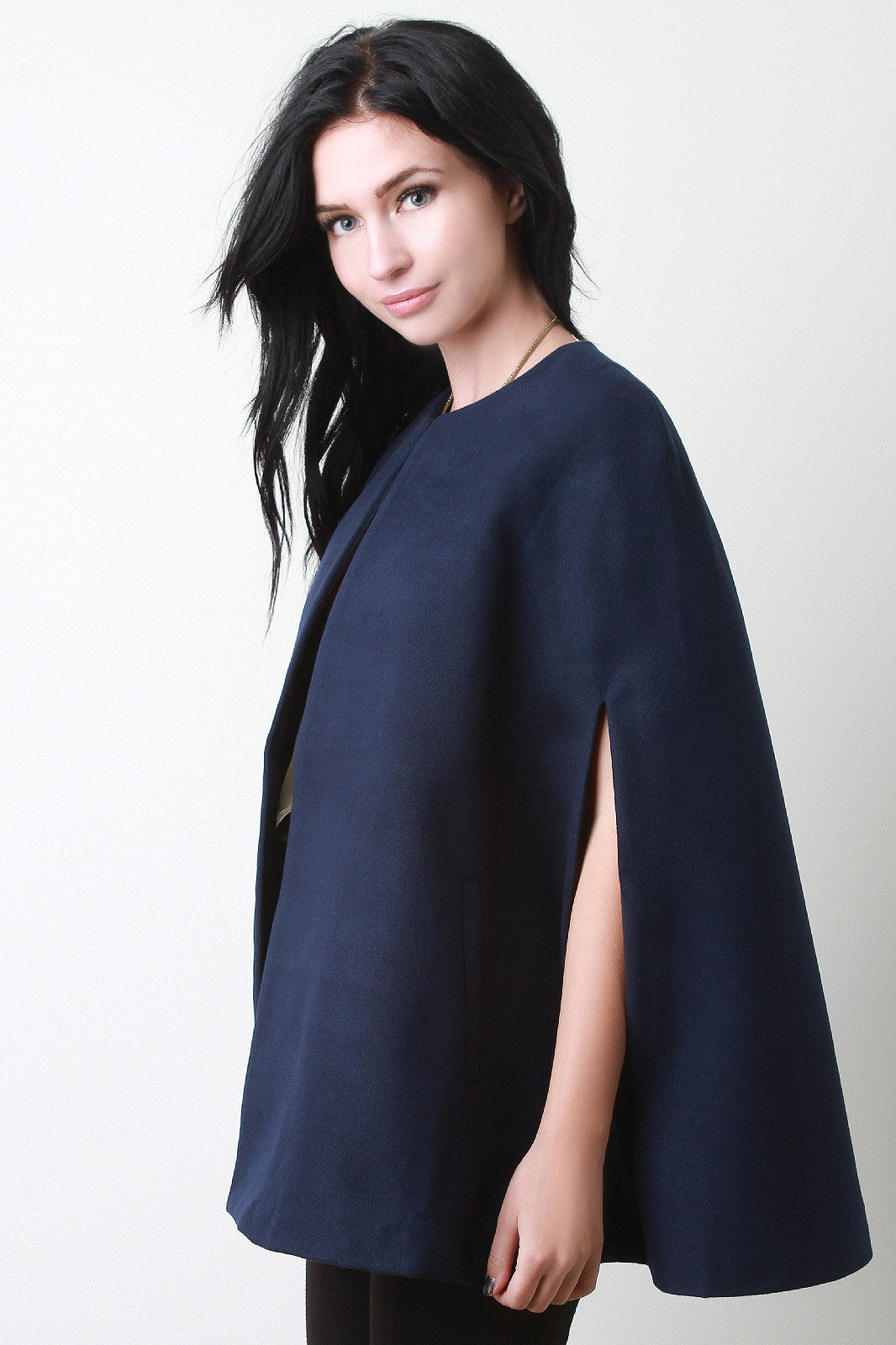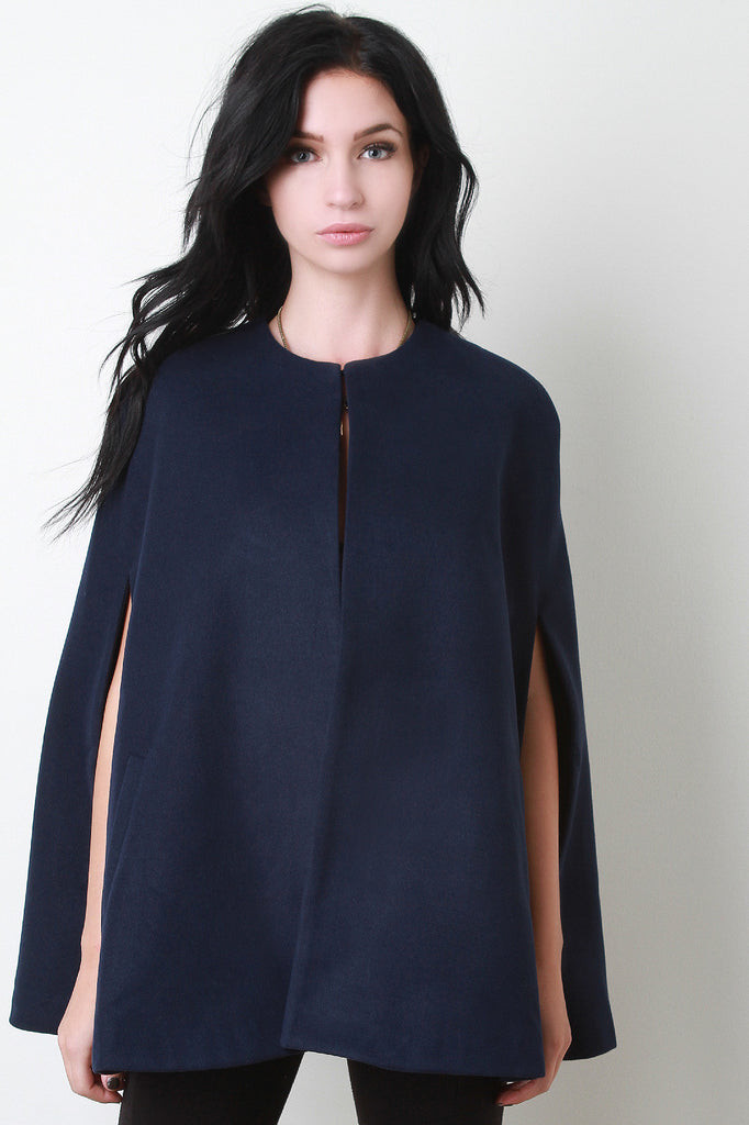 This chic cape features a seamless design, open front to a hook-n-eye closure at round neckline, armhole slits, side pockets, and fully lined. Accessories sold separately. 100% Polyester.