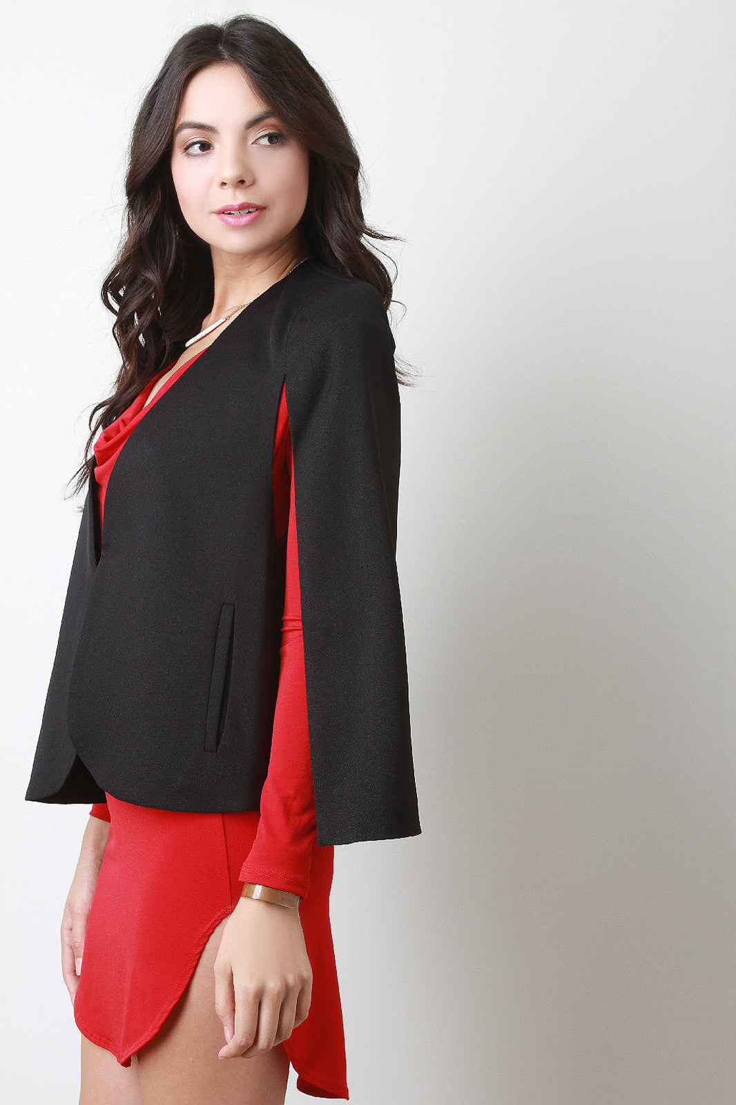 This trendy cape blazer features seamless design, open front, cape construction, armhole slits, side pockets, and fully lined. Accessories sold separately. 100% Polyester.