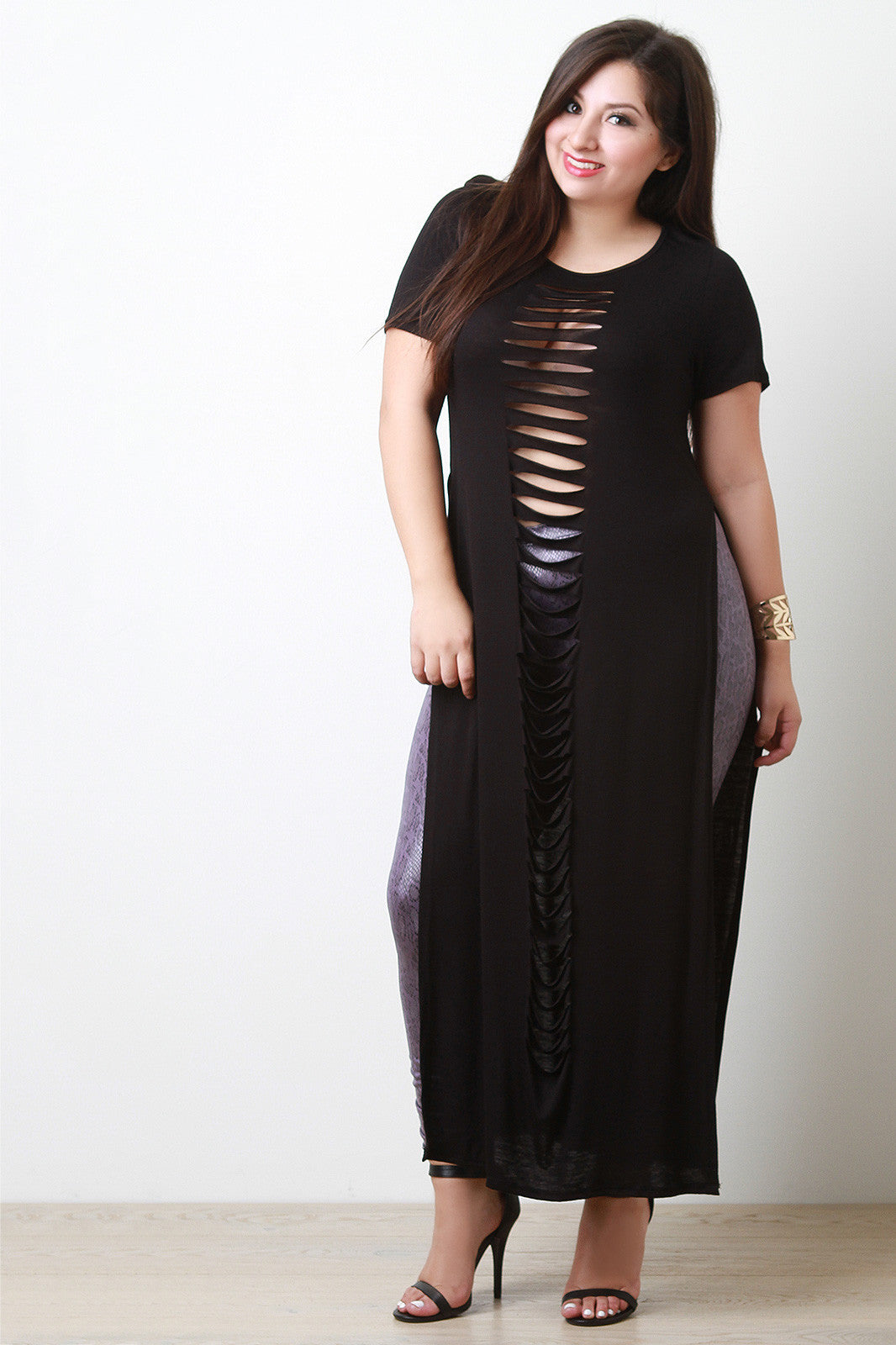 This plus size maxi top features a round neckline, short sleeves, slashed details, and deep side slits. Accessories sold separately. Made in U.S.A.95% Rayon, 5% Spandex.