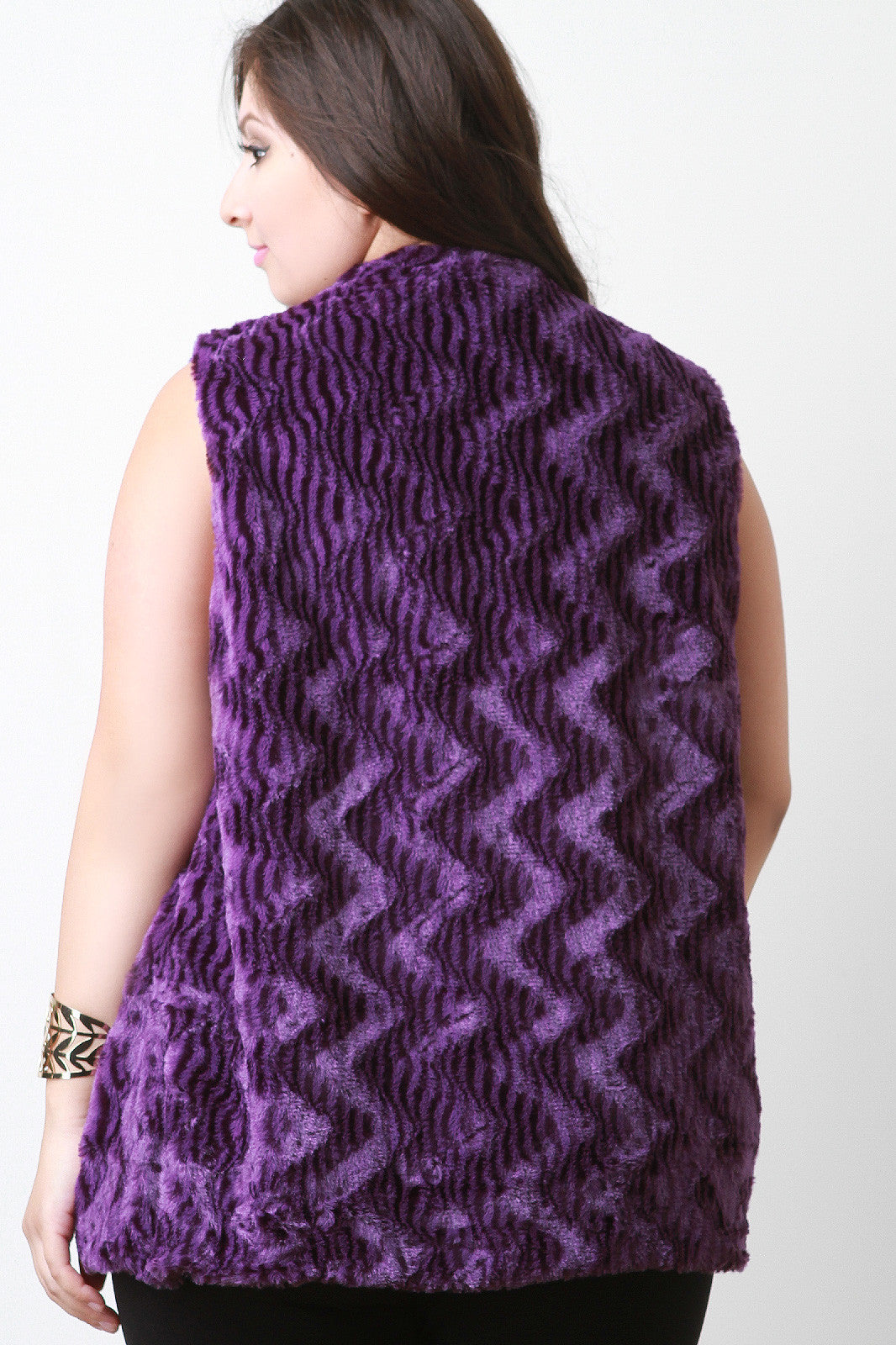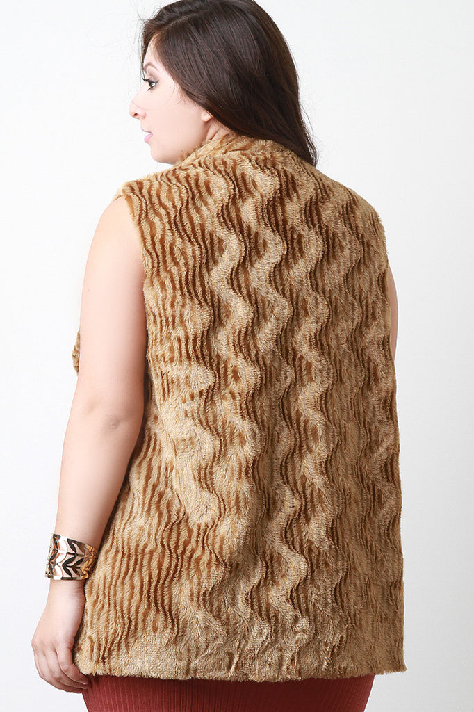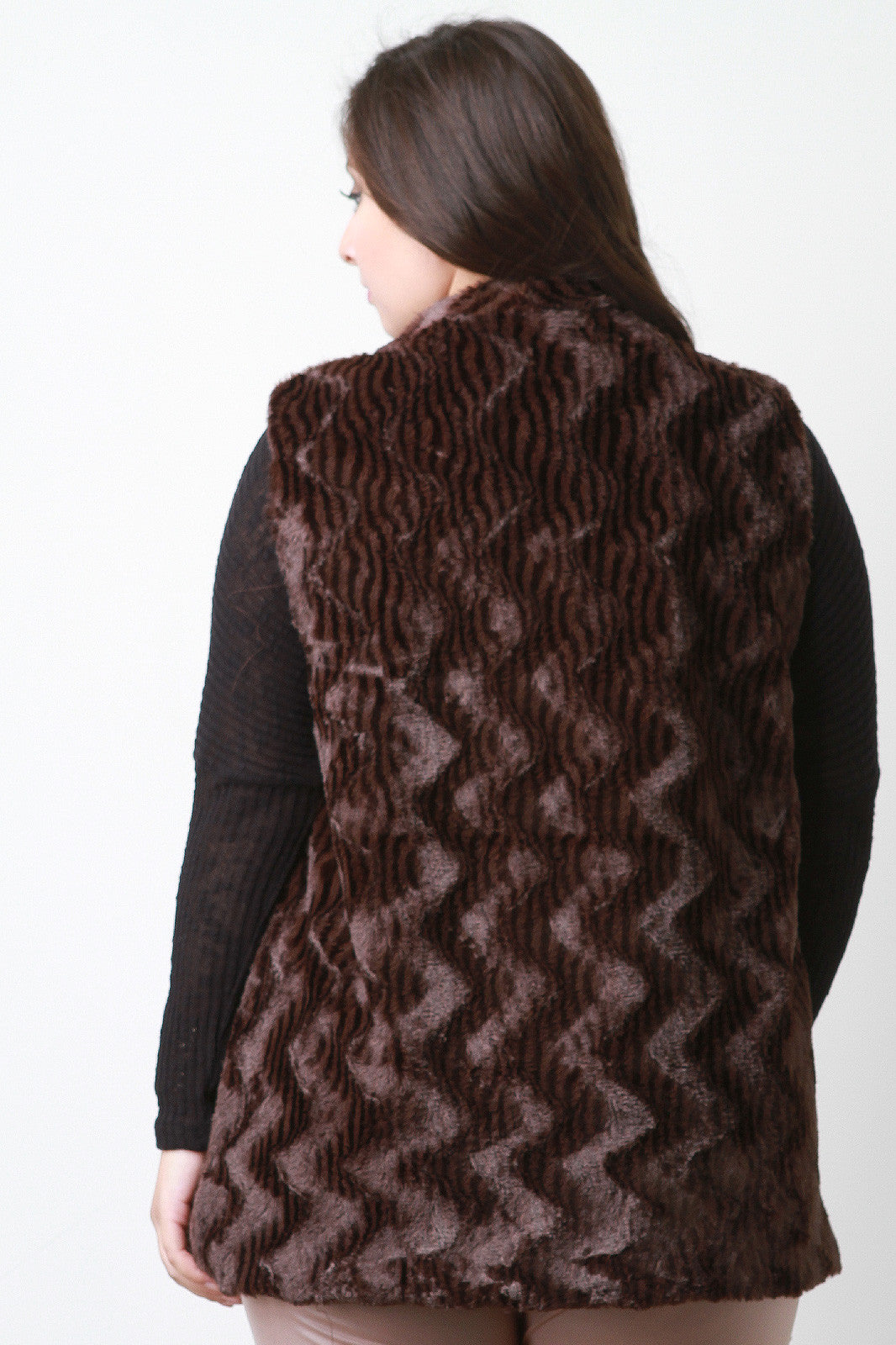 This plus size vest features a striped faux fur fabrication, open front with a flap collar, and fully lined. Accessories sold separately. 100% Polyester.