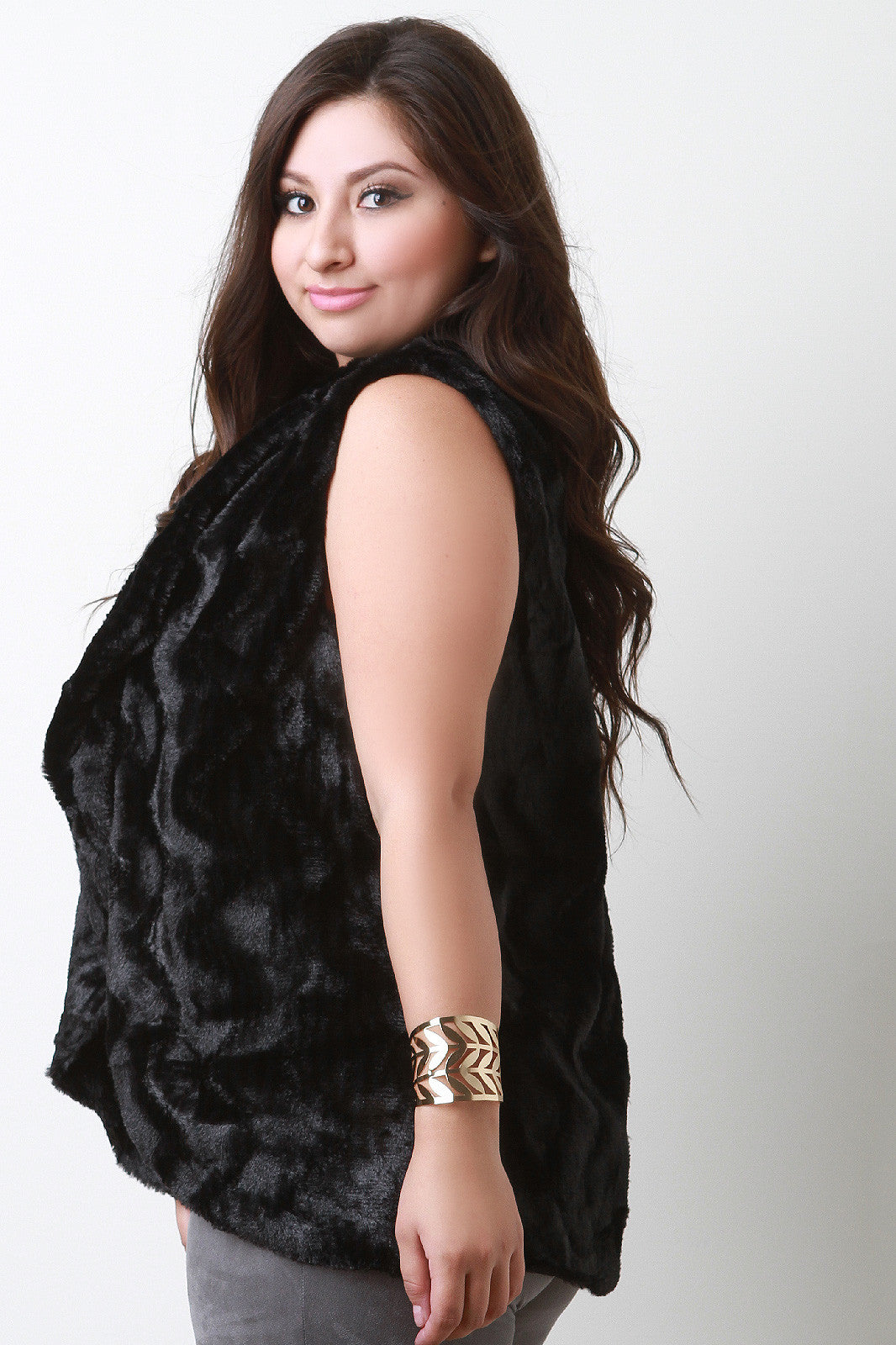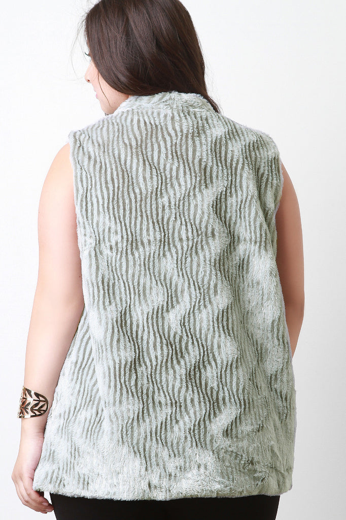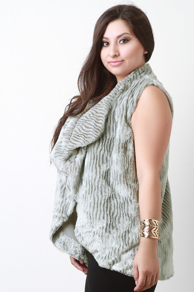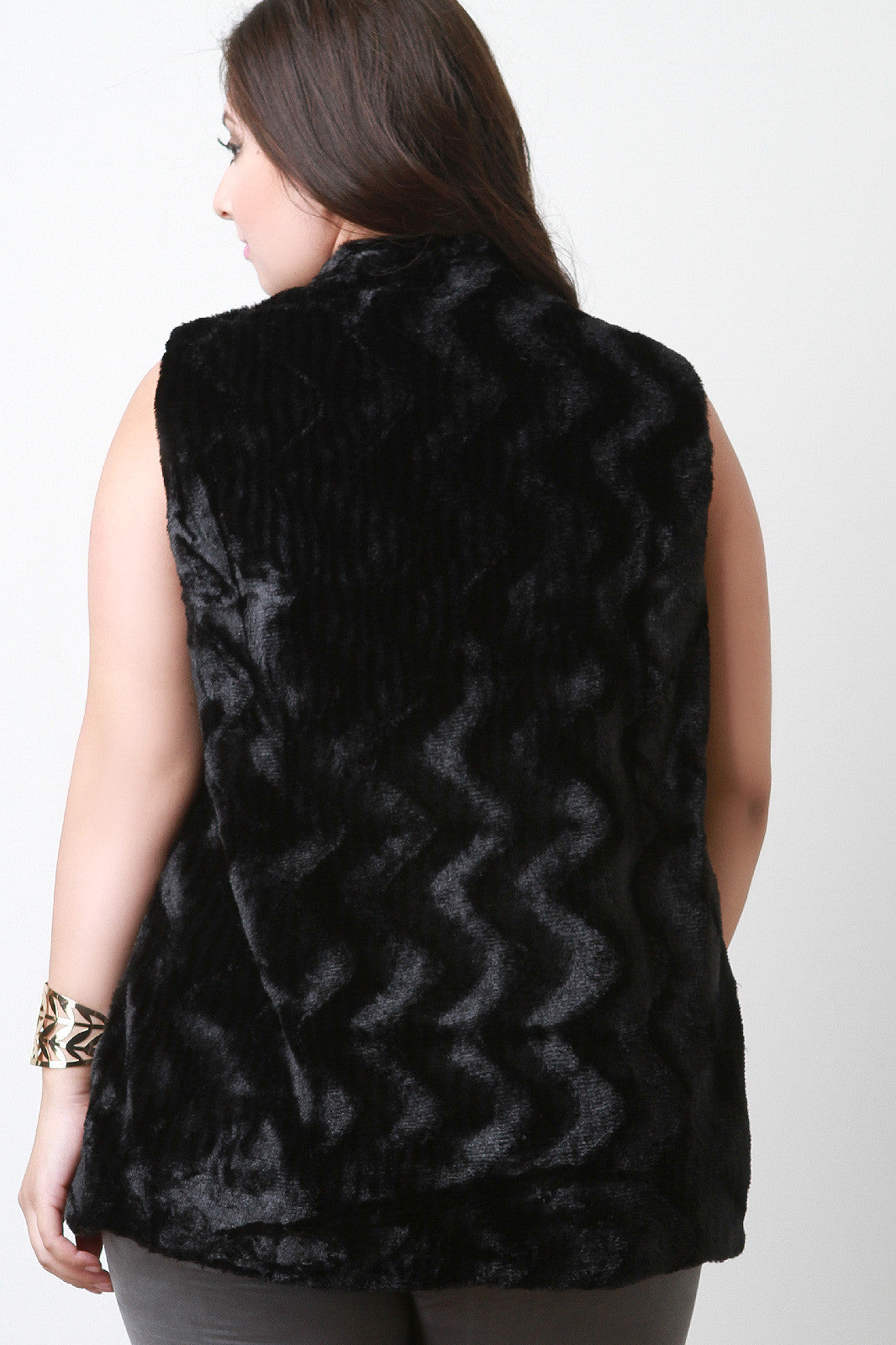 This plus size vest features a striped faux fur fabrication, open front with a flap collar, and fully lined. Accessories sold separately. 100% Polyester.