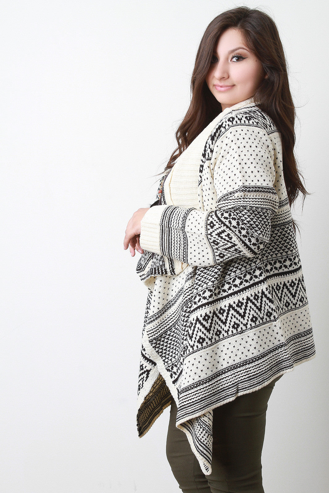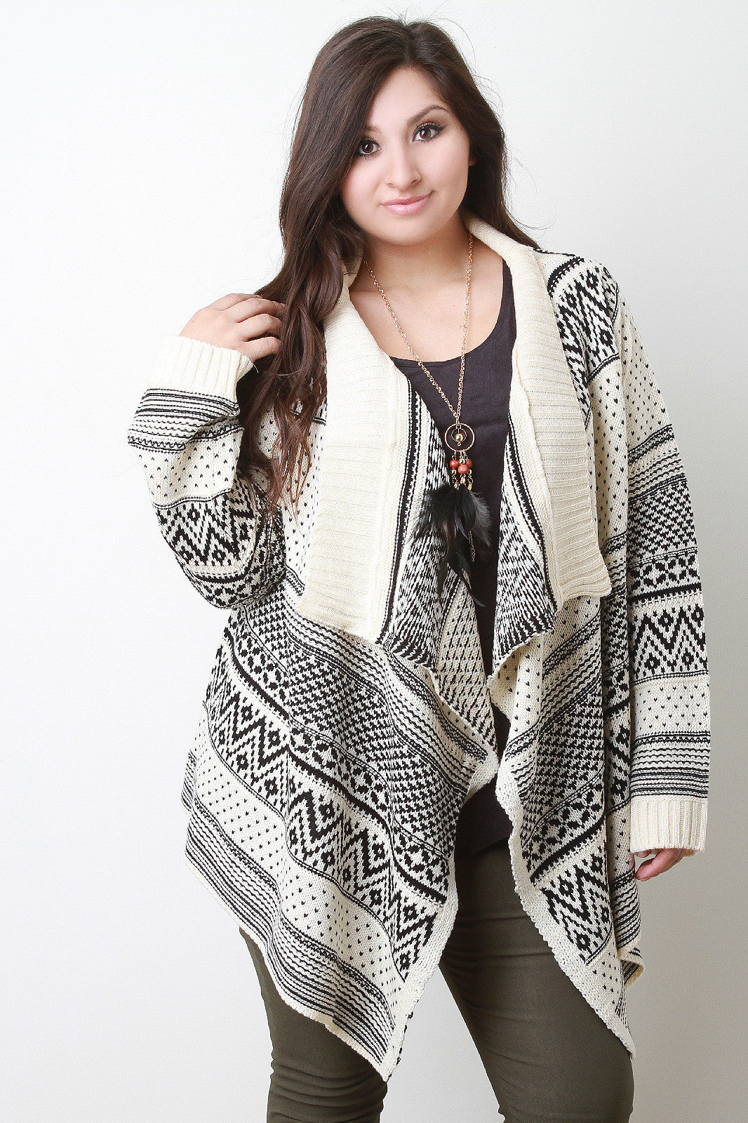 A plus size open front cardigan featuring a cozy tribal knit pattern, splayed ribbed collar, long roomy sleeves, and a handkerchief hemline. Accessories sold separately. 100% Acrylic.
