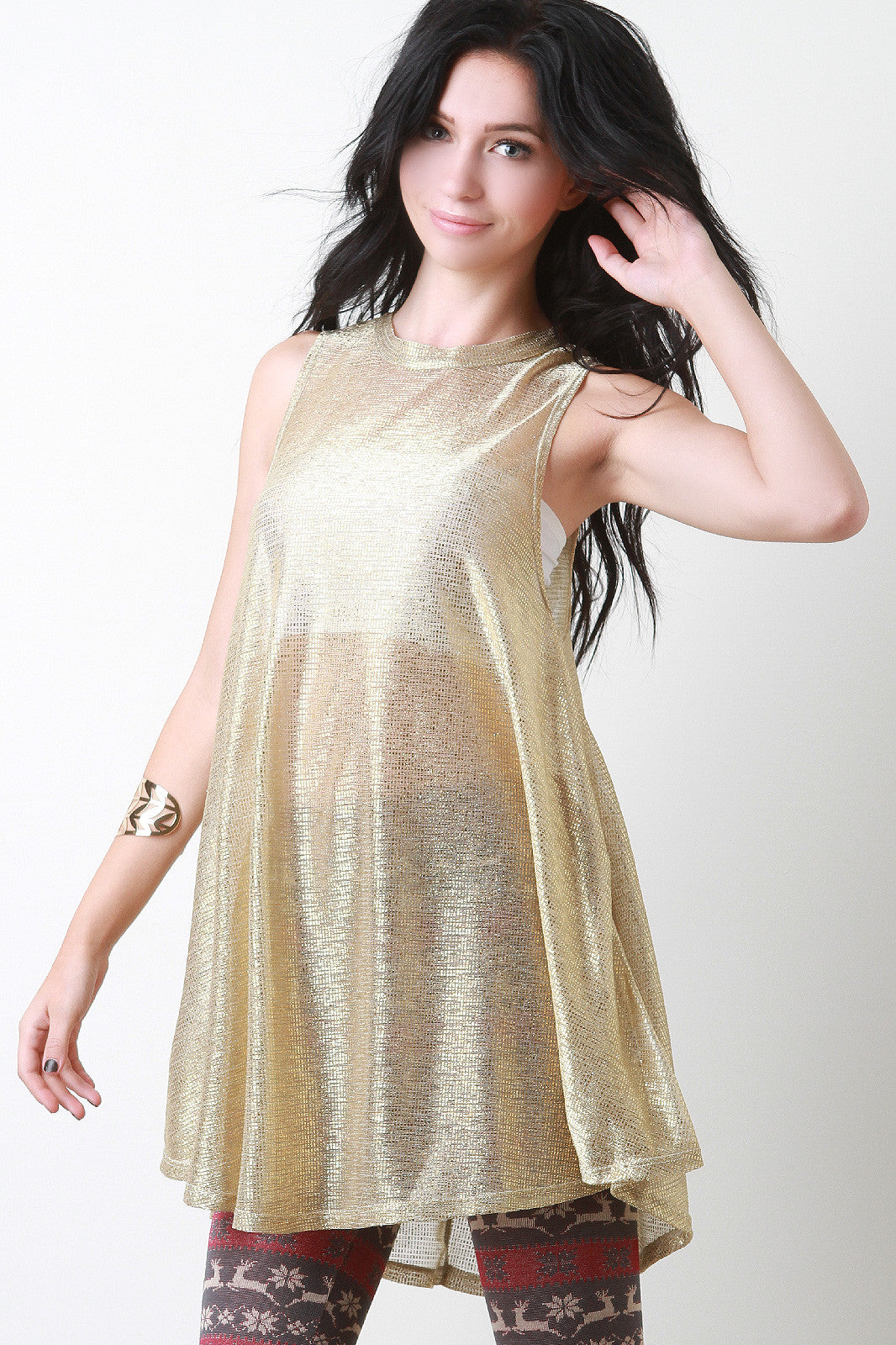 A sleeveless open back . Accessories sold separately. Made in U.S.A. 100% Polyester With Foil.
