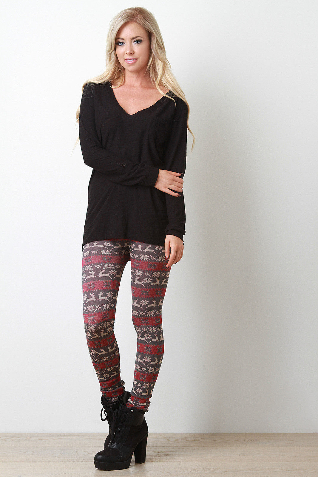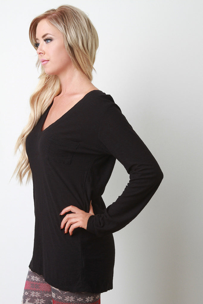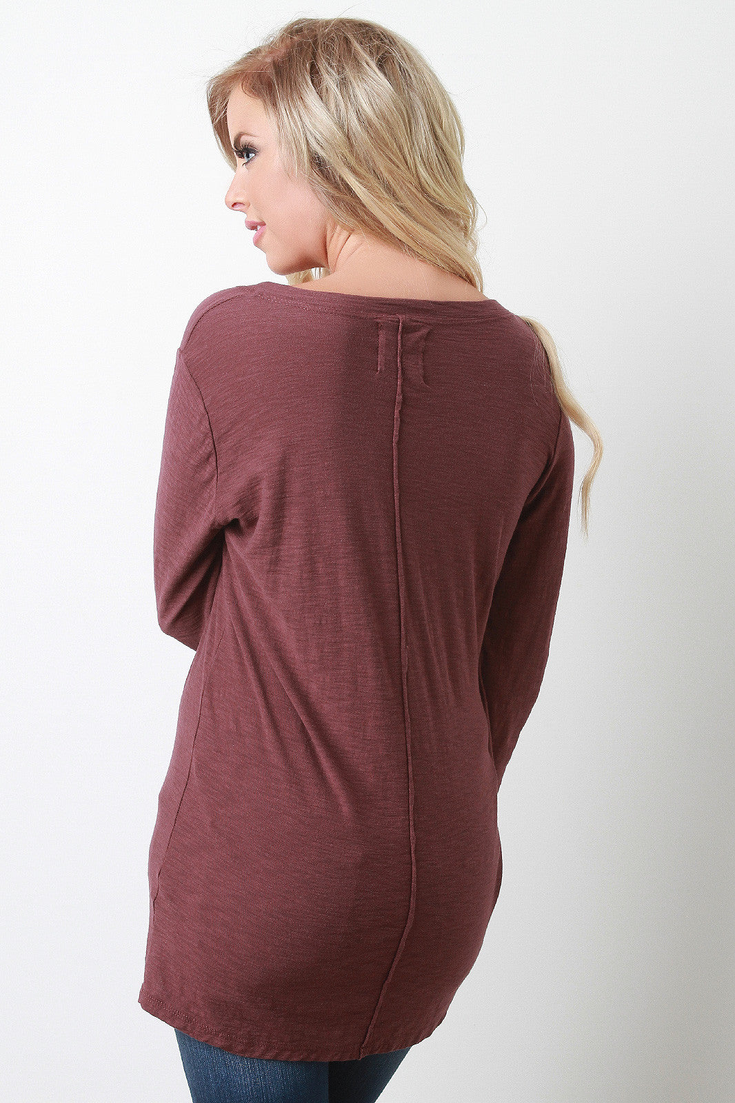 This casual top features a v-neckline, left breast pocket, long sleeves, and finished with raw center seam at rear. Accessories sold separately. Made in U.S.A. 50% Cotton, 50% Modal.