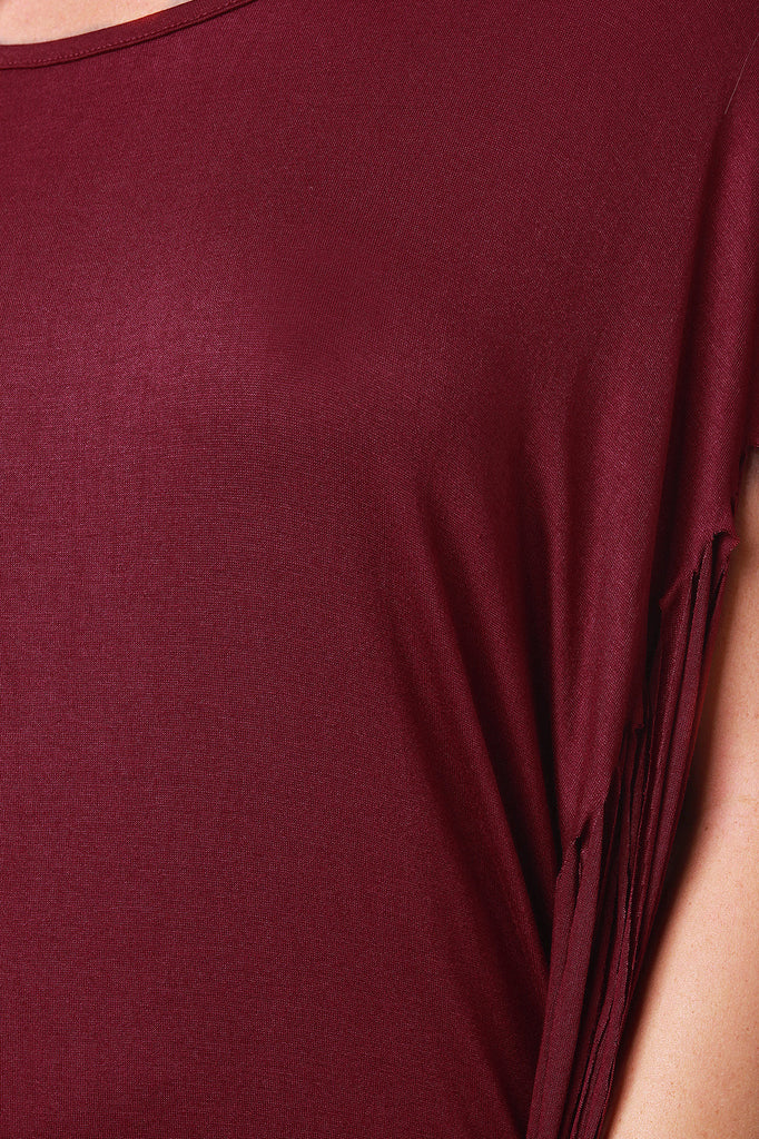 This poncho fringe design, and deep-v back with strap detail. Accessories sold separately. Made in U.S.A. 95% Rayon, 5% Spandex.