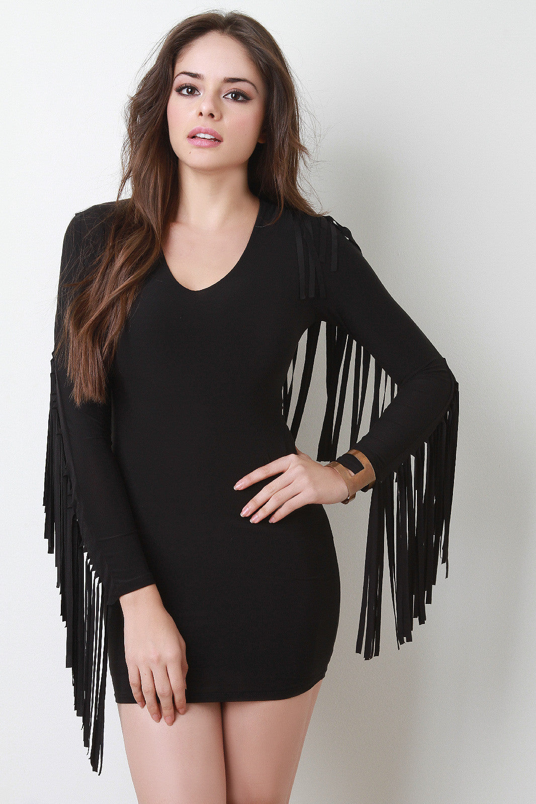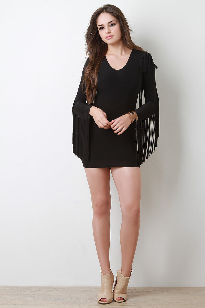 This mini dress features a v-neckline, long sleeves with cascading fringe construction, stretchy sculpture fit, and fully lined. Accessories sold separately. Made in U.S.A. 96% Polyester, 4% Spandex.