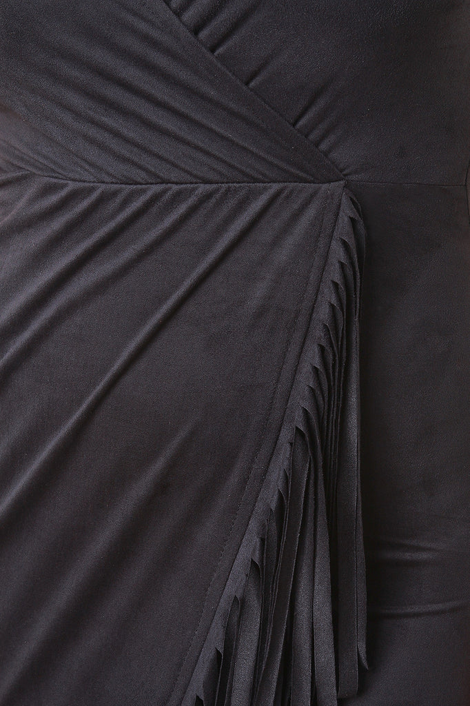 This sleeveless dress features a v-neck surplice construction, cinched high waisted seam, asymmetrical maxi hemline with cascading fringe accent. Accessories sold separately. Made in U.S.A. 95% Polyester, 5% Spandex.