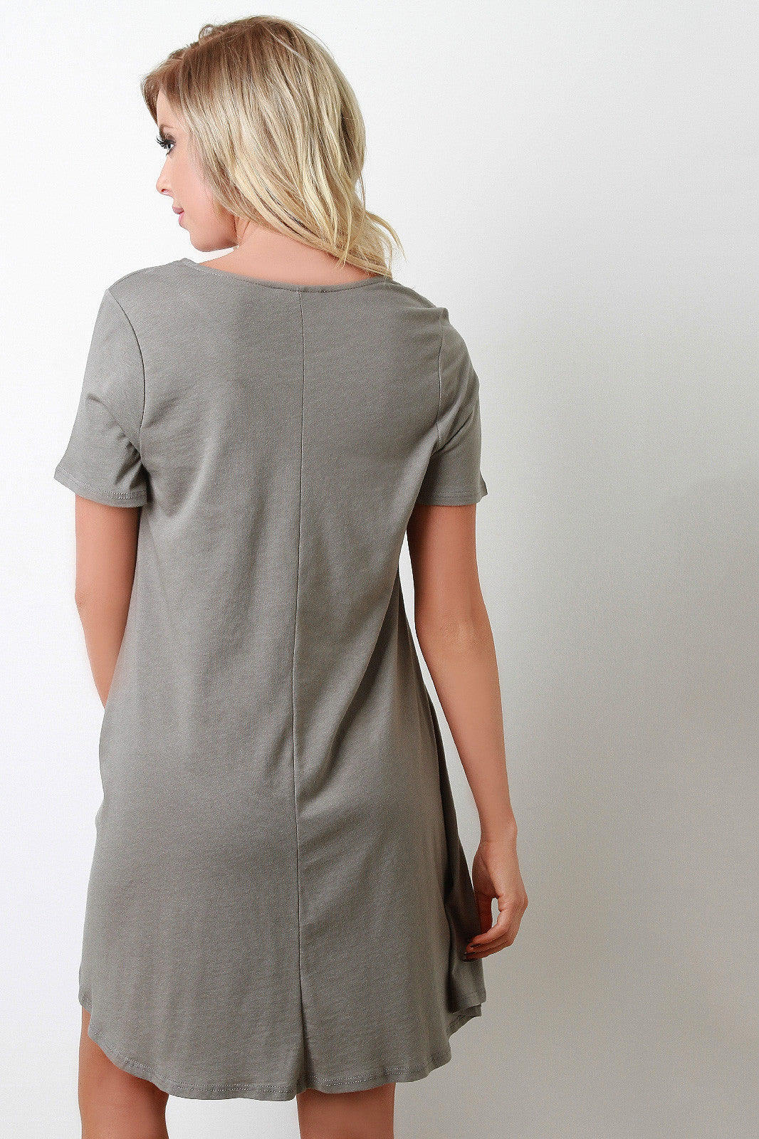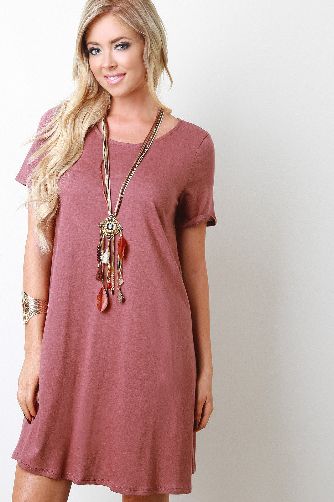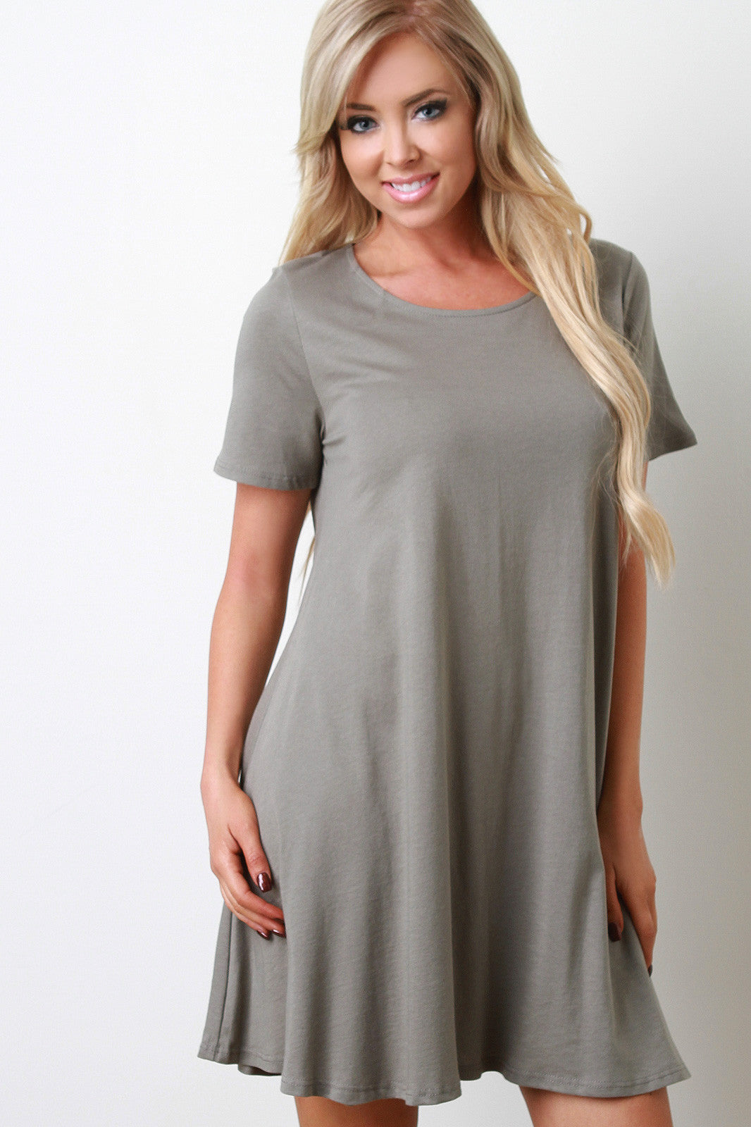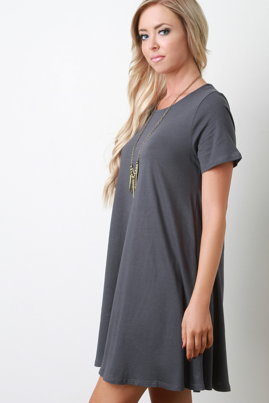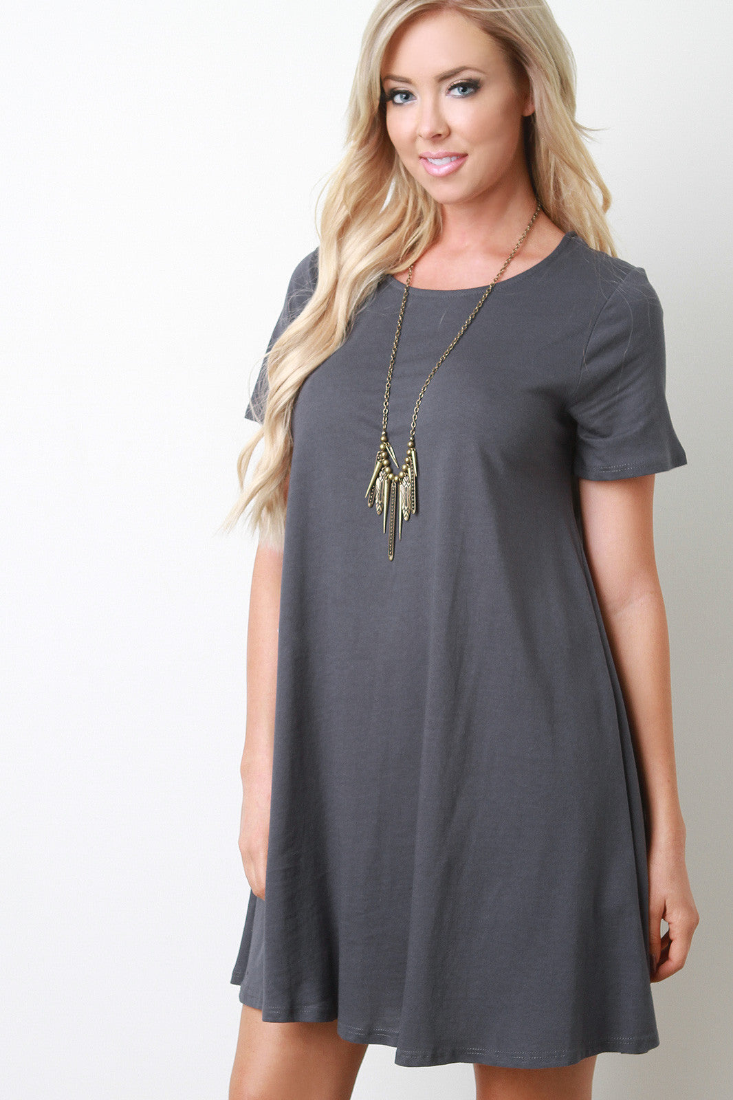 This casual shift dress features a round neckline, short sleeves, and stitching accents. Accessories sold separately. Made in U.S.A. 50% Rayon, 50% Modal.