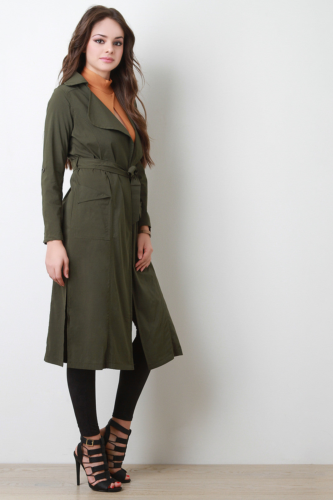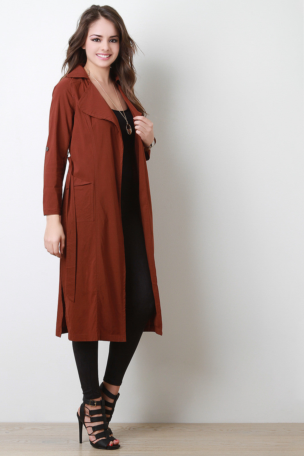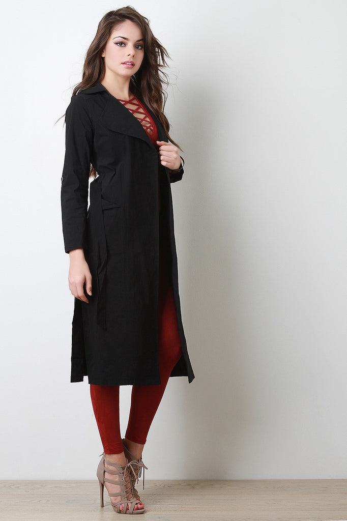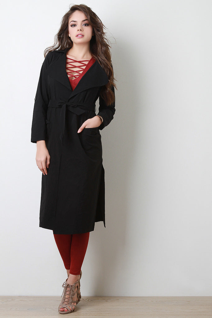 This longline jacket features an oversized notched collar design, long sleeves, two front pockets, self-tie sash at waist, and slit details. Accessories sold separately. 85% Cotton, 10% Nylon, 5% Spandex.