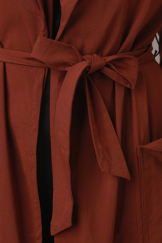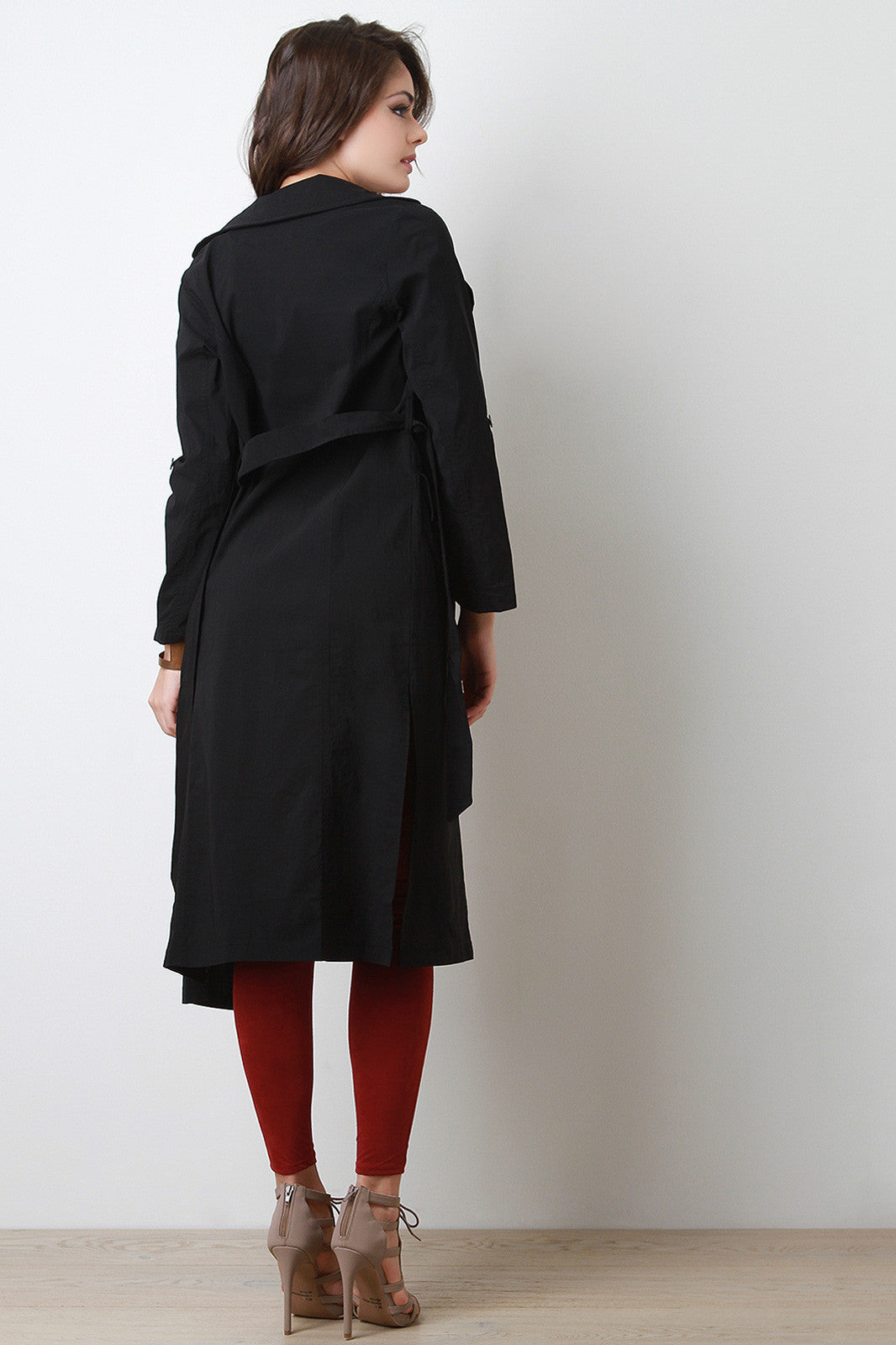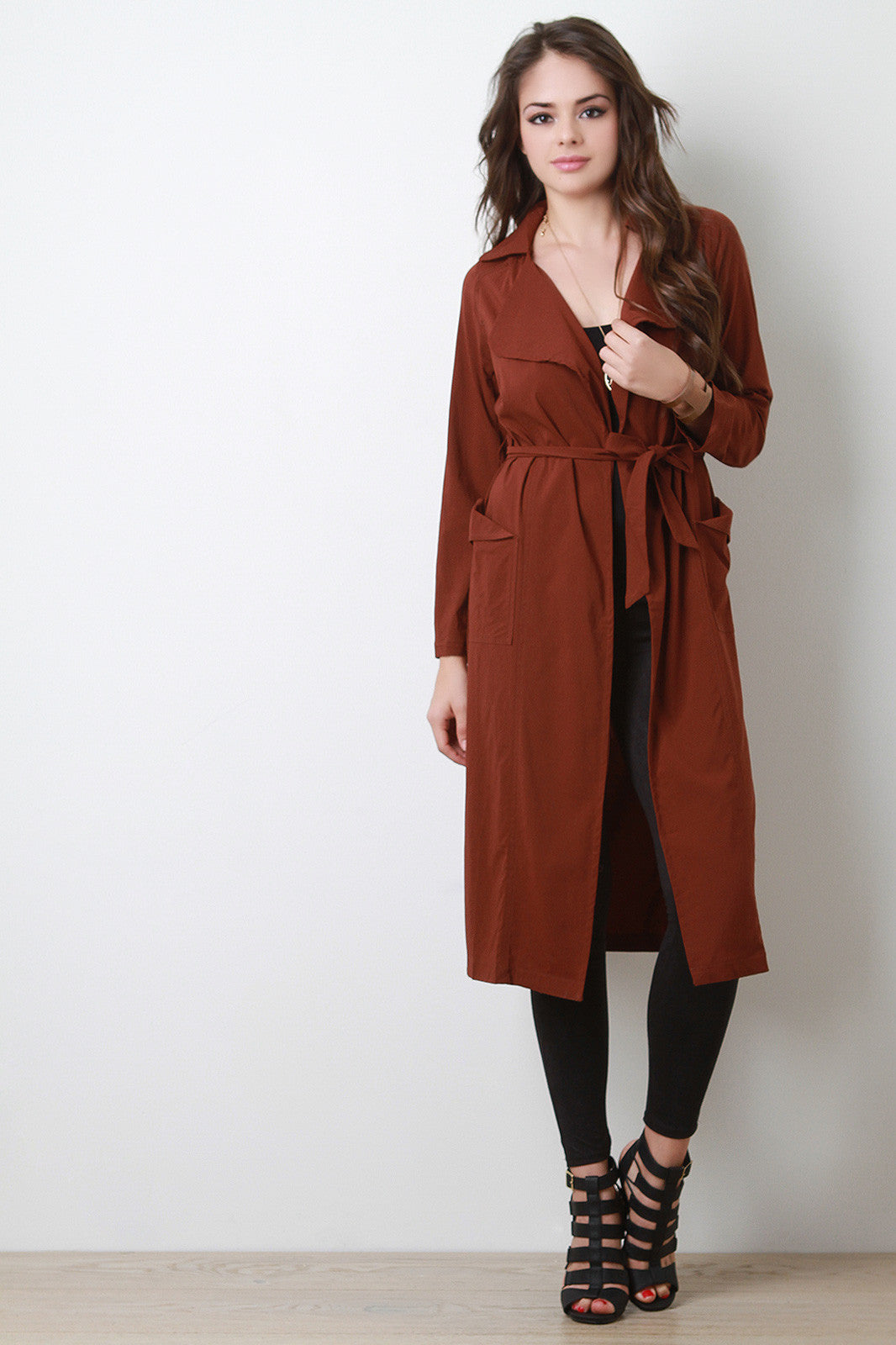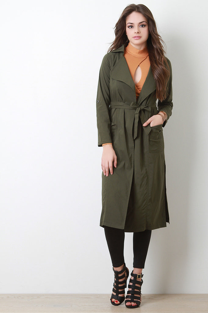 This longline jacket features an oversized notched collar design, long sleeves, two front pockets, self-tie sash at waist, and slit details. Accessories sold separately. 85% Cotton, 10% Nylon, 5% Spandex.