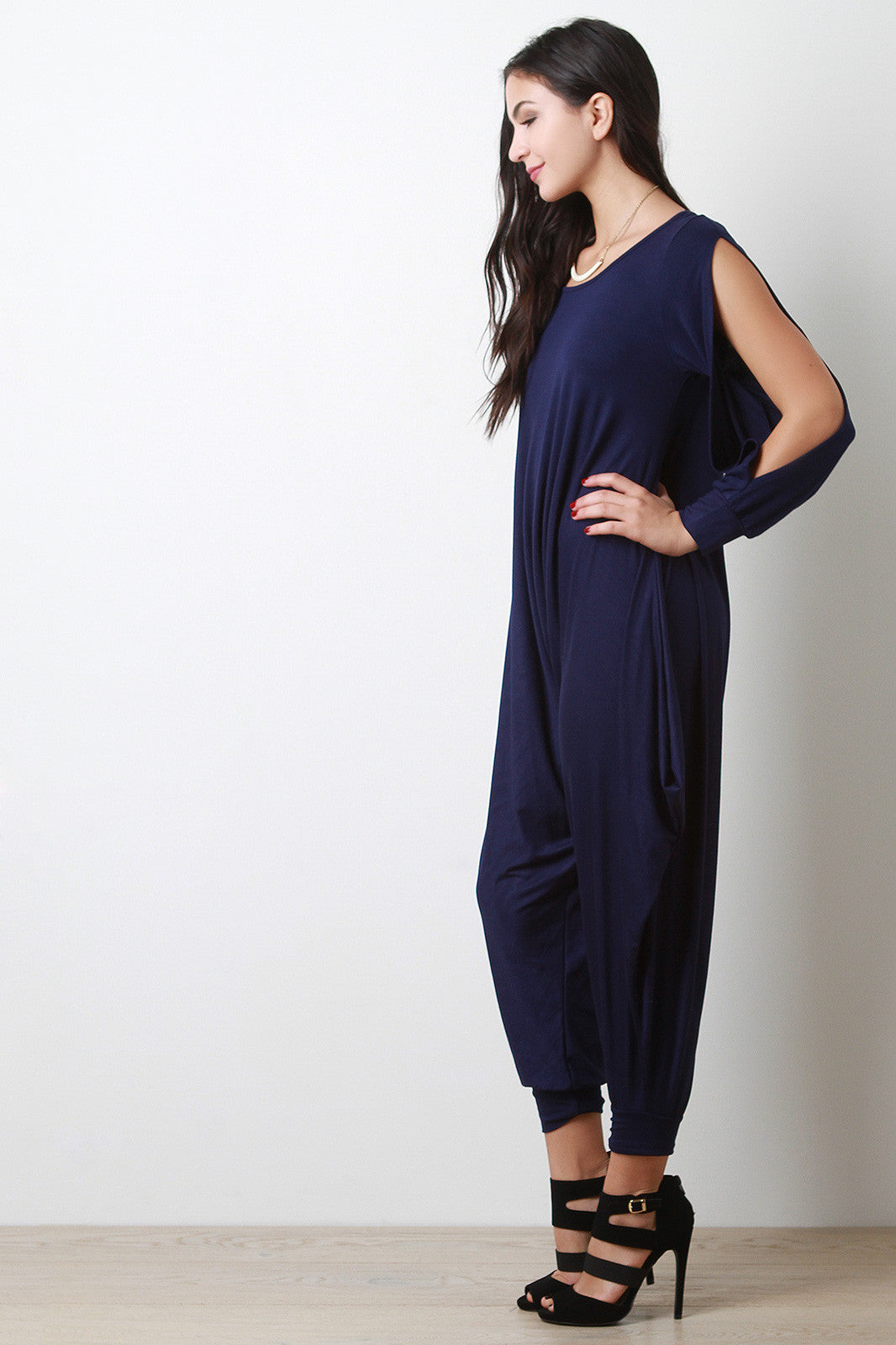 This jumpsuit features a jersey knit fabrication, a round neckline, and draping harem pants bottom. The long sleeves have an opening along the arm starting from the shoulder down to the arm cuff. Accessories sold separately. Made in U.S.A. 96% Rayon, 4% Spandex.