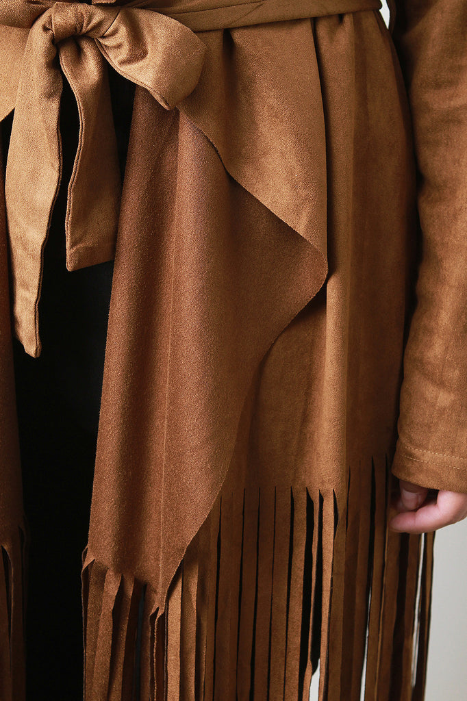This vegan suede plus size trench coat features a draped open front design with self-tie sash, long sleeves, and fringe hemline. Accessories sold separately. 100% Polyester.