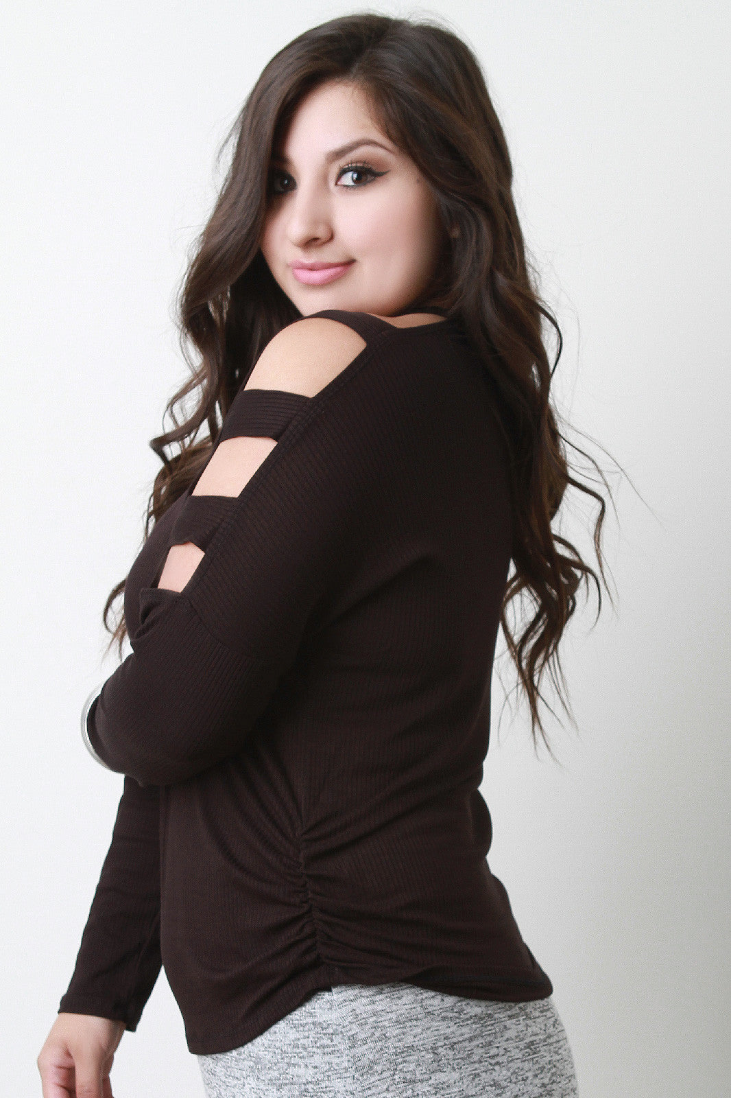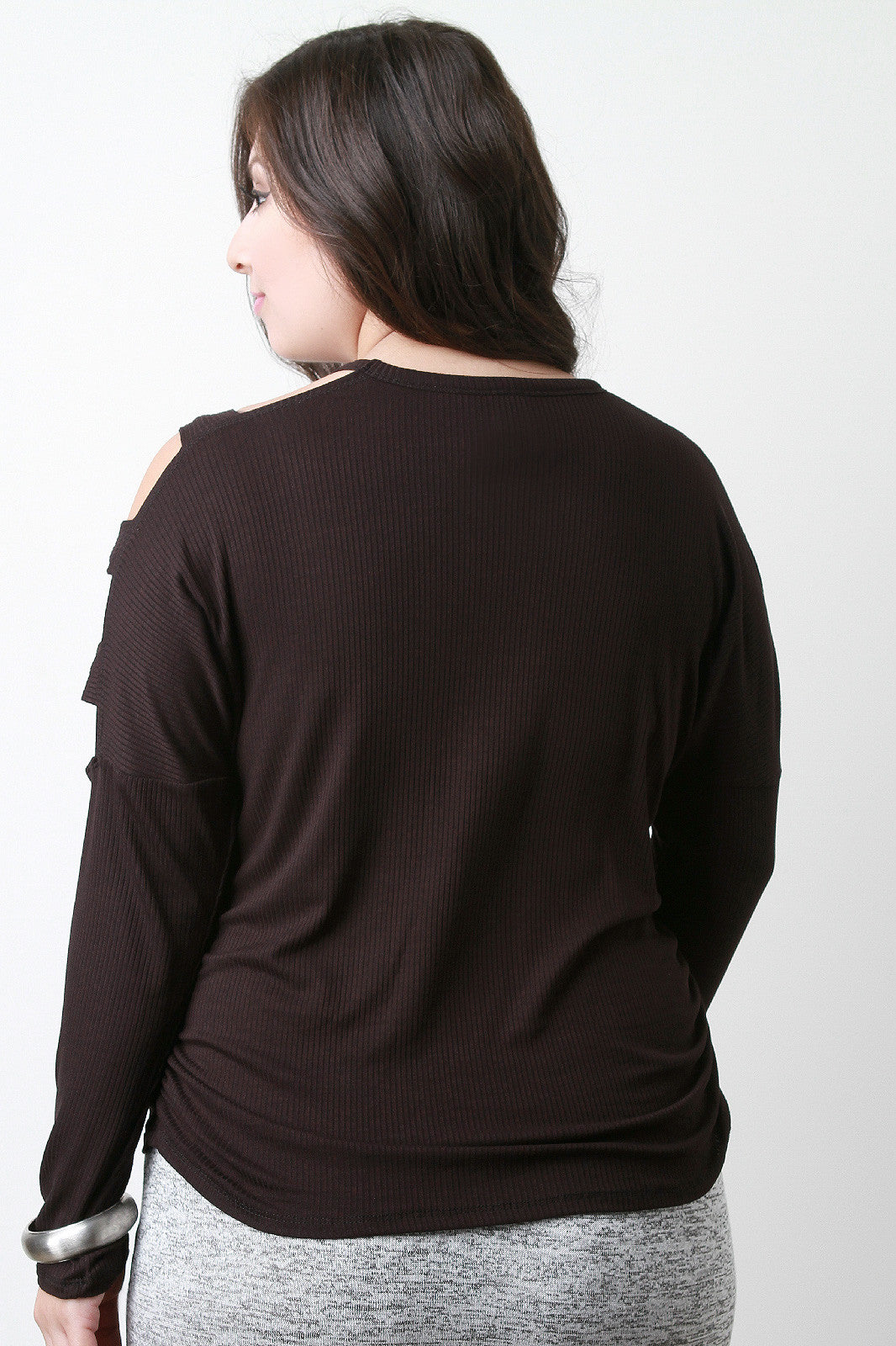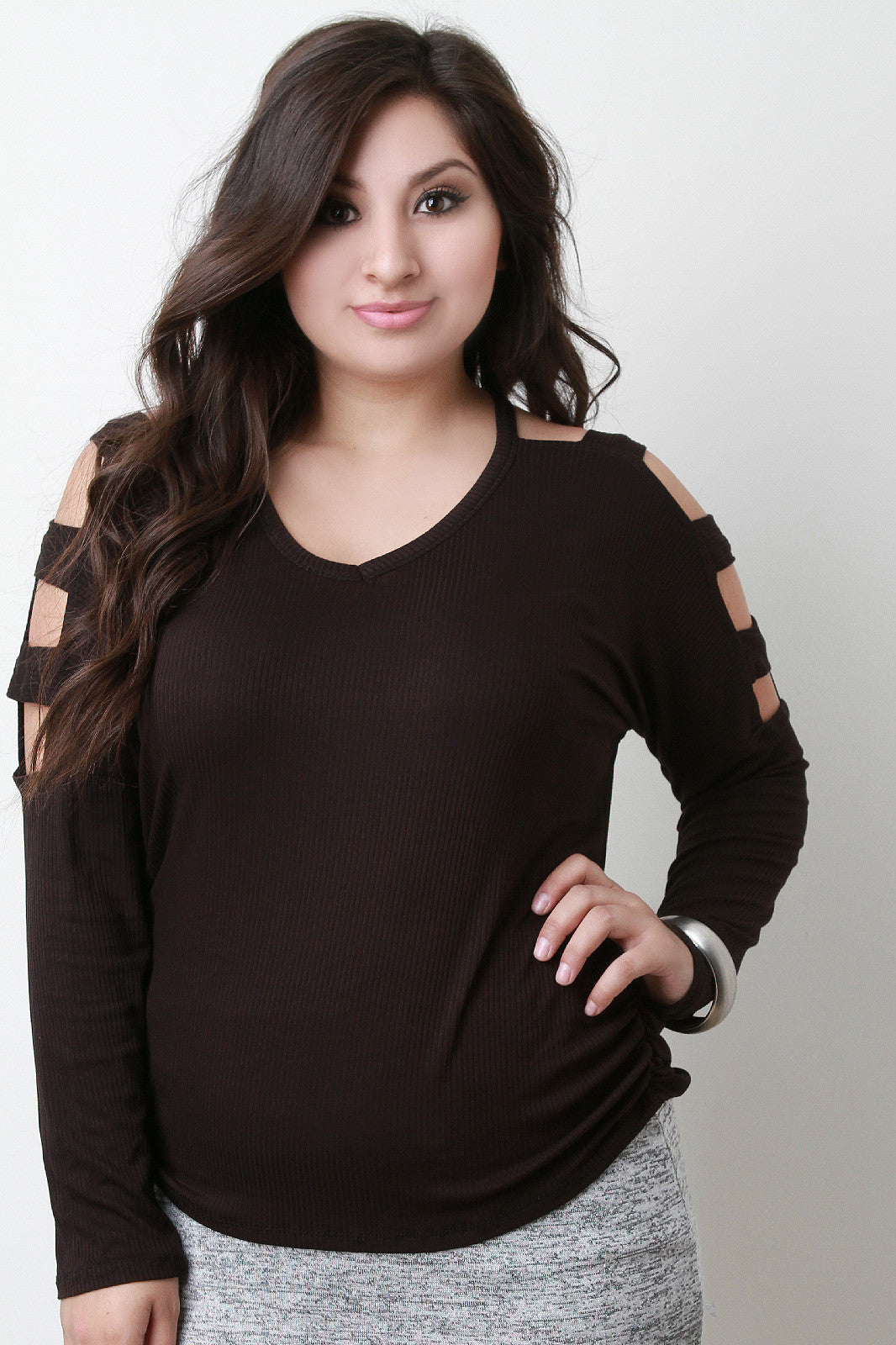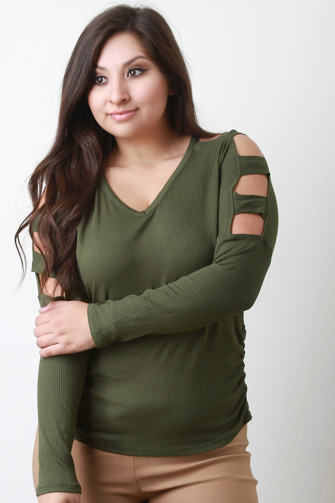 A plus size v-neck top featuring ribbed jersey knit, long fitted sleeves, and dropped cutout shoulders design. Finished with ruched side accent. Accessories sold separately. 97% Polyester, 3% Spandex.