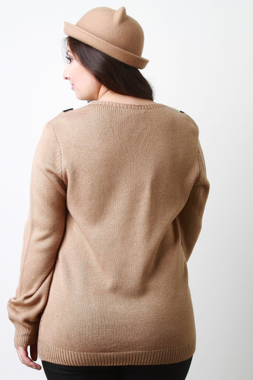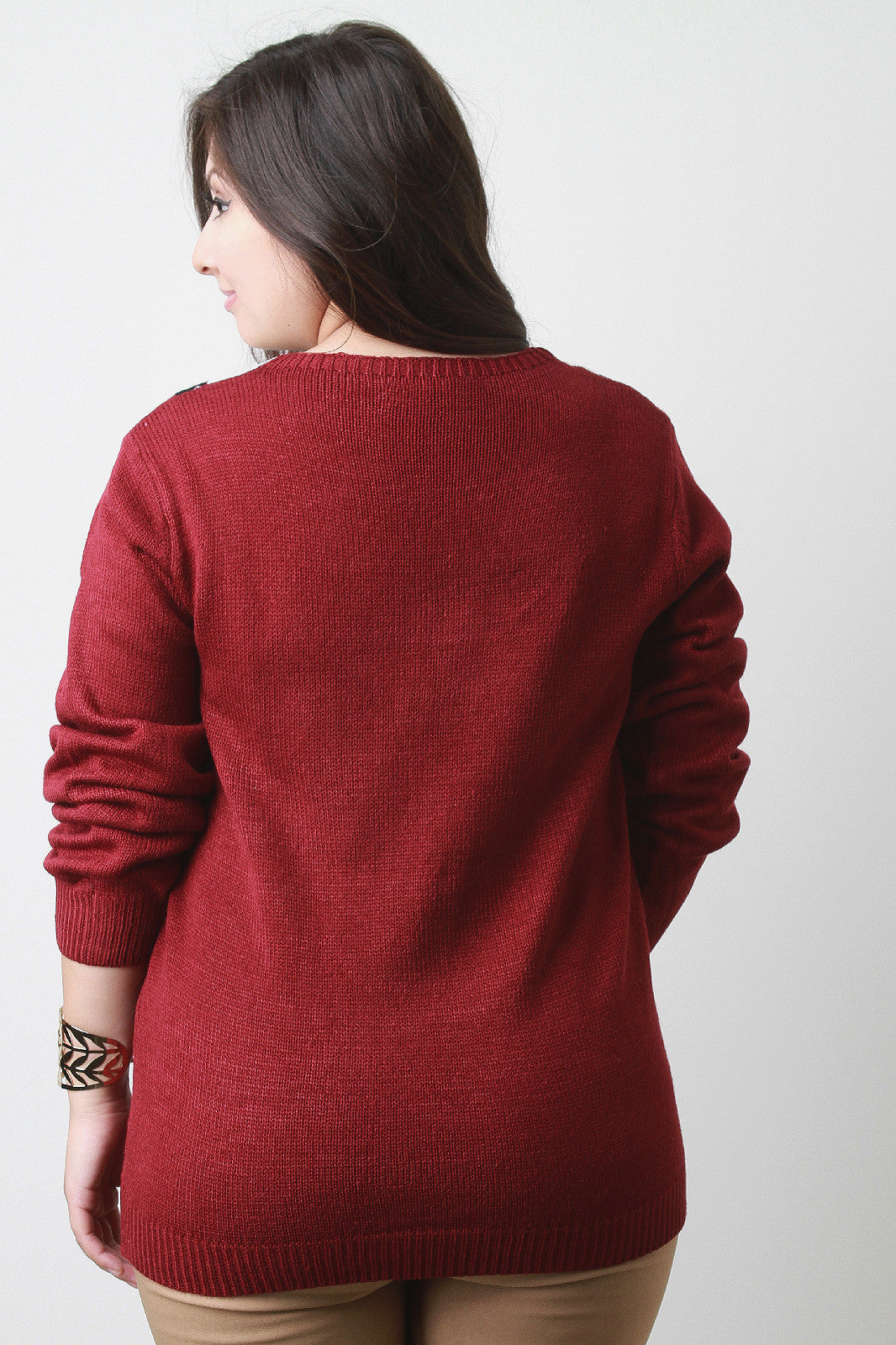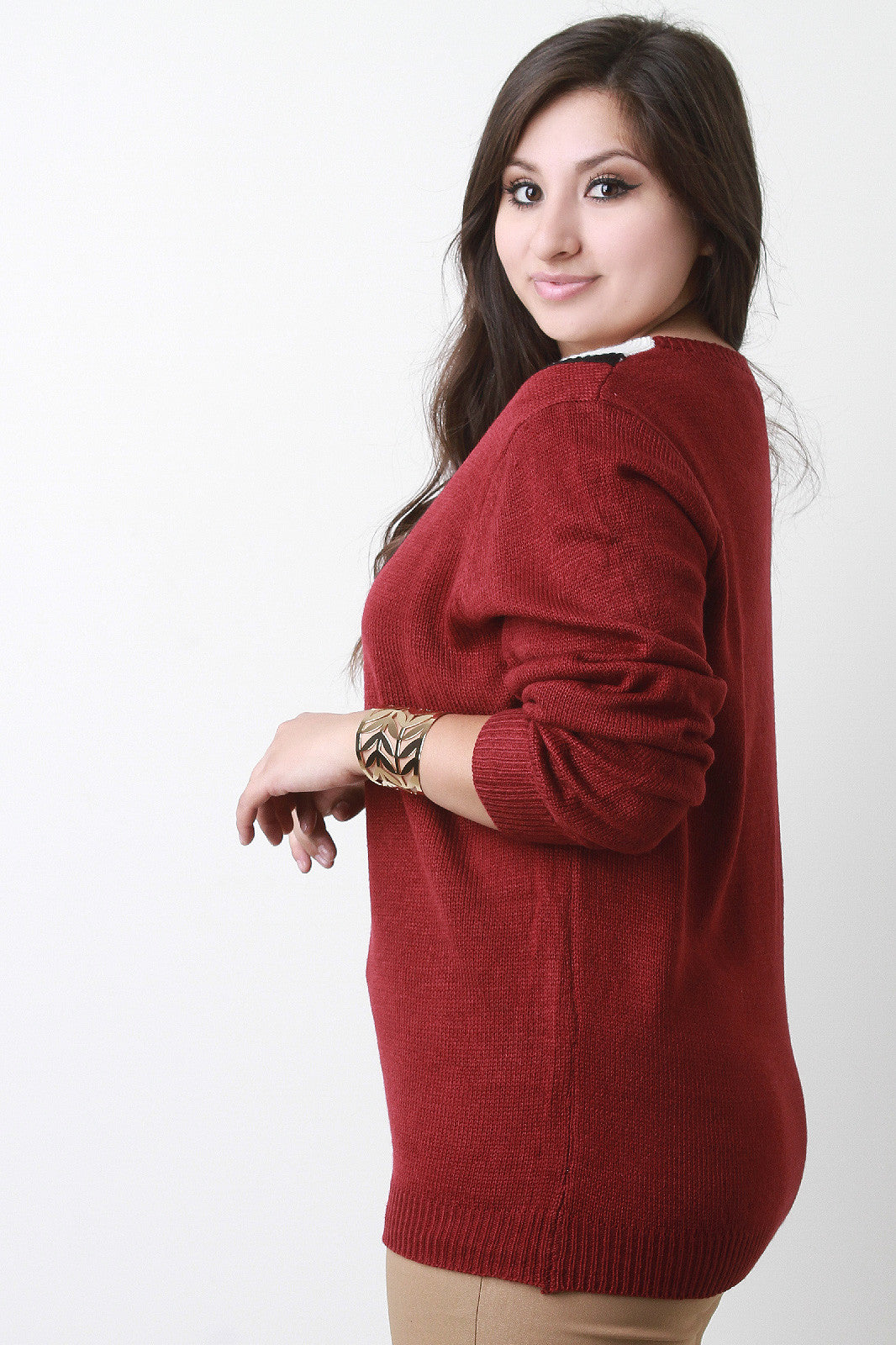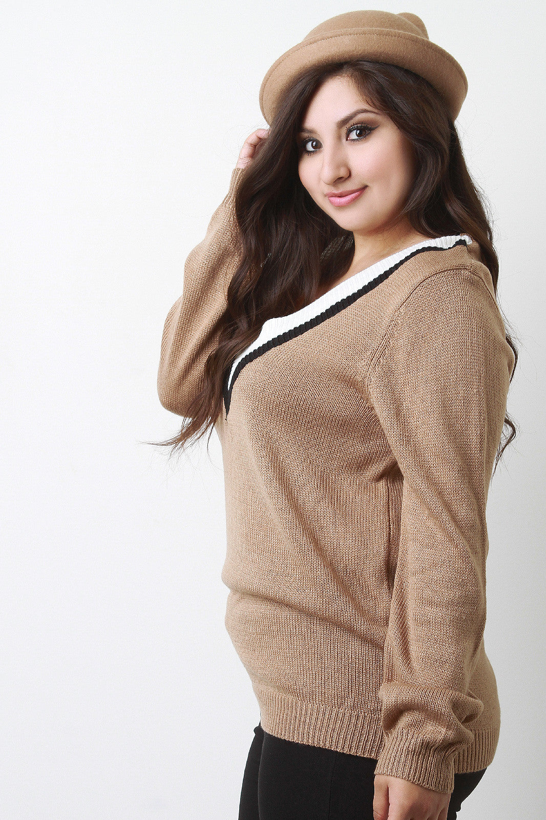 A plus size sweater top featuring a striped v-neck design, long sleeves, and ribbed hems. Accessories sold separately. 100% Polyester.