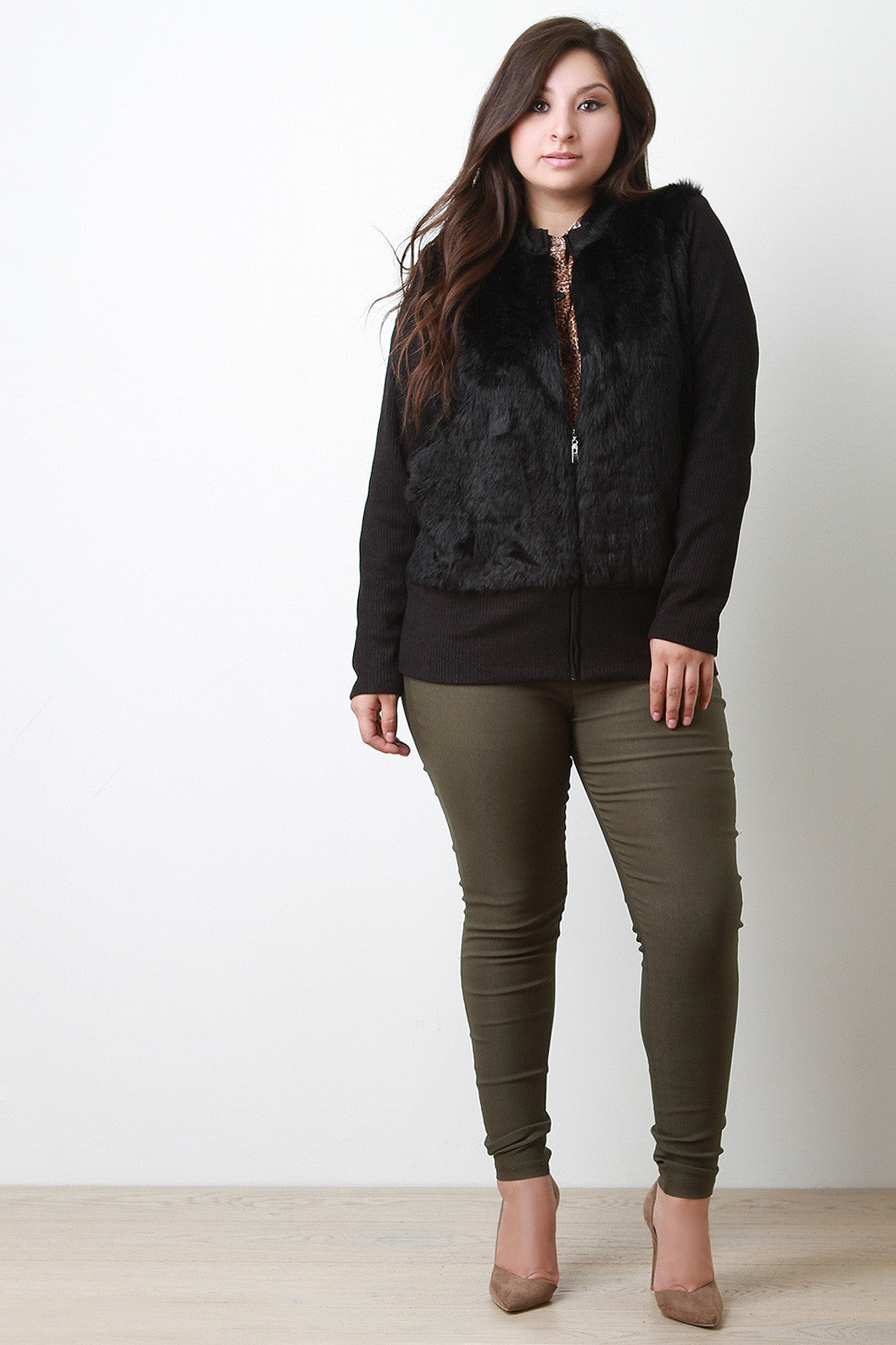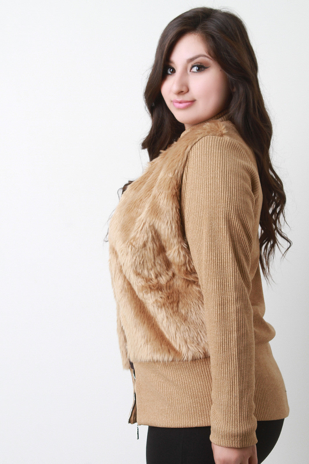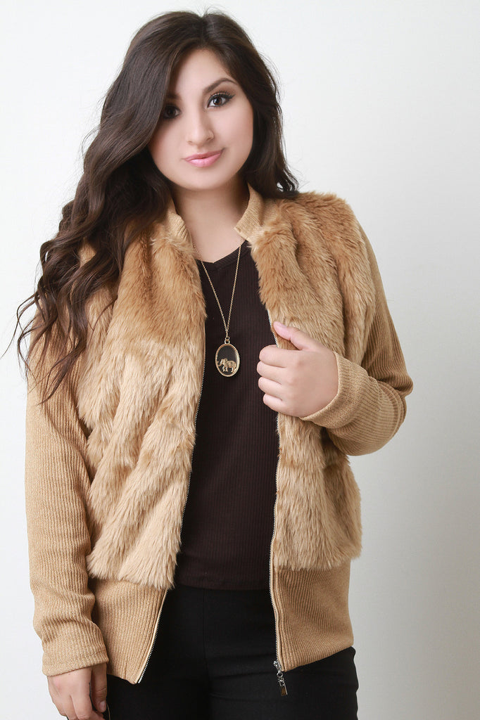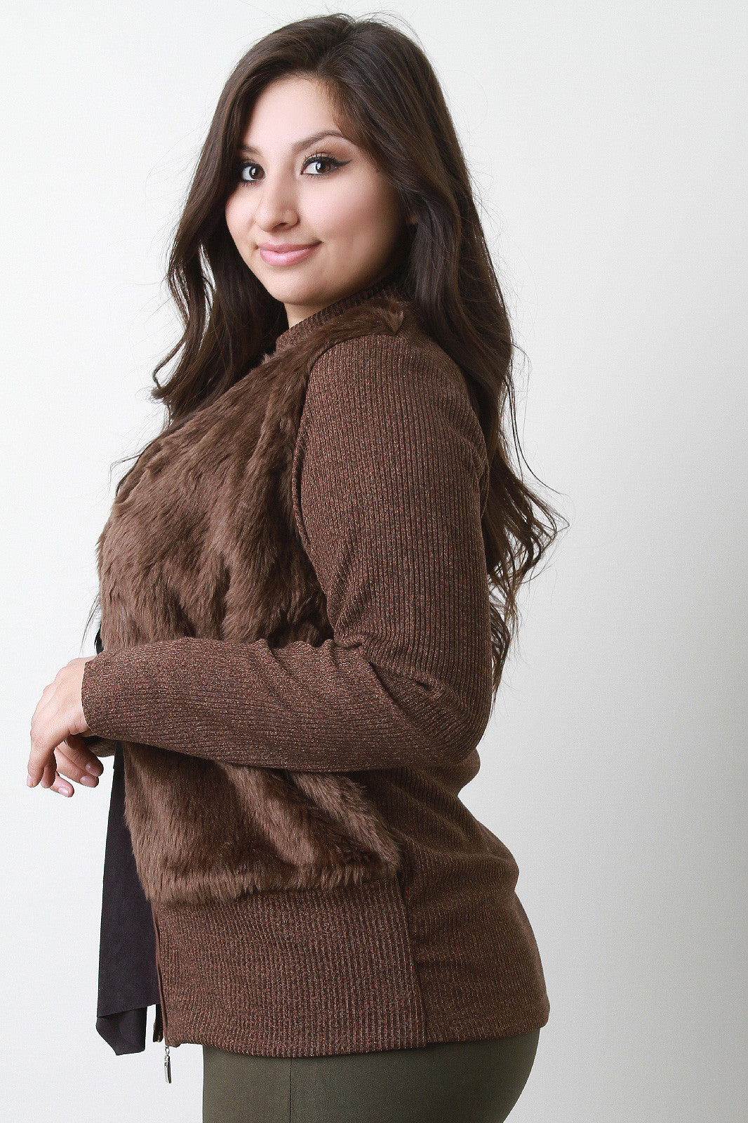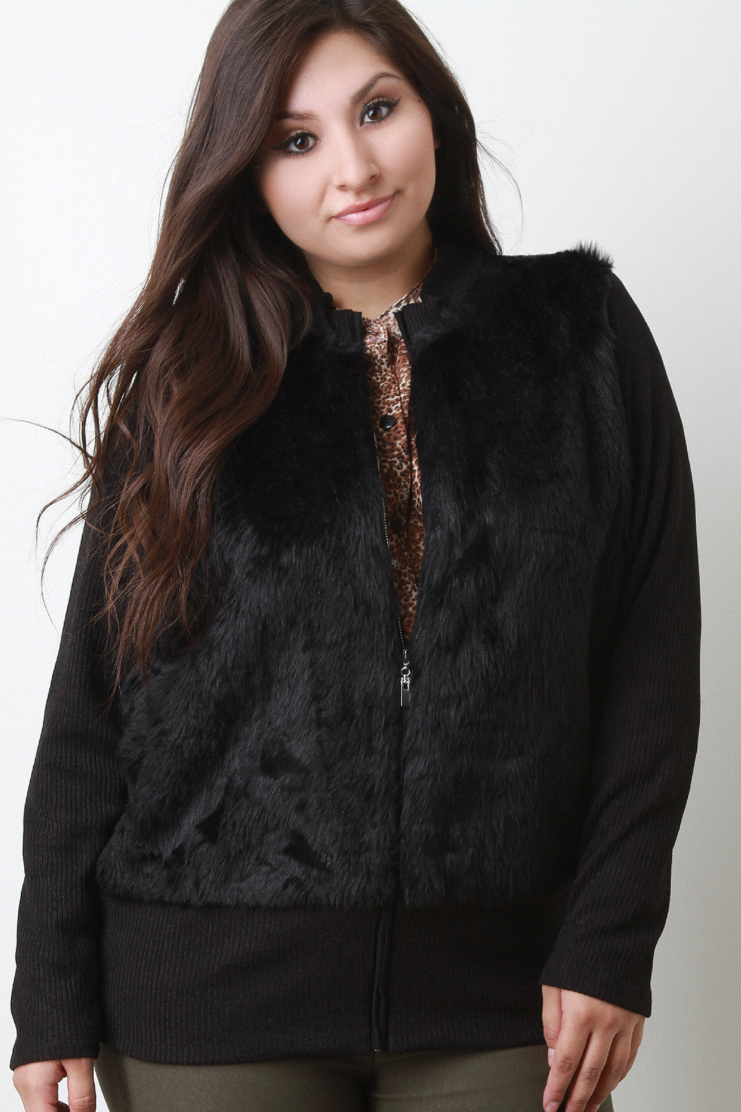 A plus size mock neck faux fur at the front of the bodice, ribbed knit back and long sleeves, and a zip-up front. Finished with a long, fitted hem. Accessories sold separately. 100% Polyester.