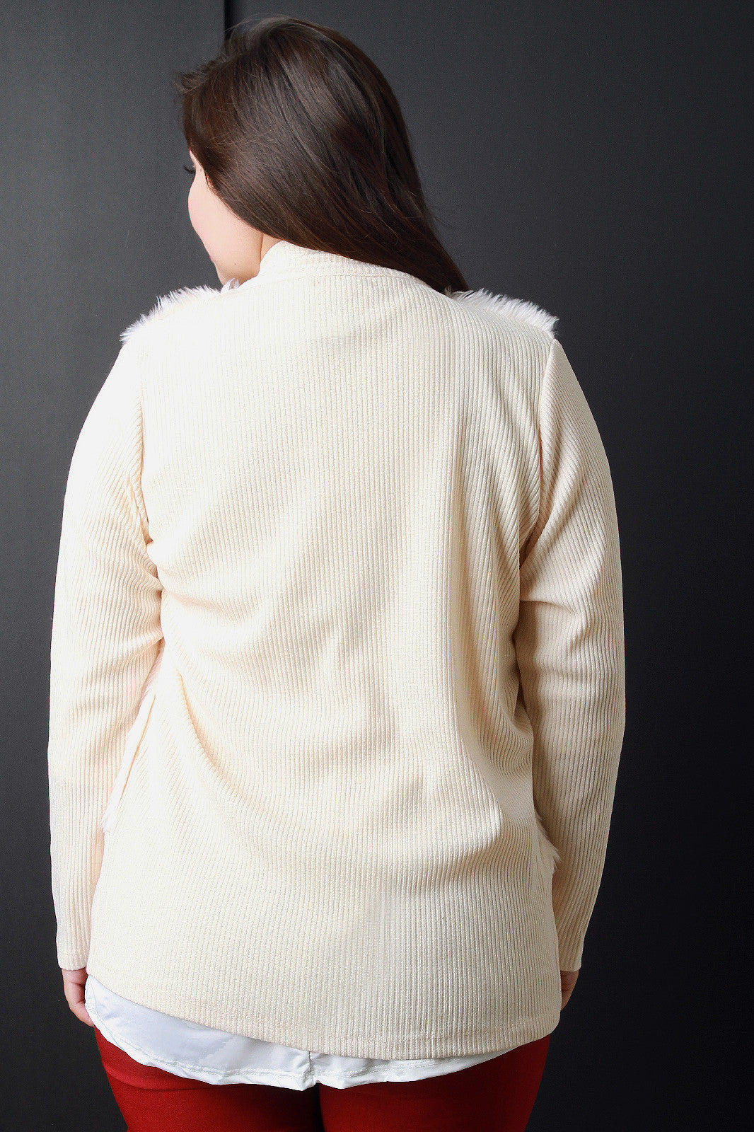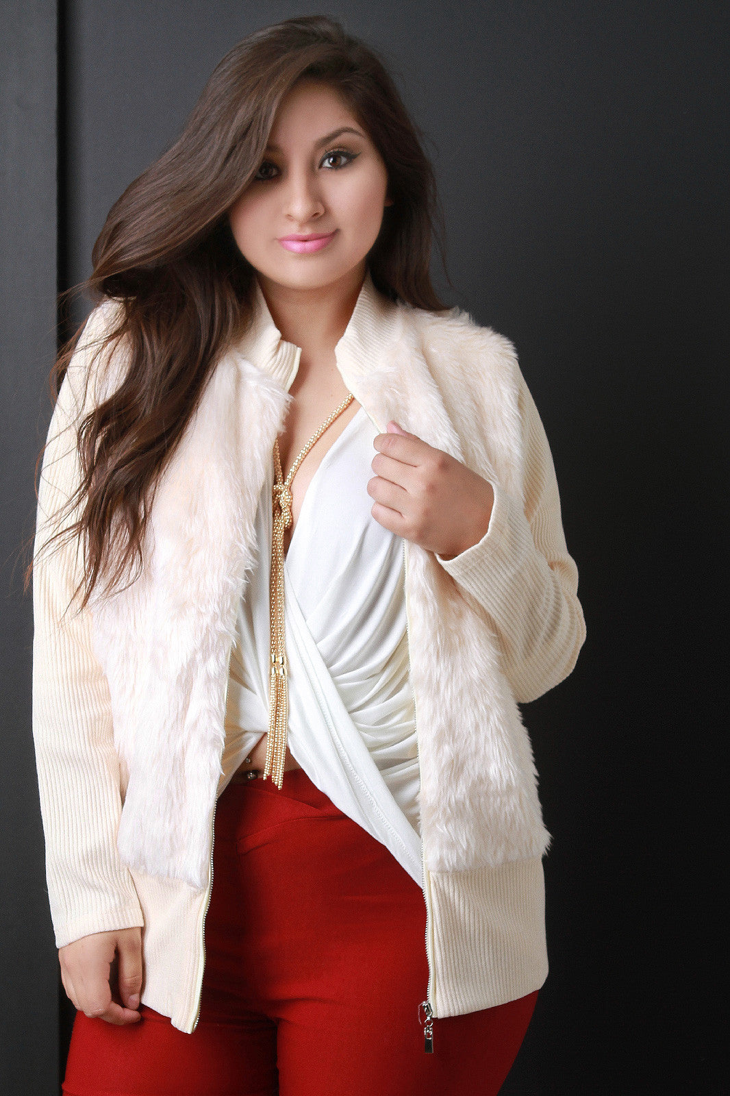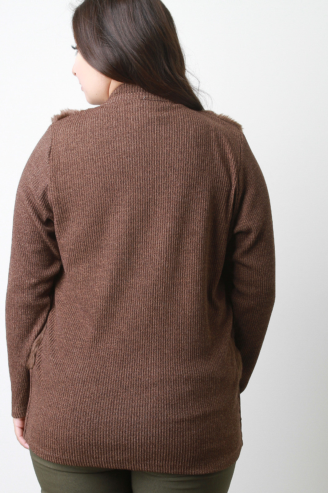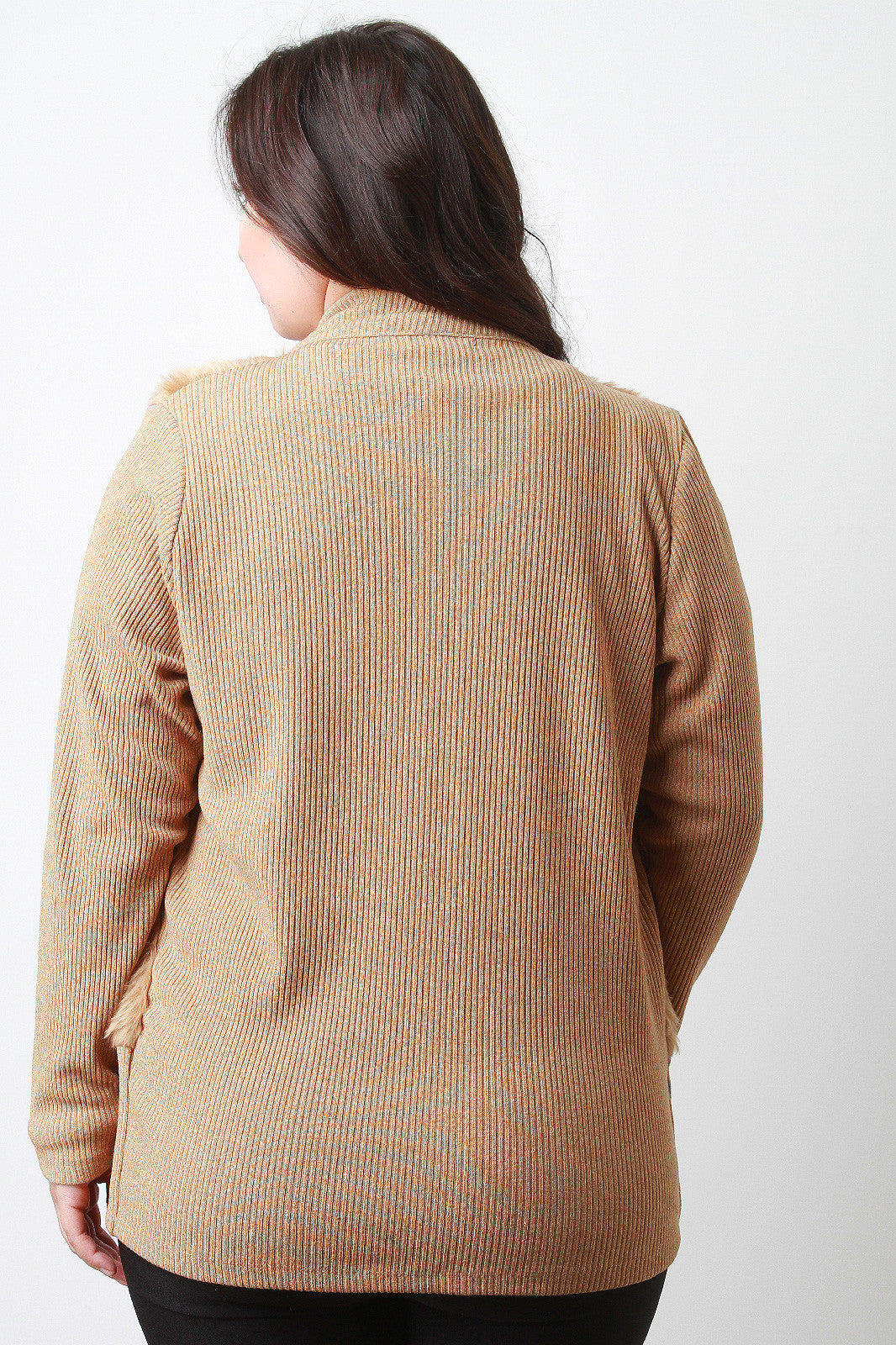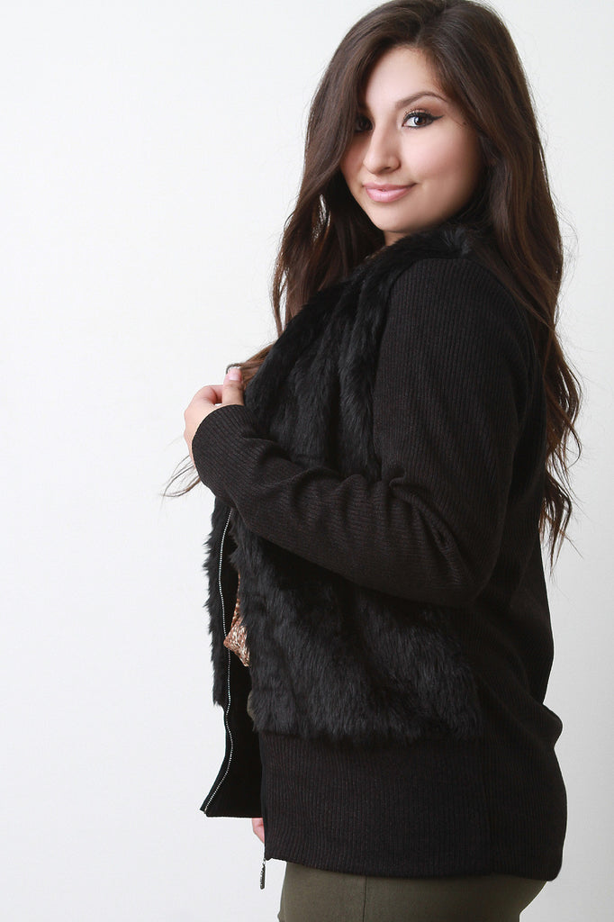 A plus size mock neck faux fur at the front of the bodice, ribbed knit back and long sleeves, and a zip-up front. Finished with a long, fitted hem. Accessories sold separately. 100% Polyester.