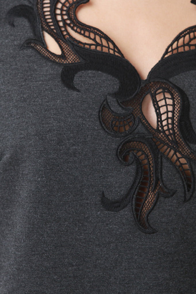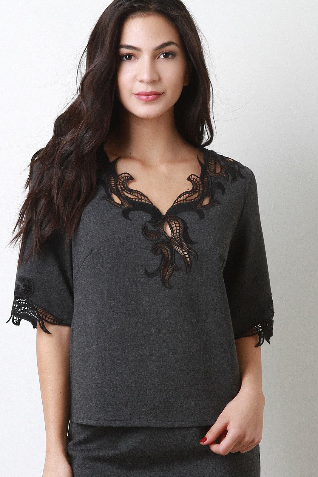 An elegant top featuring smooth fabric, an embroidered v-neckline with cutouts, and half sleeves with accented hems. Finished with a boxy relaxed fit and back zipper closure. Accessories sold separately. 63% Rayon, 32% Nylon, 5% Spandex.