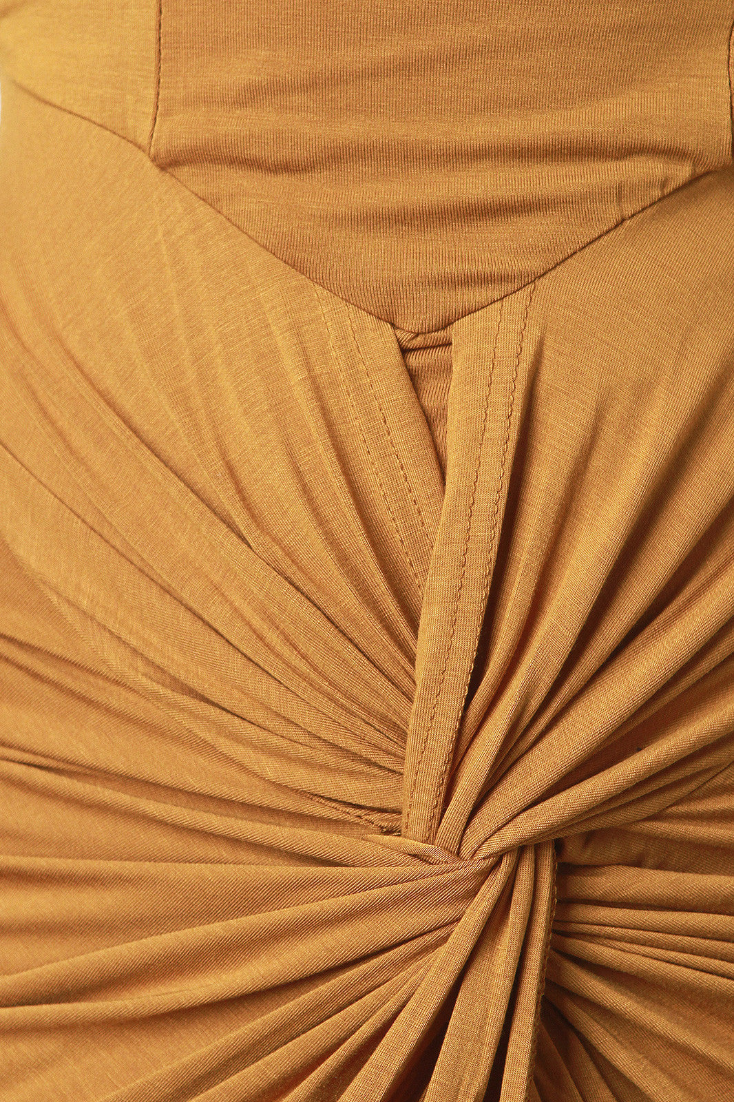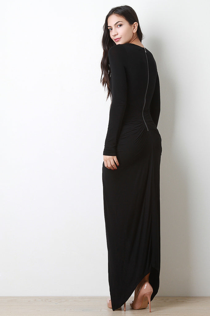 This long sleeve dress features a round neckline, vertical princess seam, high waisted cinched seam, mini skirt design with an asymmetrical high low knotted twisted front overlay, and zipper fastener at back. Accessories sold separately. 95% Rayon, 5% Spandex.