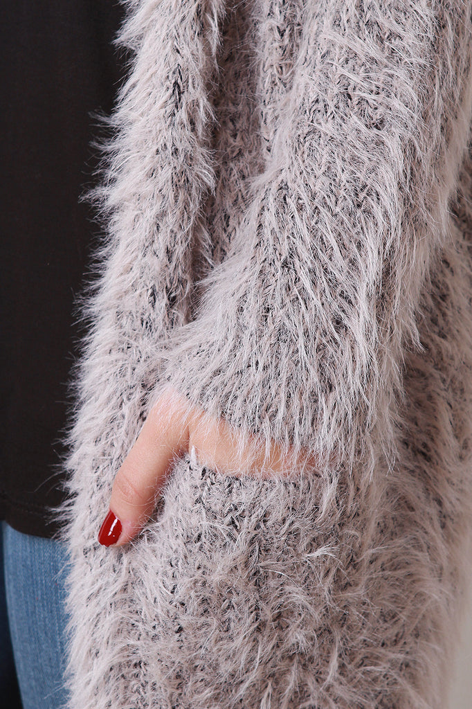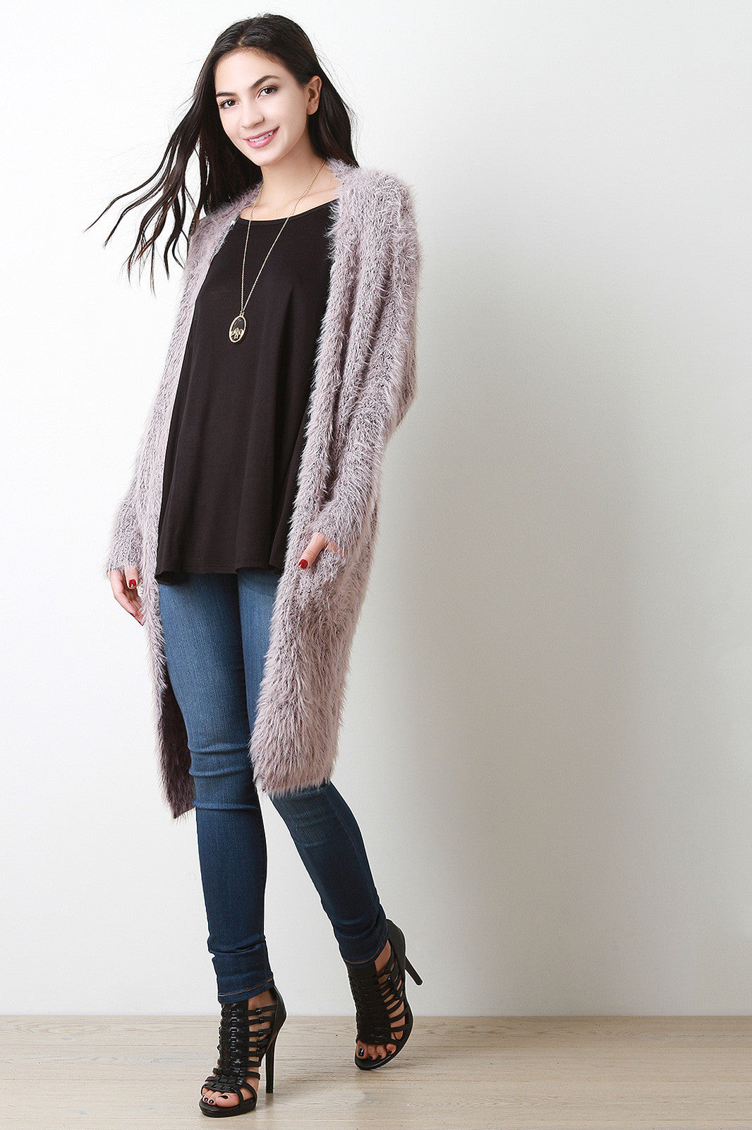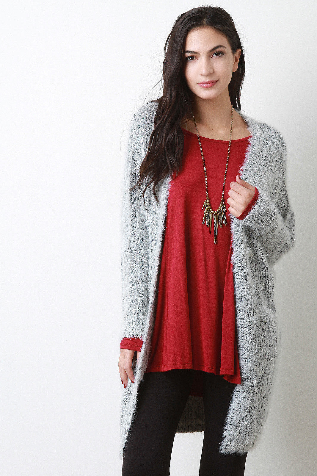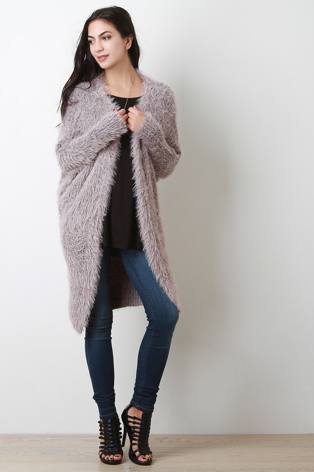 This cardigan features a longline construction, furry marled knit, open front, long dolman sleeves, and side pockets. Accessories sold separately. 89% Acrylic, 11% Wool.