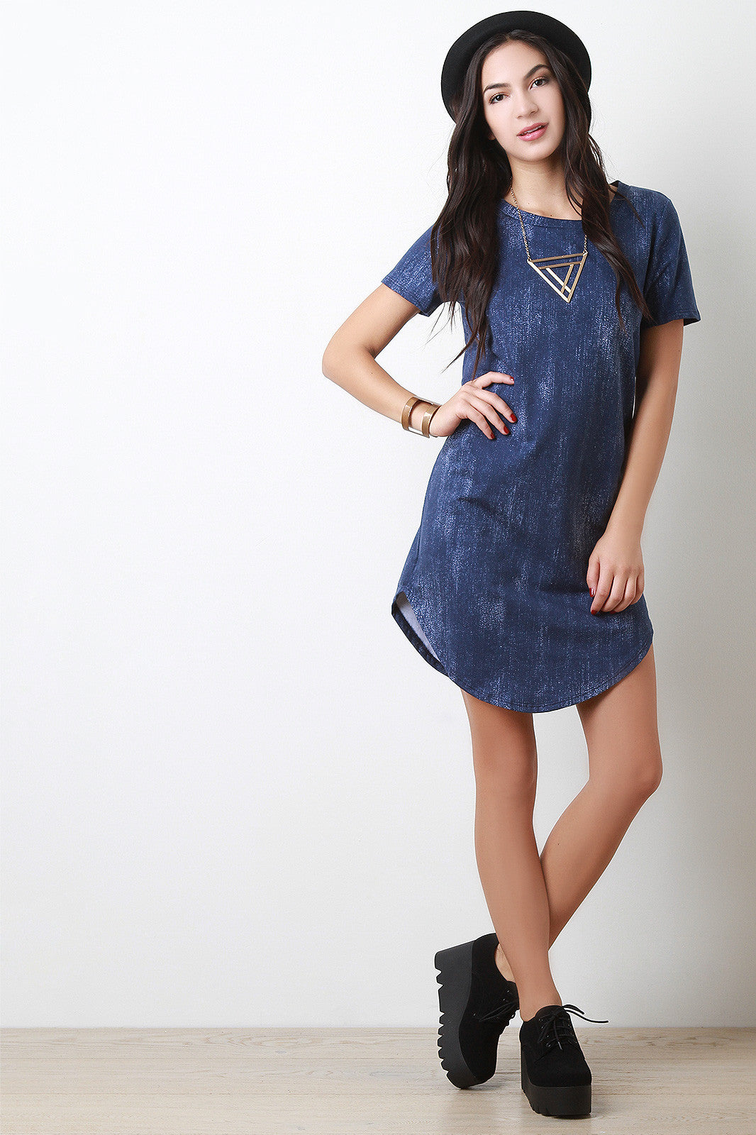 This denim -look fabric, round neckline, and short sleeves. Finished with a rounded hemline and side slits. Accessories sold separately. Made in U.S.A. 95% Cotton, 5% Spandex.