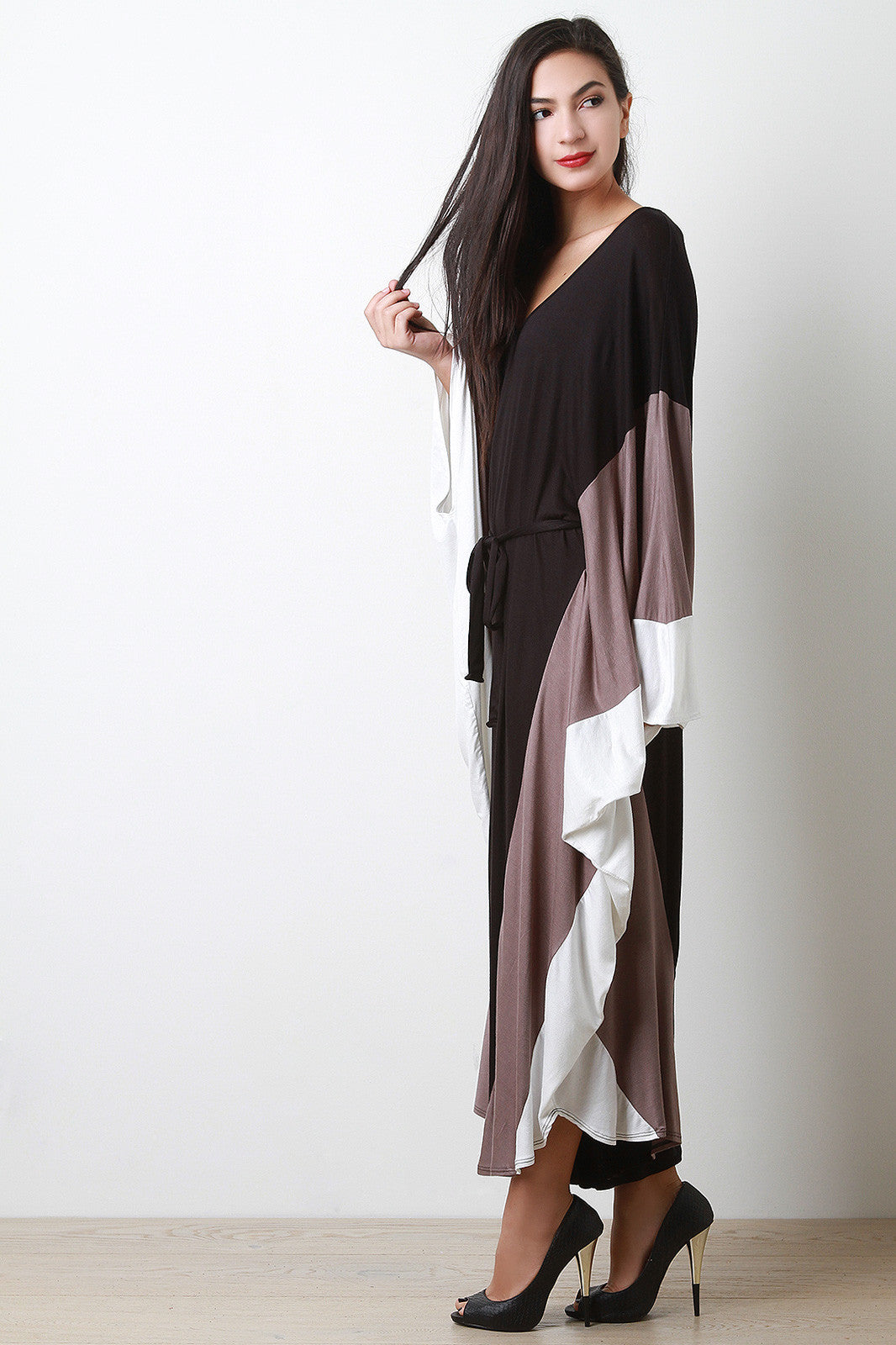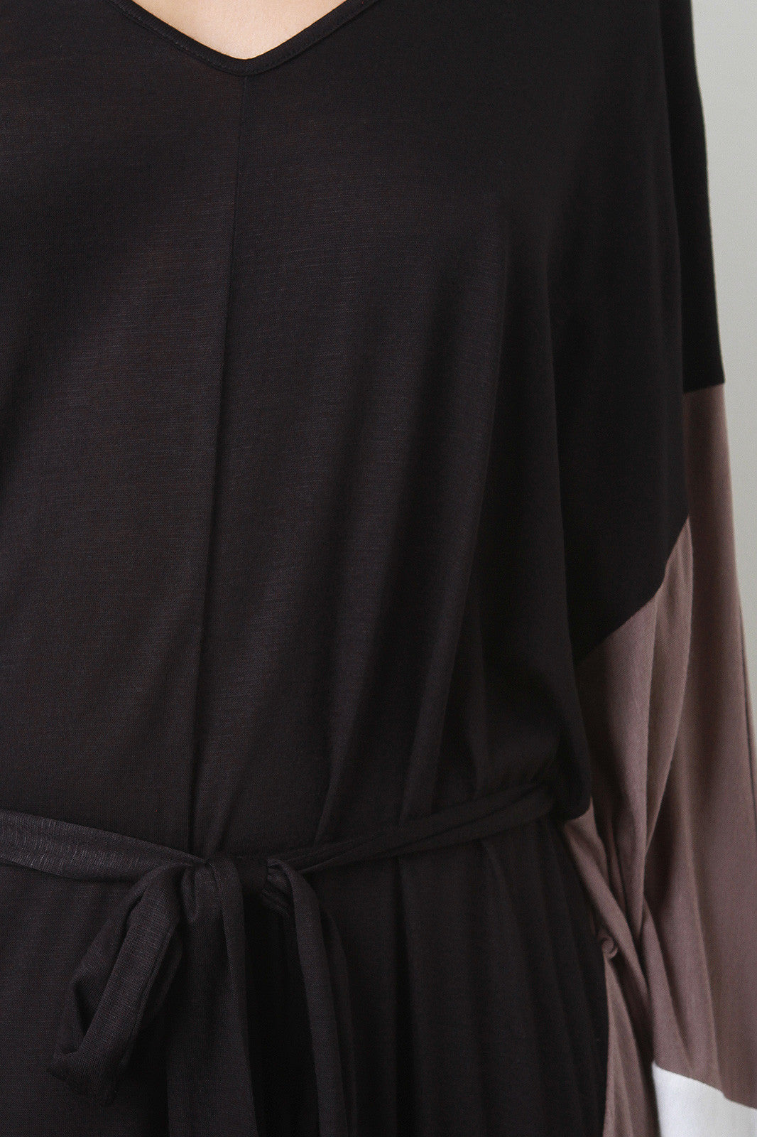 This relaxed fit jumpsuit features color block jersey knit, wide v-neckline, long wide sleeves, wide pant legs, back keyhole cutout with self-tie drawstring, and finished with self-tie sash at waist. Accessories sold separately. Made in U.S.A. 95% Rayon, 5% Spandex.