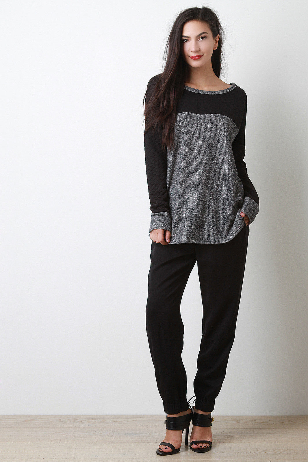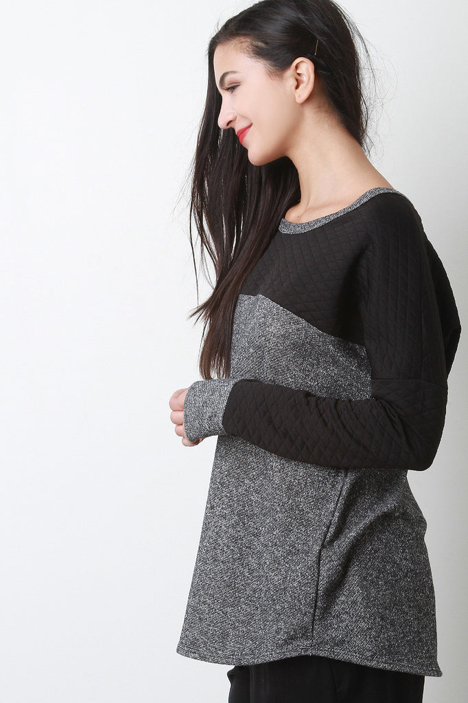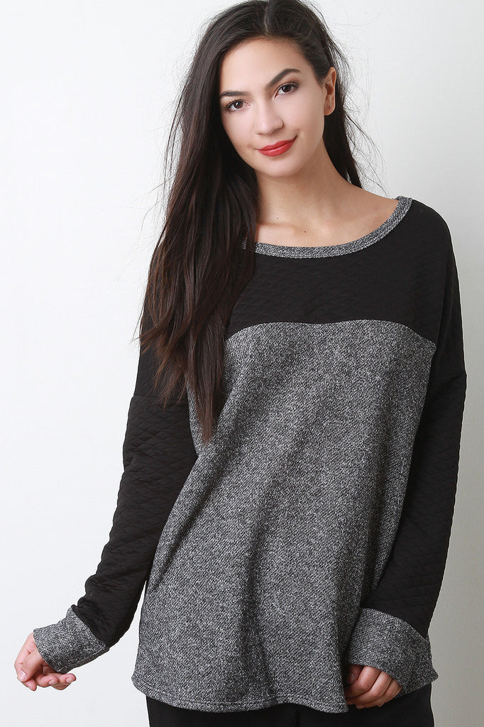 This comfy top features melange knit, contrast solid quilted knit, round neckline, dropped shoulders, and long sleeves. Accessories sold separately. Made in U.S.A. Self: 60% Polyester, 40% Cotton. Contrast: 95% Polyester, 5% Spandex.