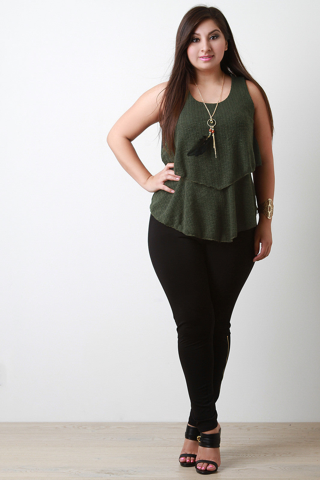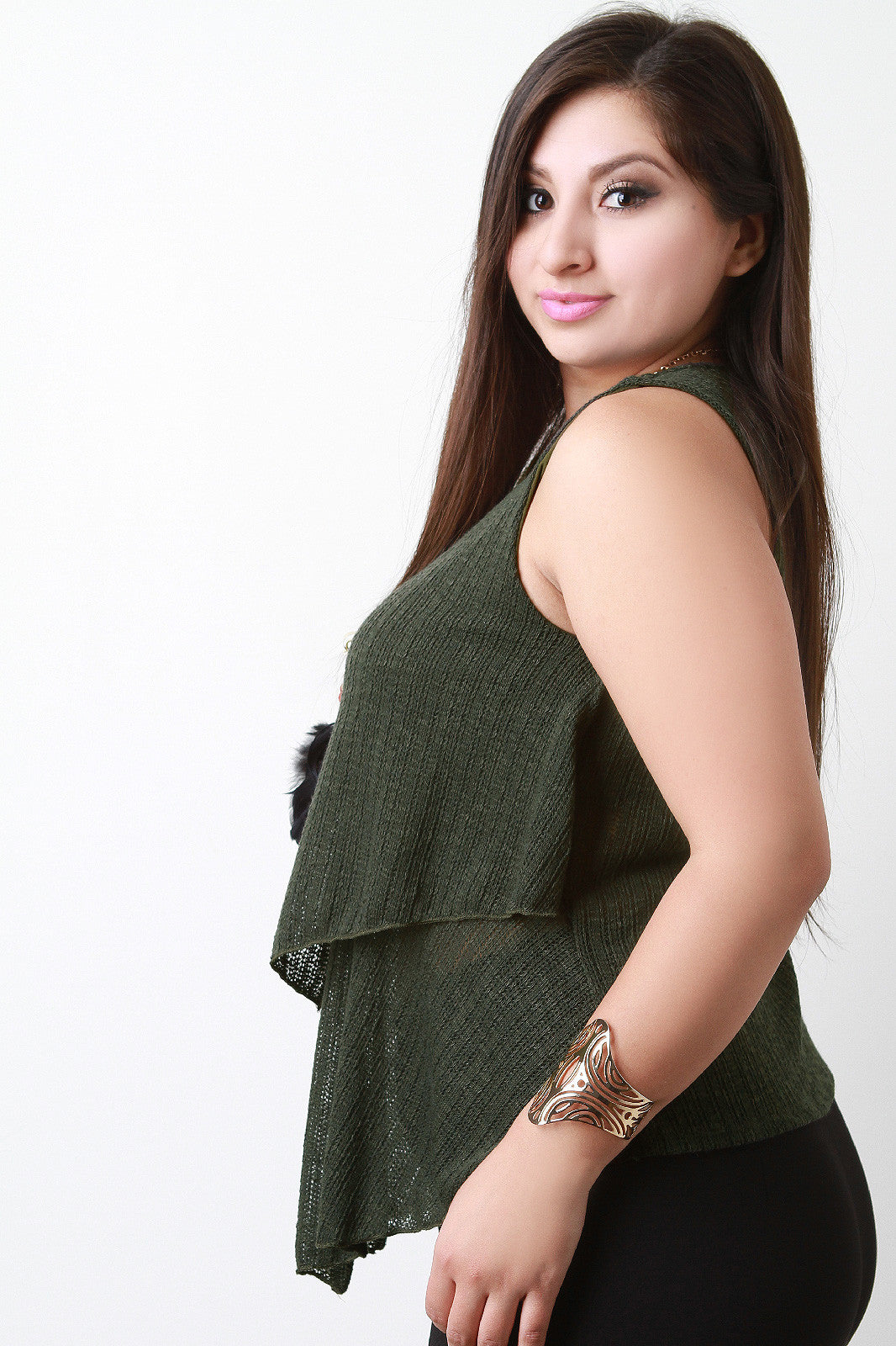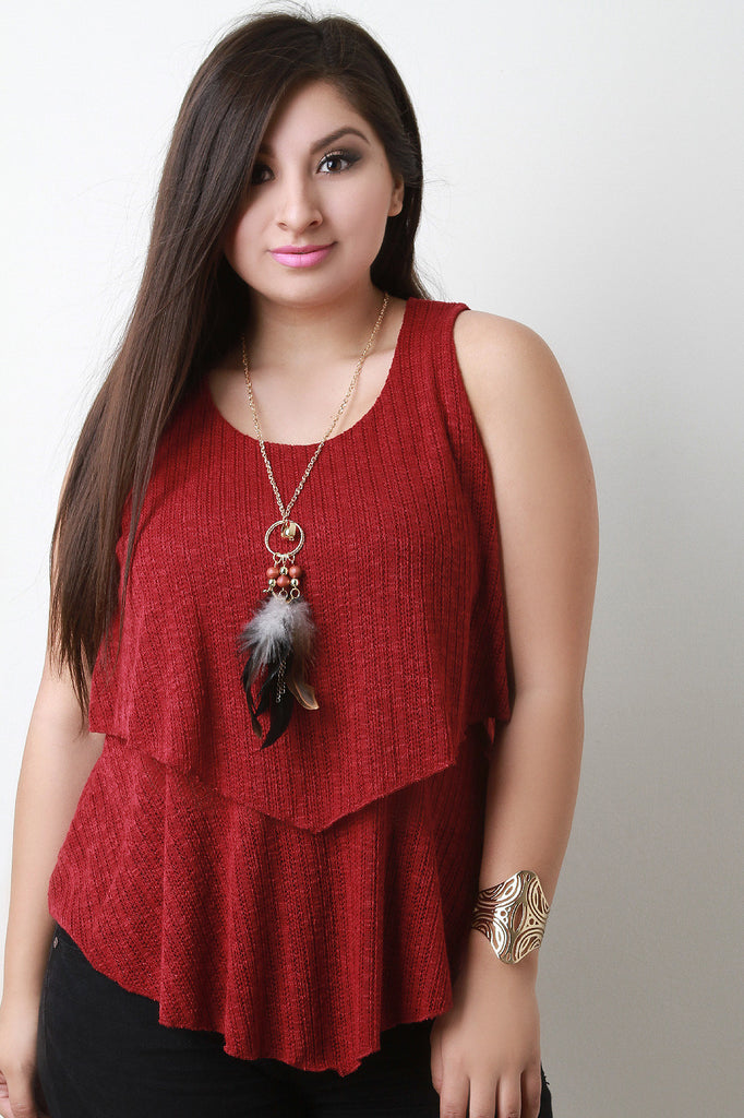 A plus size sleeveless top featuring semi-sheer loose knit, a round neckline, and a tiered ruffled design with pointed front. Finished with a straight back hem and includes a glossy long necklace with wooden beads and feathers. Other accessories sold separately. 73% Polyester, 24% Rayon, 3% Spandex.