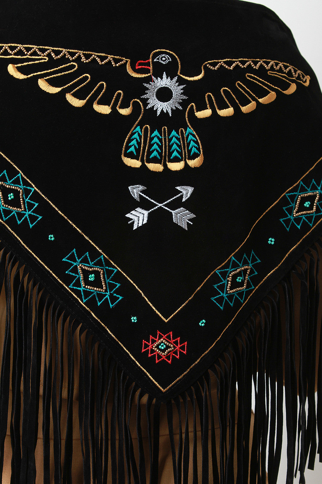 A tribal triangular fringe trim. Wear it over your shoulders or wrap it like a scarf, there's plenty of ways to wear this versatile item!